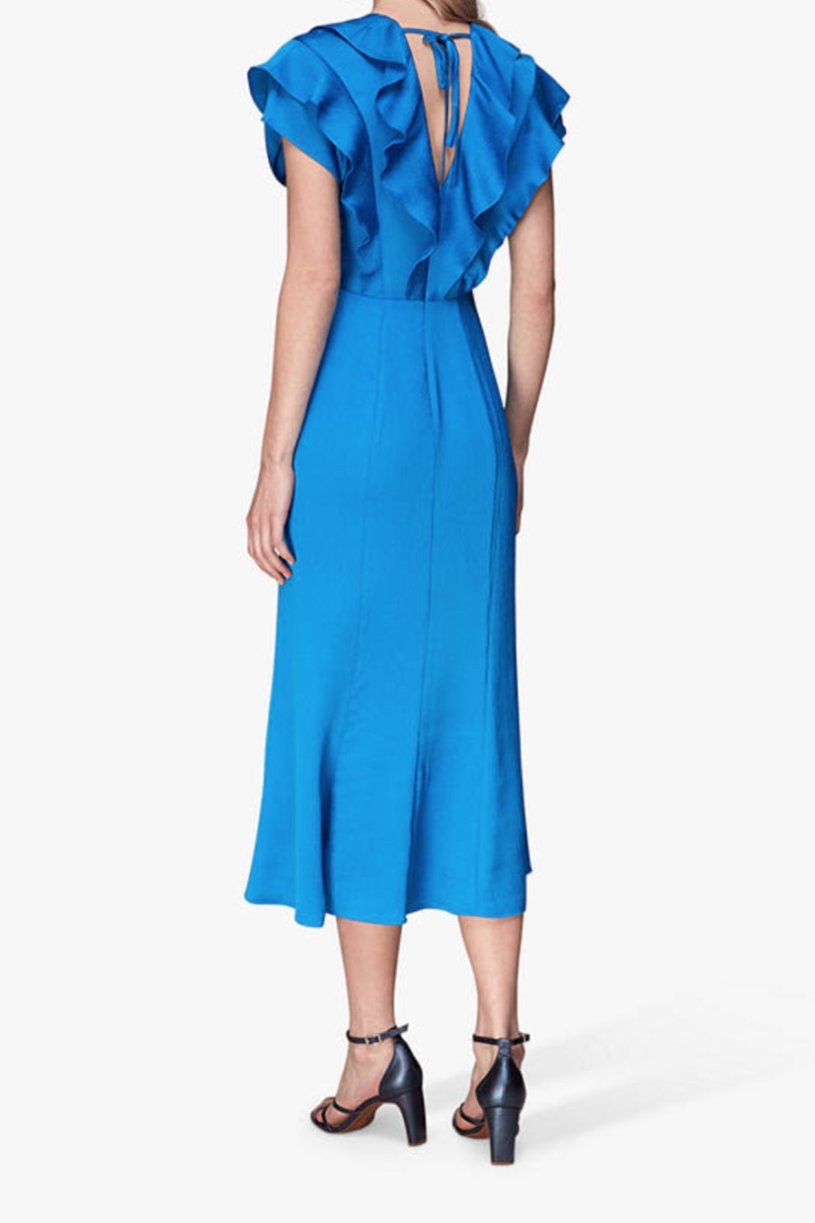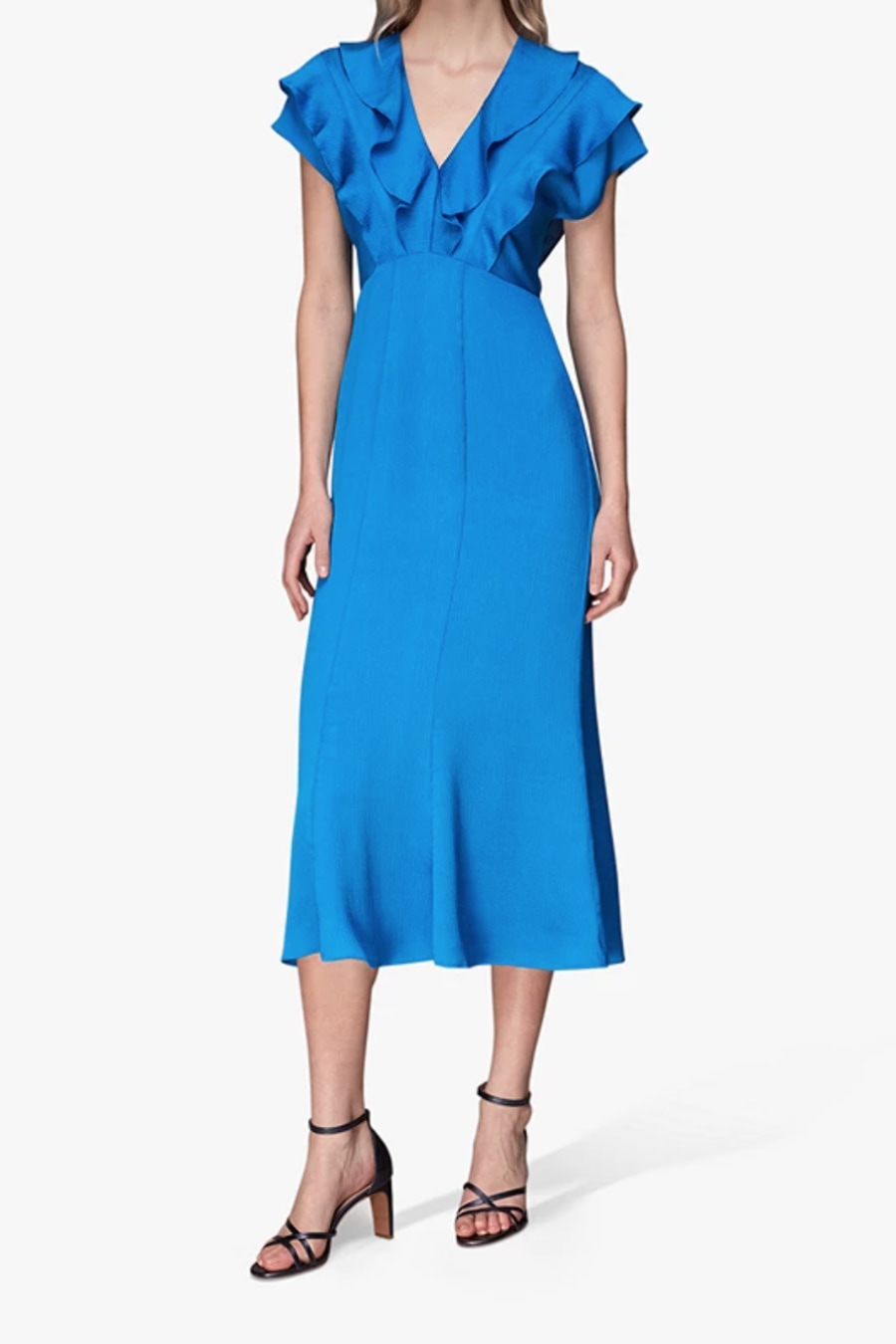 The Adeline midi dress is sleek and opulent – the perfect style for special occasions. Designed in a rich blue shade, we love its fluid silhouette and flouncy ruffle detailing. A pair of strappy heels and high-shine gold jewellery will make the perfect finishing touches.