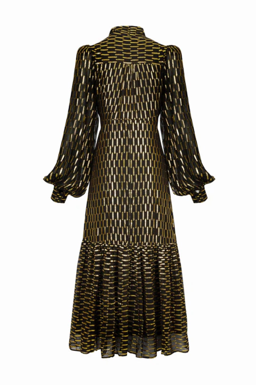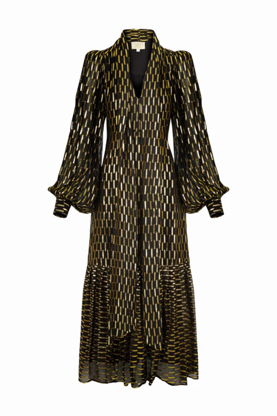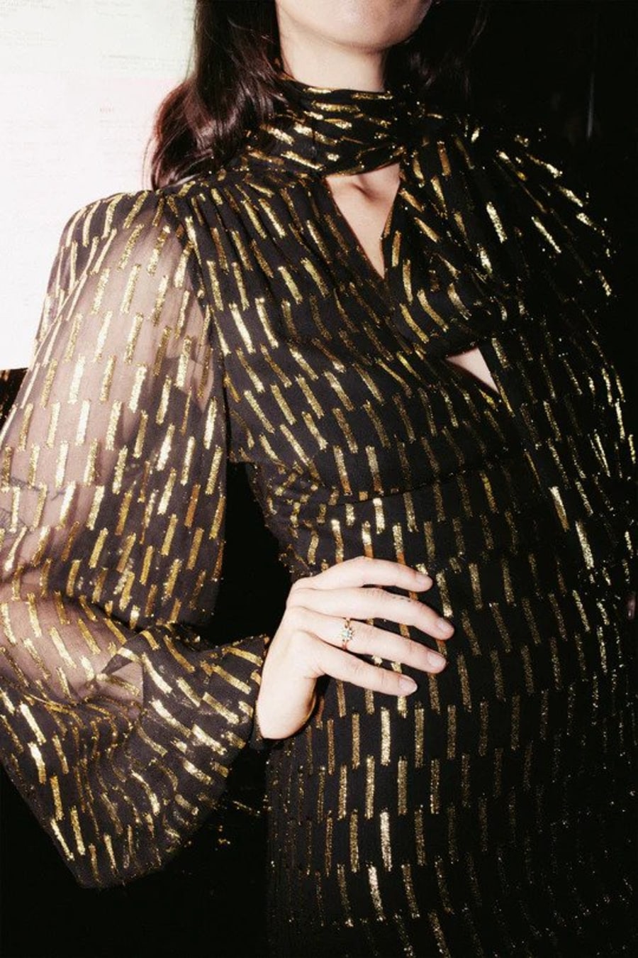 A shimmering showstopper in stunning black and gold, Alabama brings back our best selling and most flattering silhouette, suiting all body types. Metallic flecks of gold throughout, with billowing sleeves and dandy ties create the perfect sense of 70s glamour.