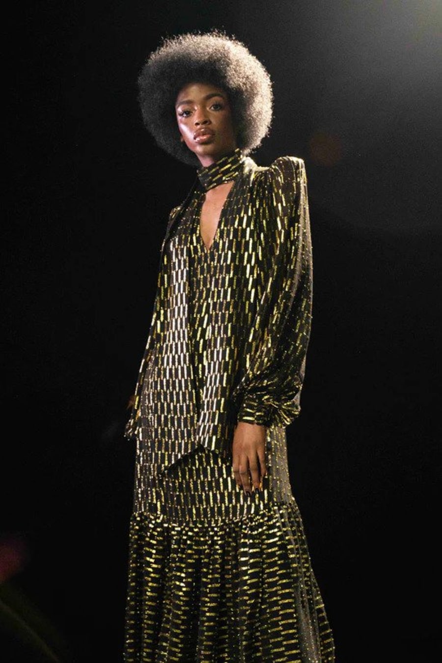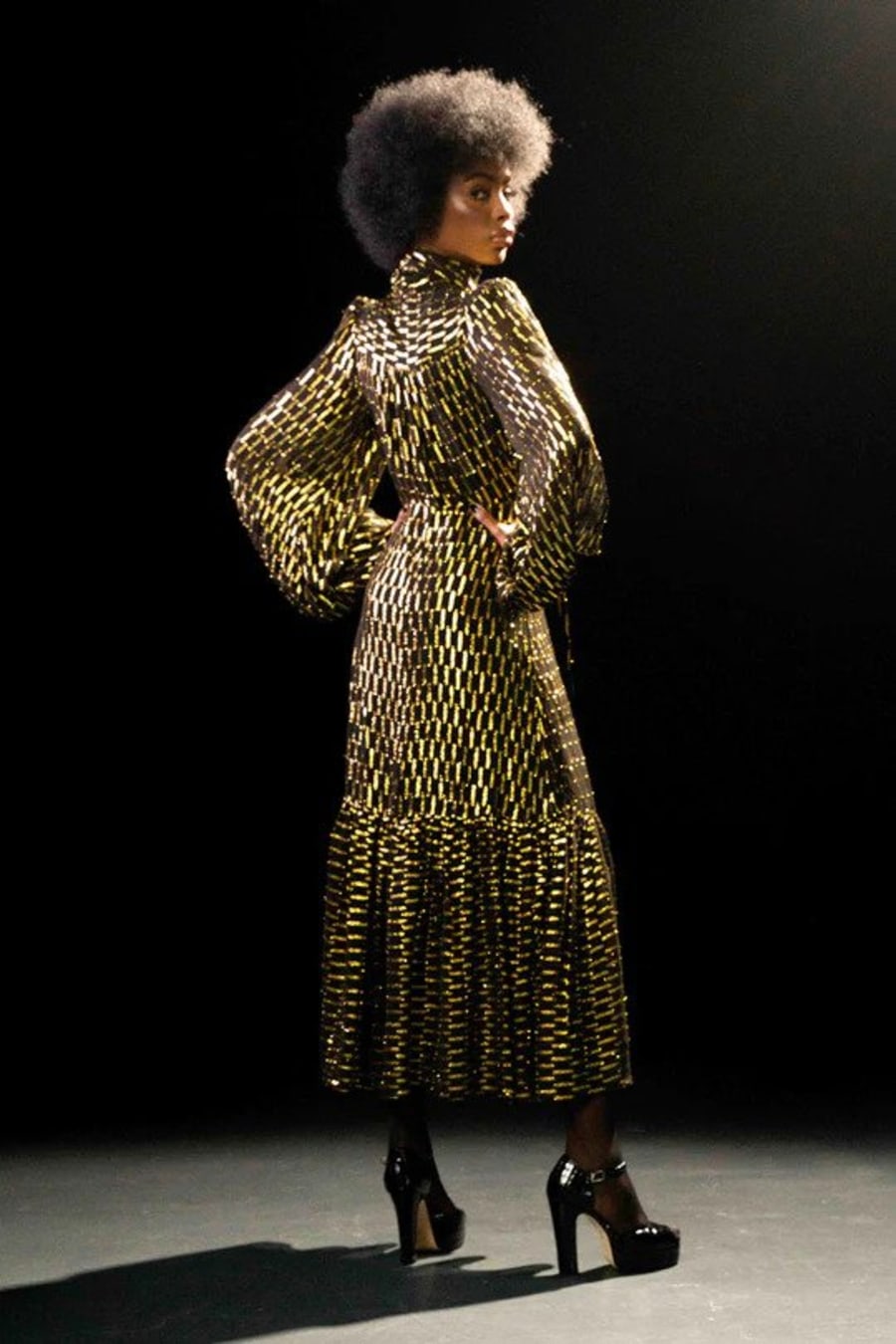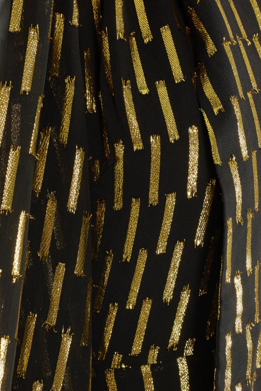 A shimmering showstopper in stunning black and gold, Alabama brings back our best selling and most flattering silhouette, suiting all body types. Metallic flecks of gold throughout, with billowing sleeves and dandy ties create the perfect sense of 70s glamour.