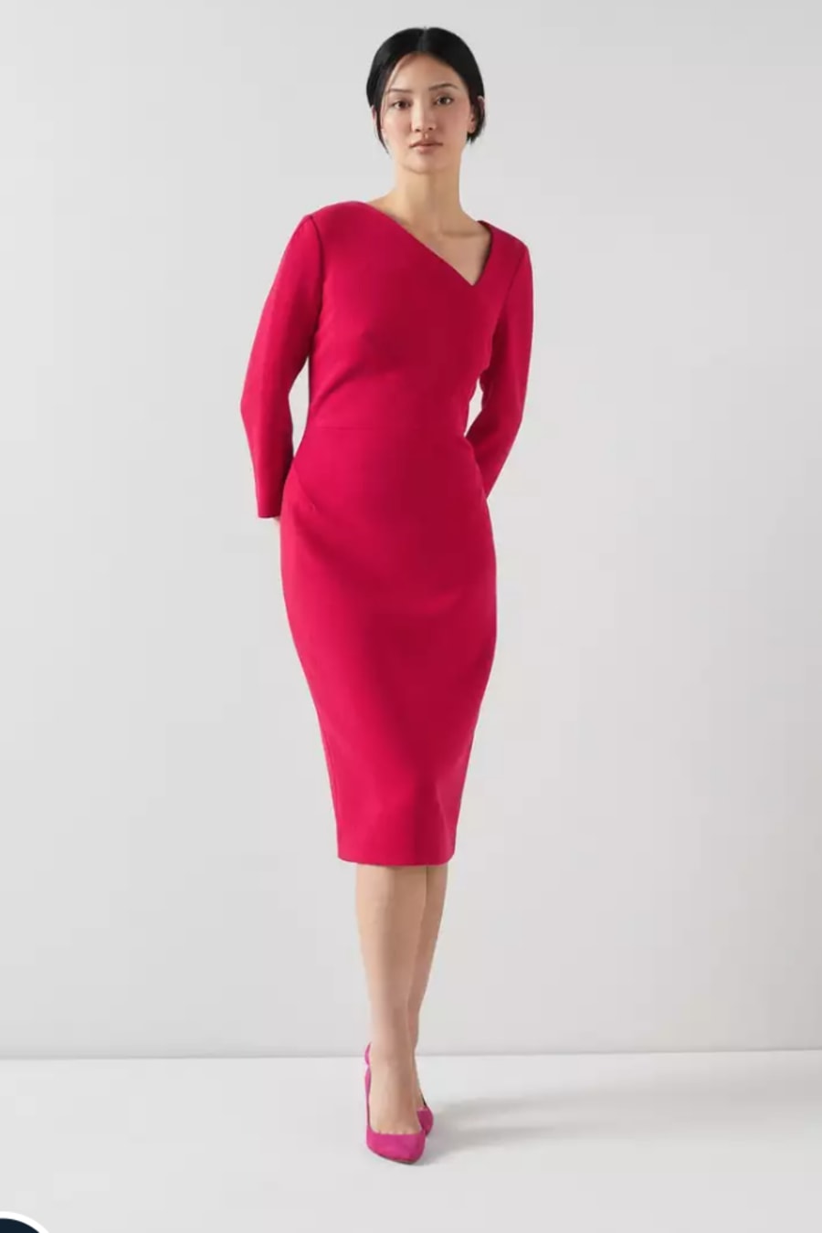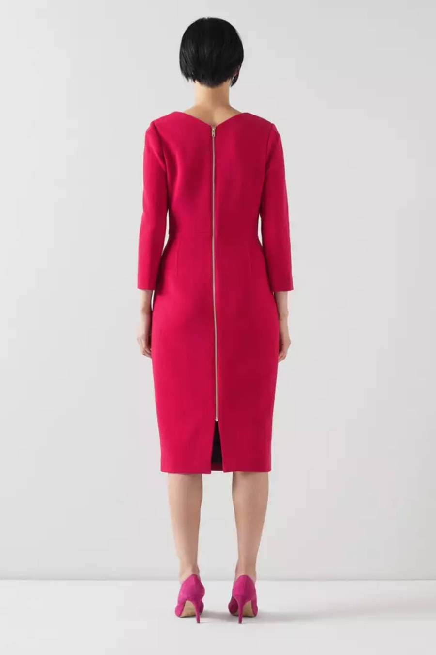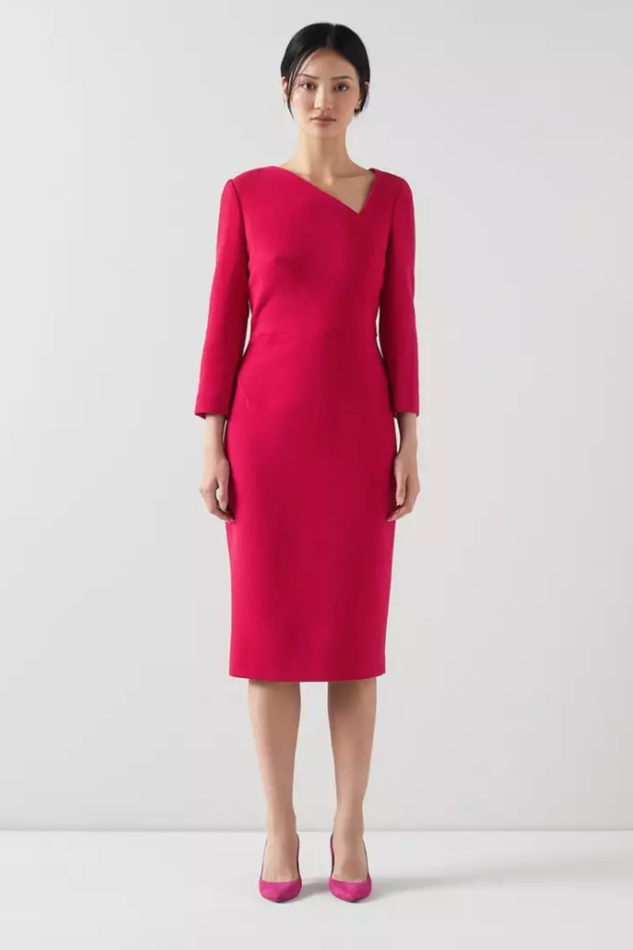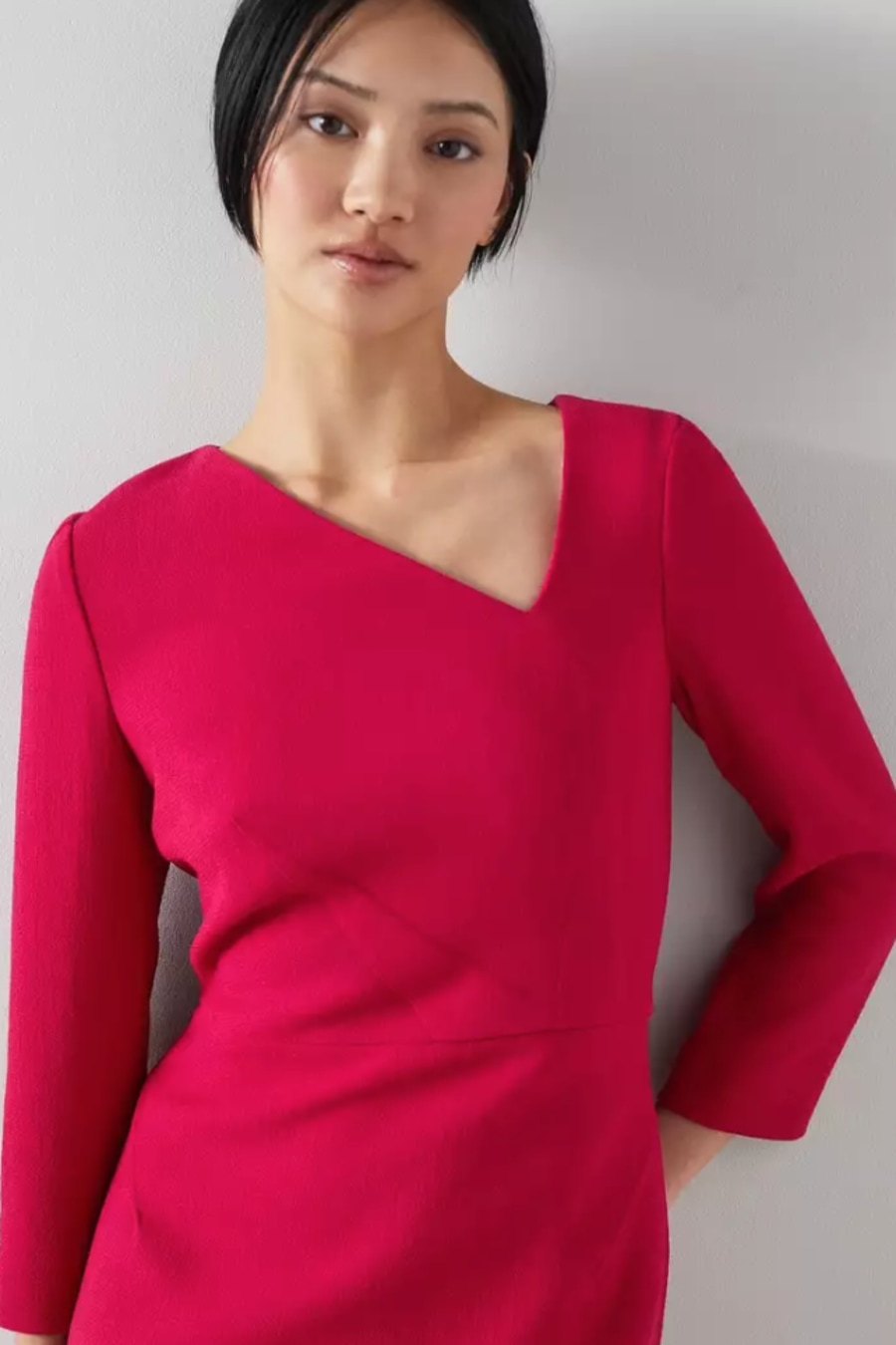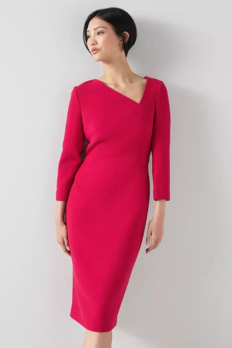 A beautiful new dress in our latest collection, the Alexis has sustainable credentials, as it's made using surplus fabric which may have ended up in landfill. Using it for Alexis helps avoid waste and creates something long-lasting from this luxurious, leftover fabric. Crafted in Europe from 100% wool crepe in crimson red, it has an asymmetric neckline, darting detail, long sleeves, a fitted, knee-length shift shape and an exposed zip to the back. Wear it with classic LKB courts.