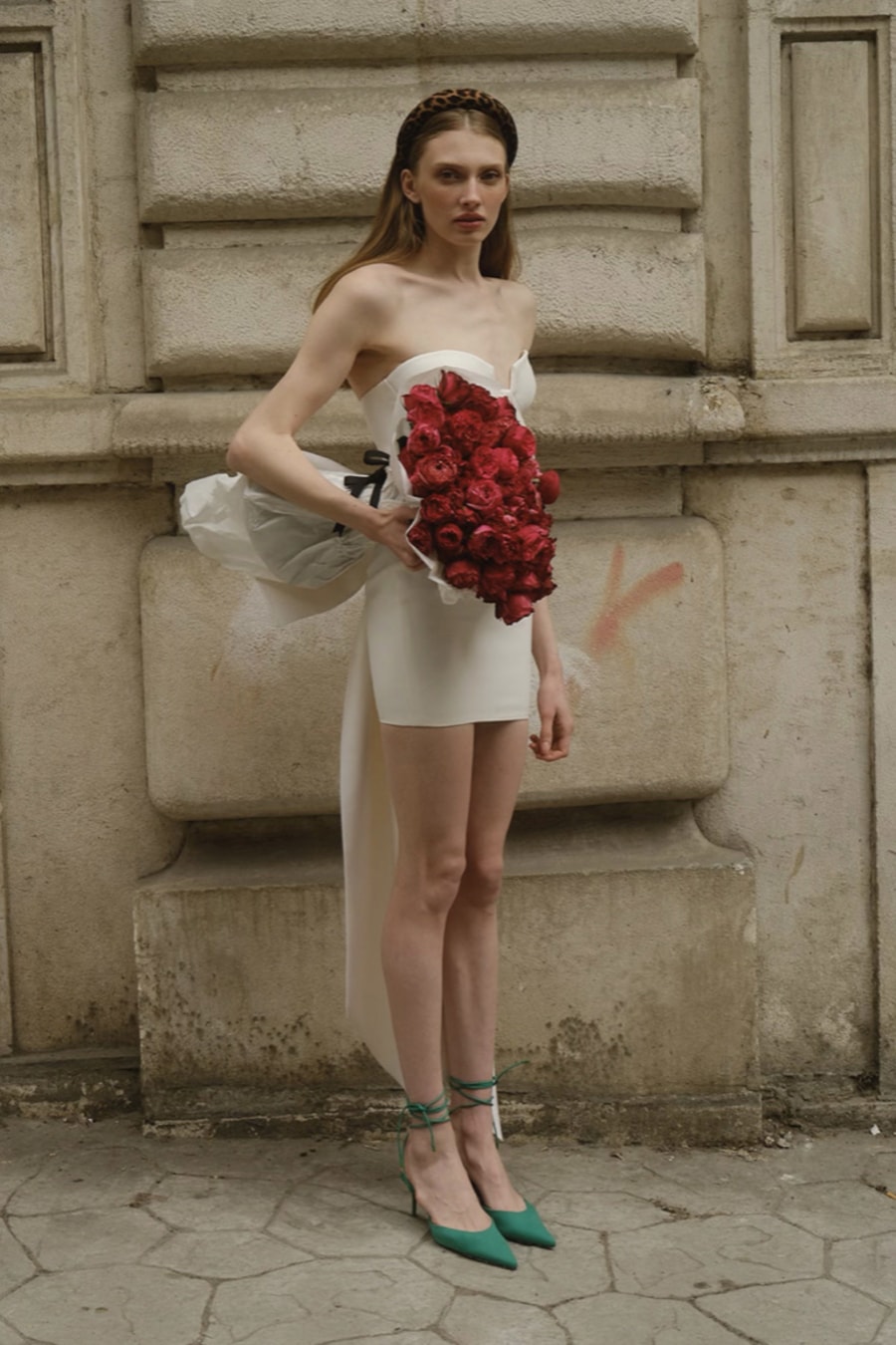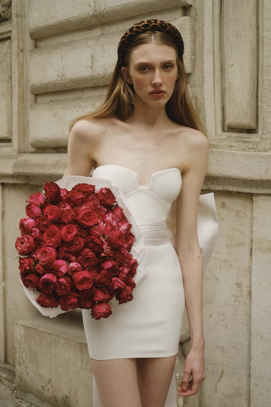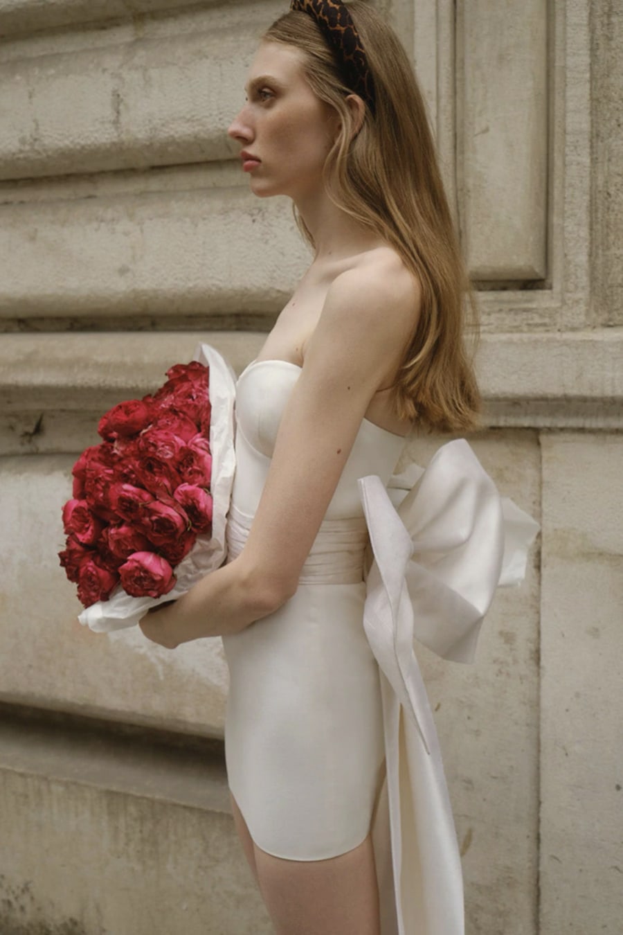 Designed with a form that will make you feel absolutely flawless, you will be exuding an innocent yet flirty attitude with the huge silk ribbon detail of “Alix in Temple White”. Later on in the night, everyone will be trying to catch a glimpse of that silk bow tie.