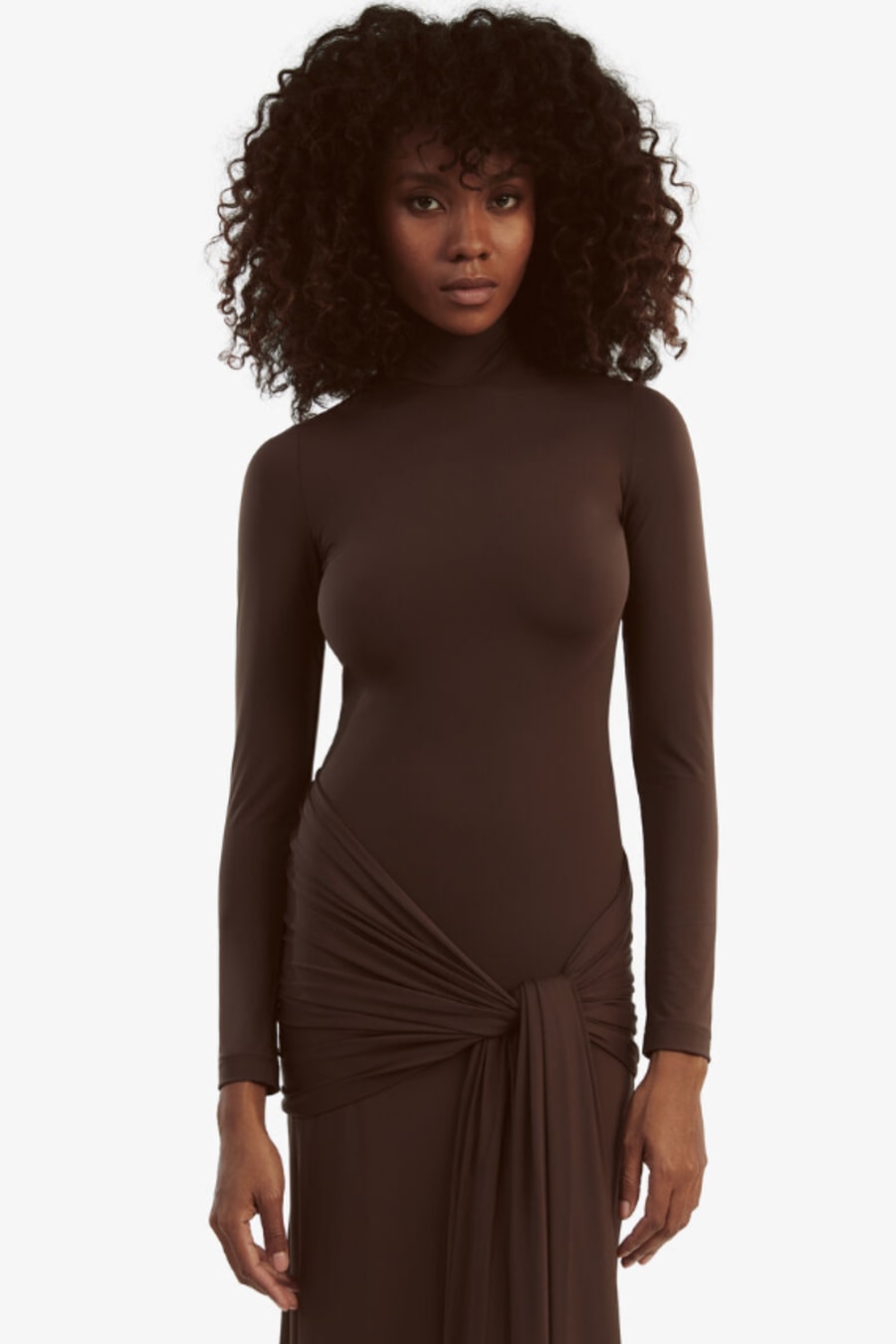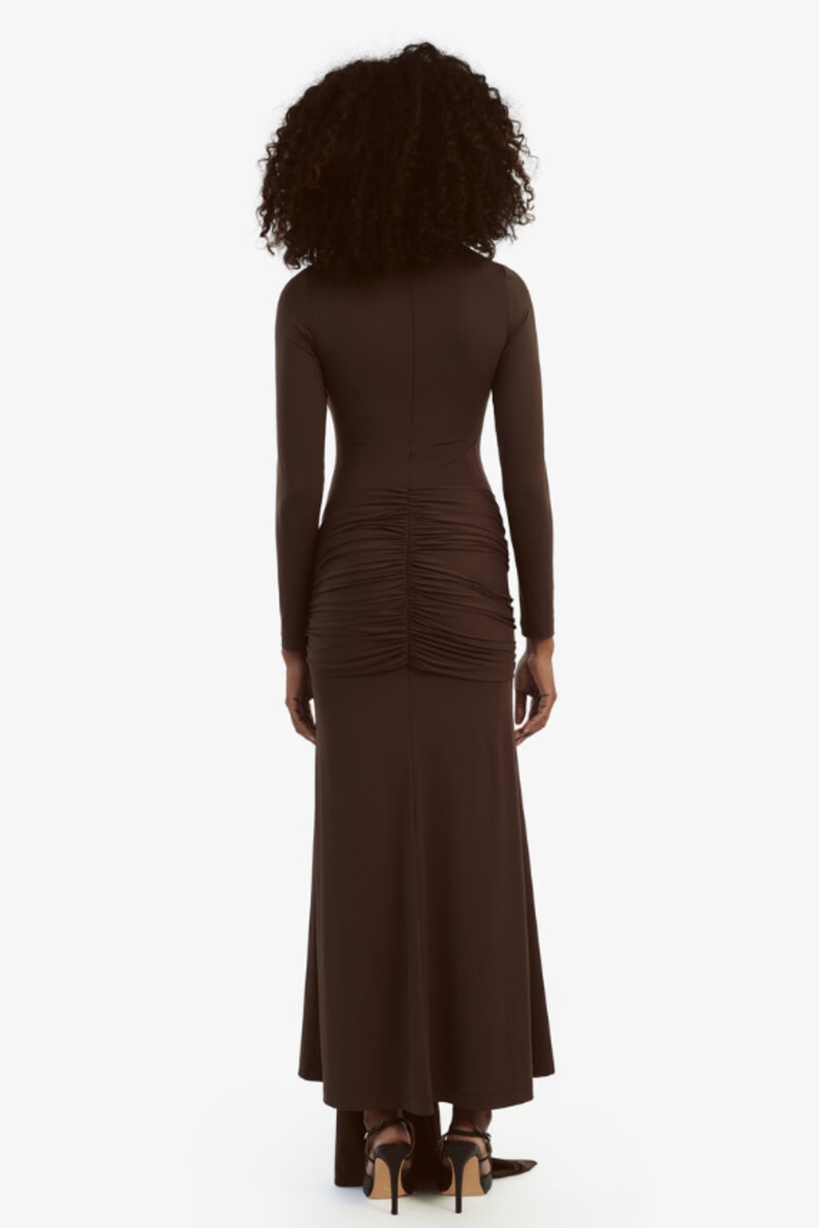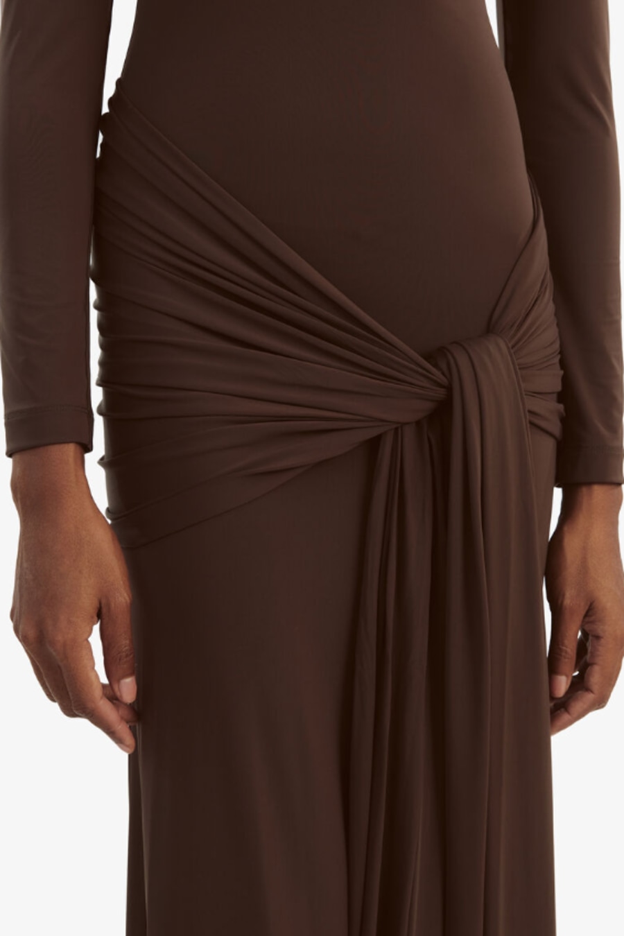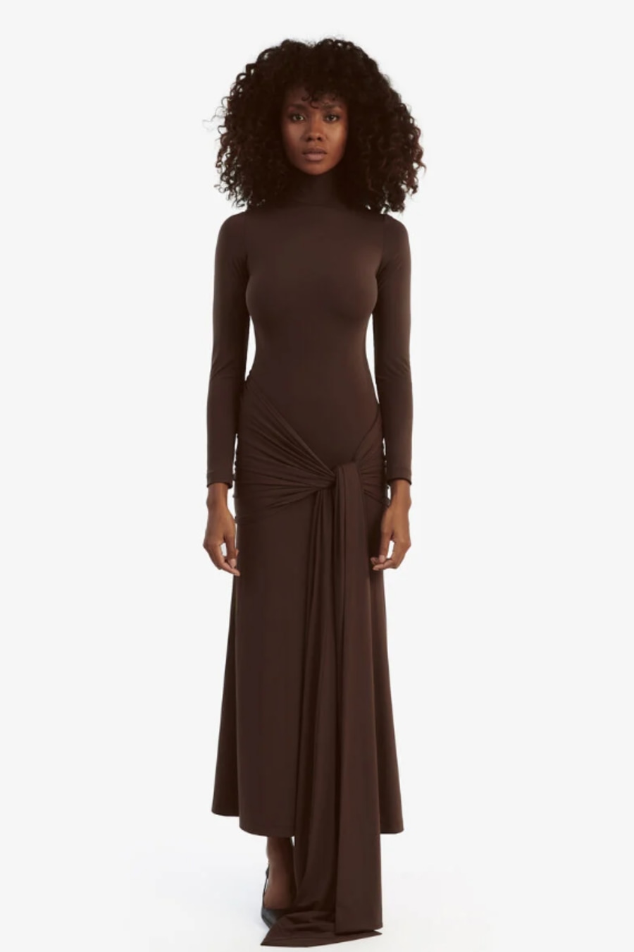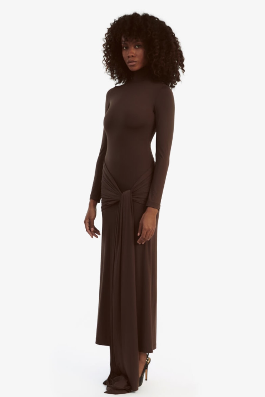 Make your move. The Alix Maxi Tie Front Dress features a slinky knit maxi design perfect for standout occasions. It fits to the bodice with a functional tie front skirt, long sleeves, relaxed skirt and a high neckline.