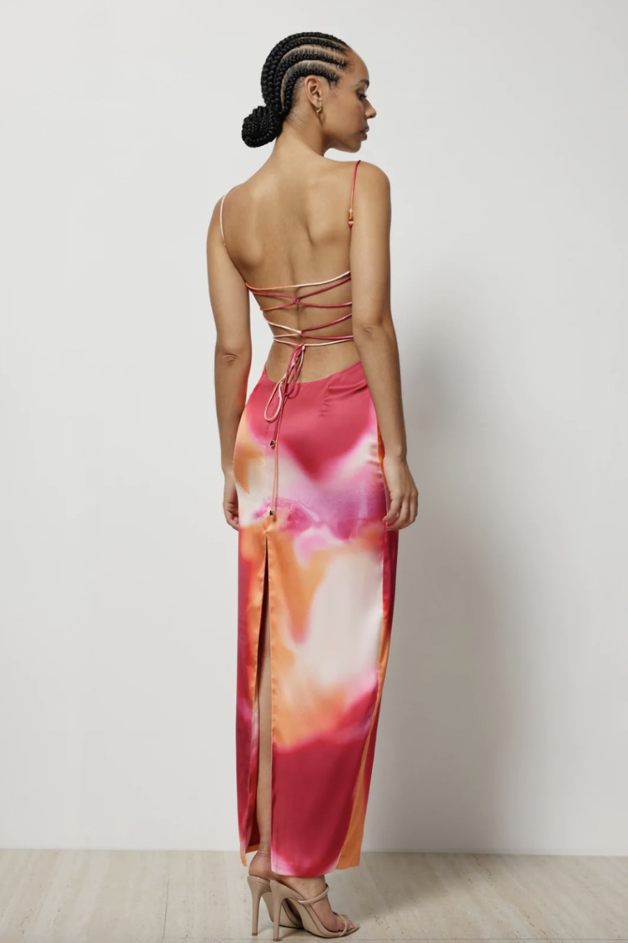 The Aquarius Dress features a straight across neckline with thin spaghetti straps and lace up back. Crafted from a luxe satin, the liquify print is the perfect stand out dress, showcasing beautiful hot pink and orange tones. It is fastened at the center back with an invisible zip, and includes a back split for movement.