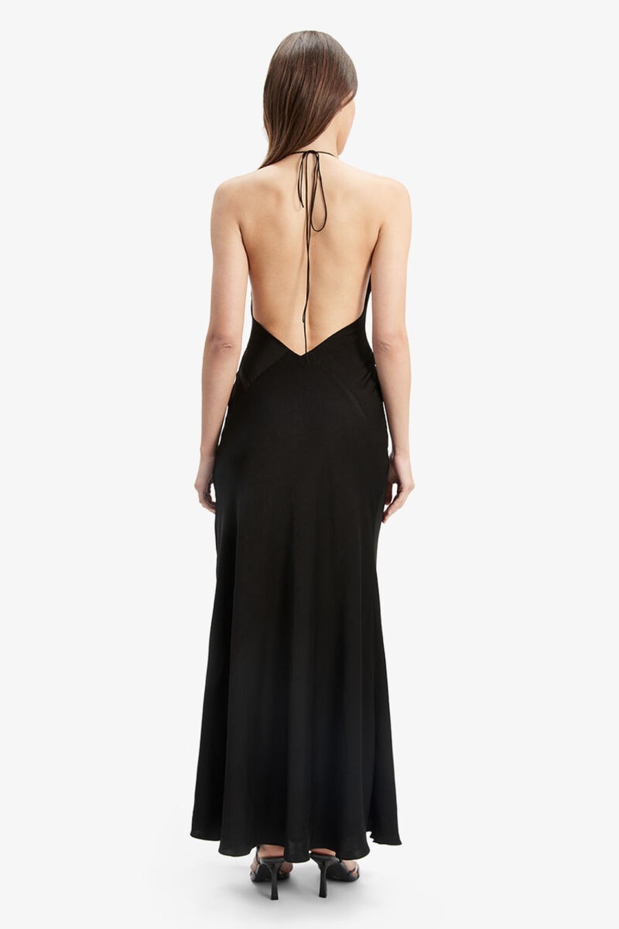 Worth making plans for. The Aradia Halter Dress has a sophisticated silhouette with a classic halterneck design and a long flowing skirt. The dress is dramatised with a plunging neckline, low back, fabric flower at the bust, and a sensual front split. Crafted in classic black, this is a provocative yet elevated look for every event in your calendar.