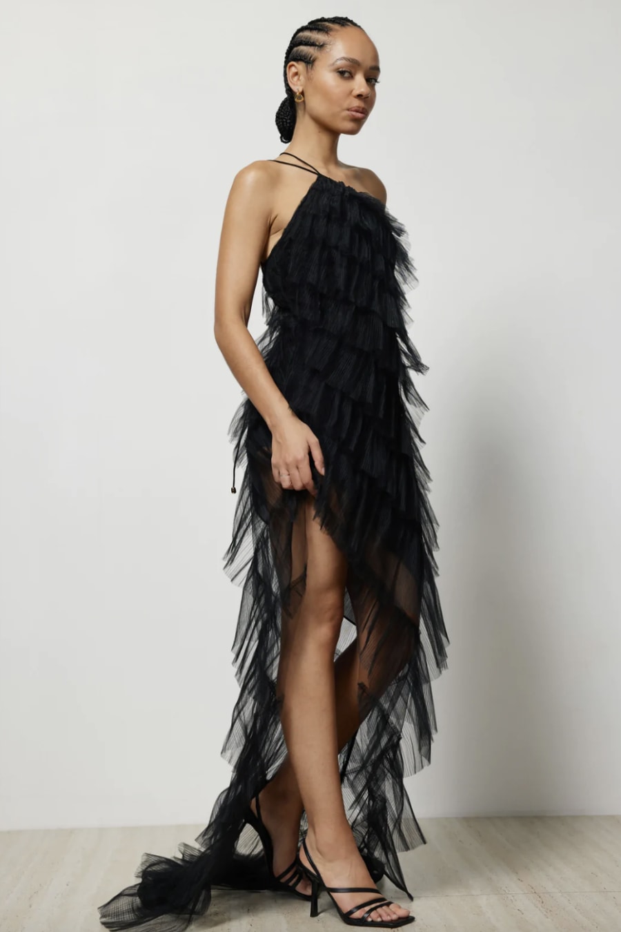 The Astra Dress is crafted from layers of tulle that have been gathered and pleated creating the ultimate statement gown. The asymmetrical hemline of the skirt features a puddle train and exposes the right leg for a sexy, dramatic look. The dress showcases the exposed back, with delicate spaghetti straps finished with gold toggles.