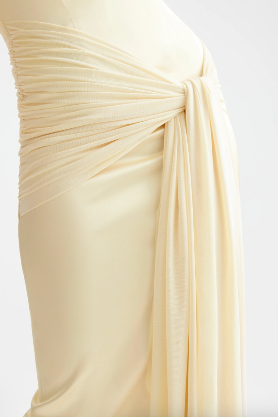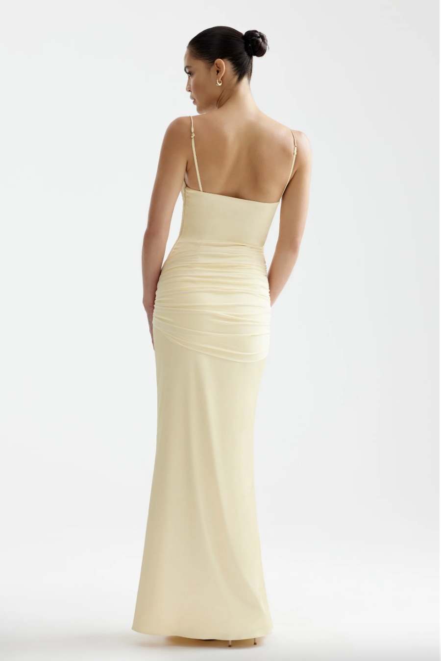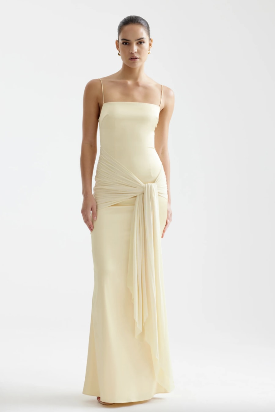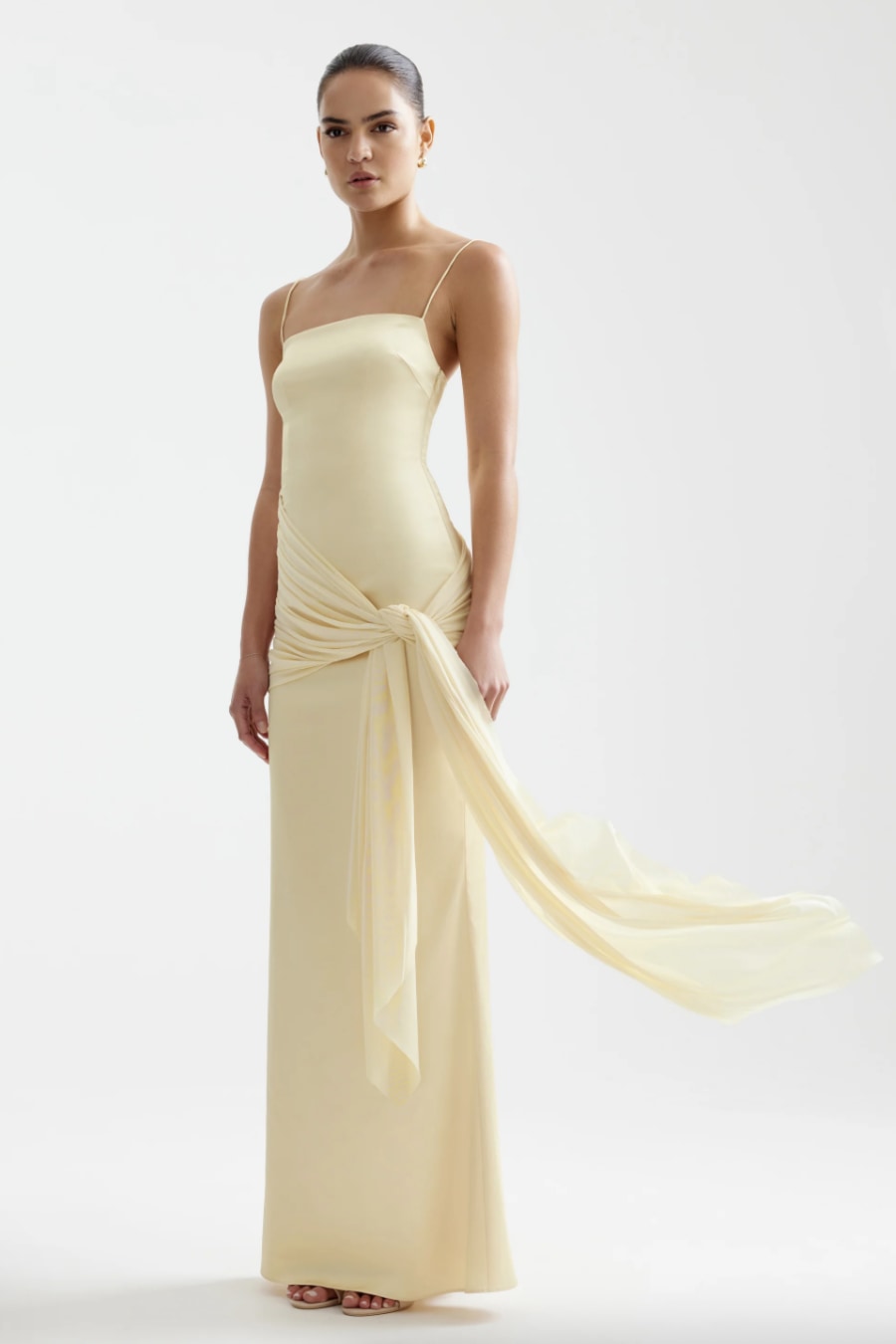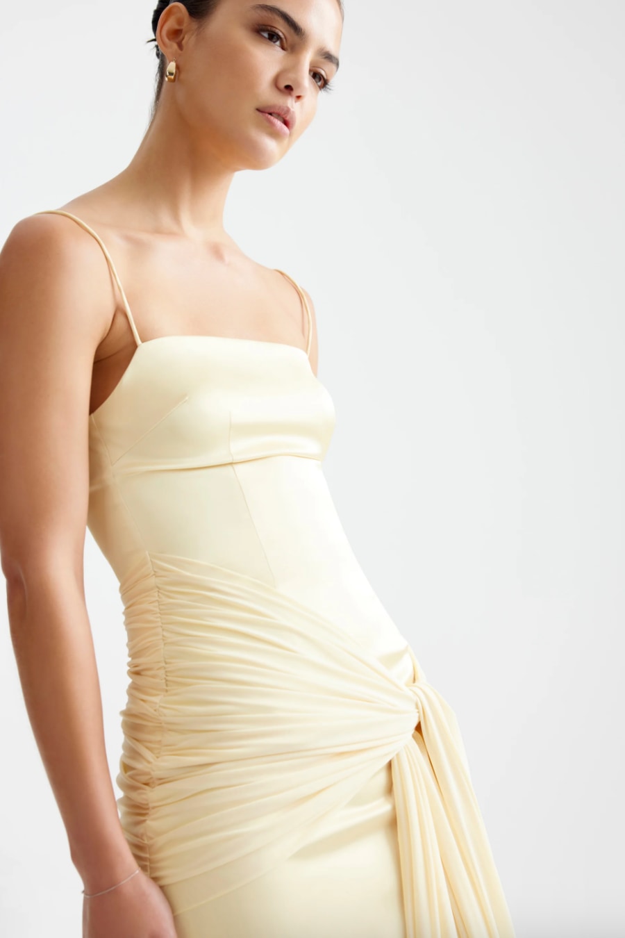 The Ayla Dress is a refined blend of structure and fluidity, crafted from our luxe satin with a contrast mesh wrap that elegantly ties at the front. Designed with adjustable spaghetti straps, a straight slim line and a straight skirt, creating a soft yet sculpted silhouette.
