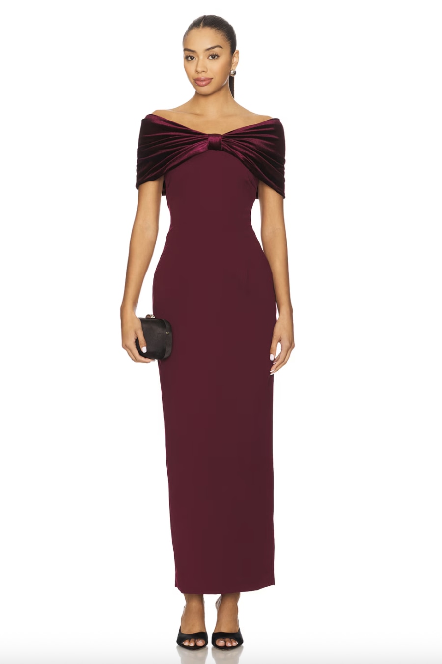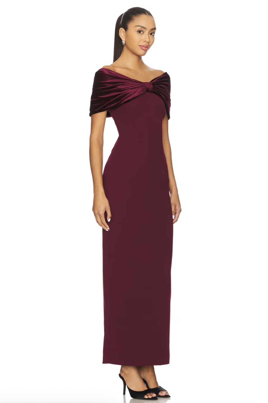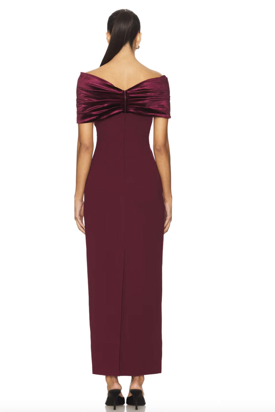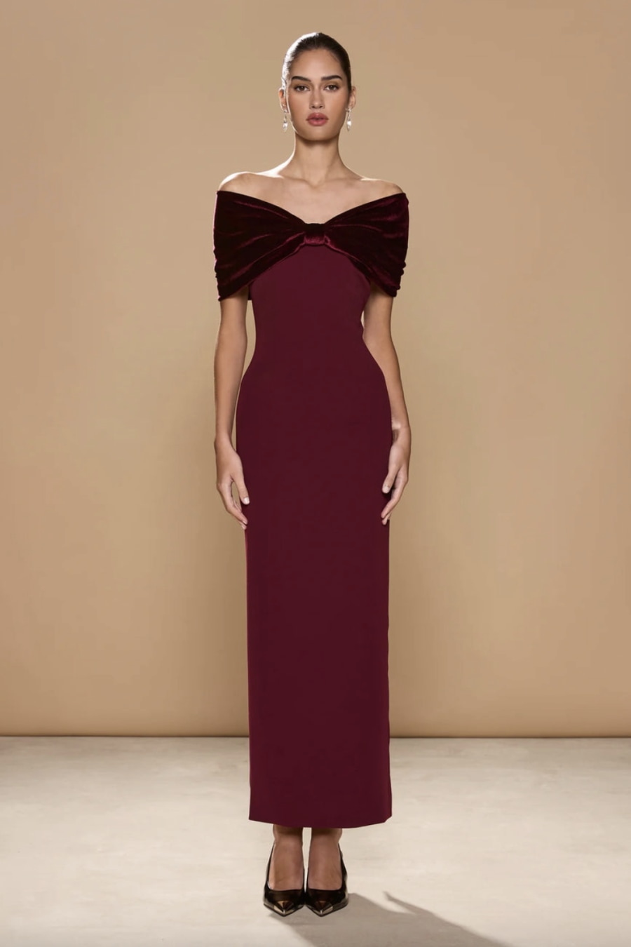 Designed in a richly merlot hue, the Belluno is made for a moment. Featuring a graceful oversized off-the-shoulder velvet bow design with a fitted bodice, it creates an ultra-flattering column silhouette.