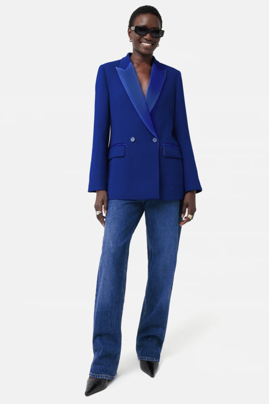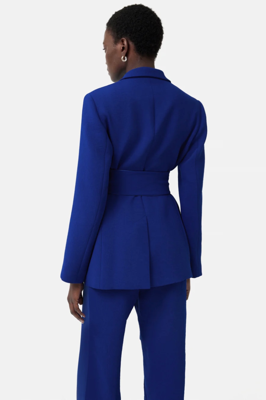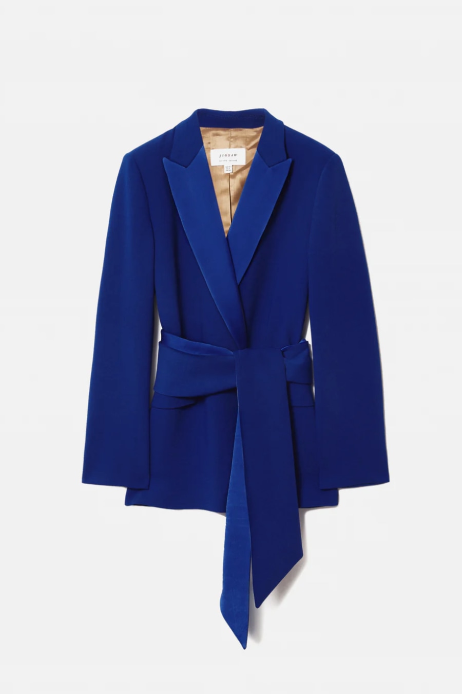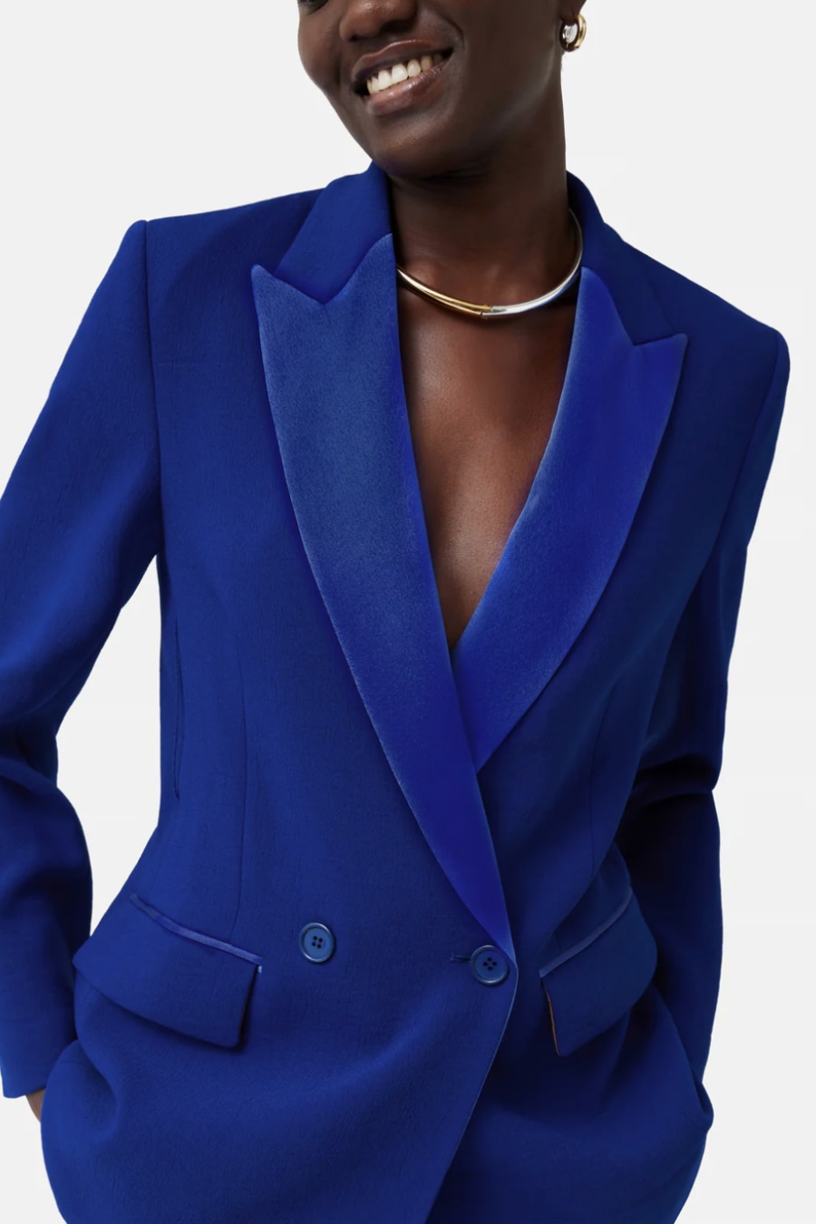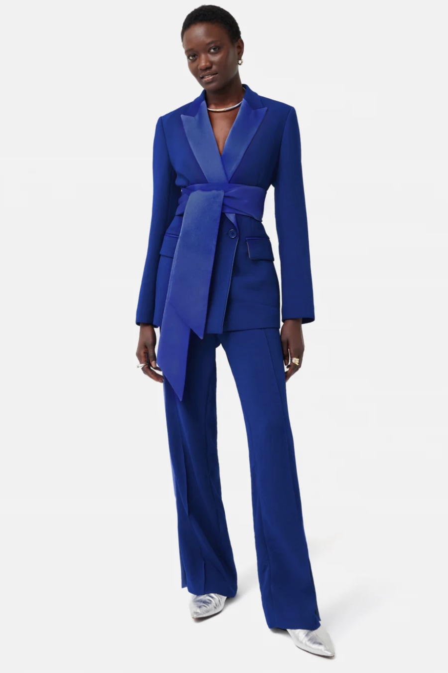 The epitome of statement tailoring, this stylish tuxedo blazer is cut in crinkled crepe from heritage Japanese mill, TAKISADA. Patterned in house for the ultimate fit, the double-breasted button closure, peak lapel, jet pockets and detachable sash belt all feature contrast satin trim details. Wear with wrap-around sash belt for a more fitted silhouette, or without for the classic tuxedo silhouette. Style with matching trousers to create the most standout suit.
