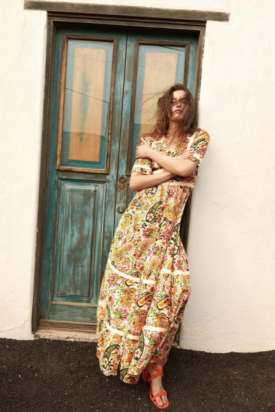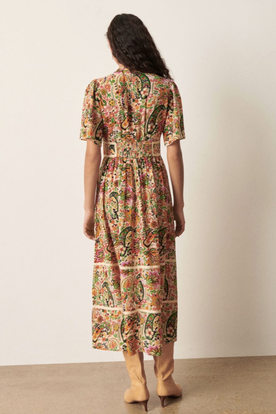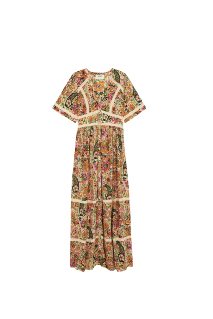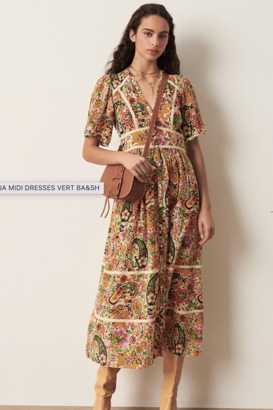 The ba&sh BENJA dress adds zest to your summer wardrobe. This midi dress has a V-neck and short flared sleeves with buttons all the way down the front like a shirt dress. In comfortable flowing fabric with a colourful print blending paisley pattern with exuberant flowers. Check out the solid stripes under the chest, waist and and on the skirt that give the dress graphic character. With 70s inspiration, this candid dress is full of life.