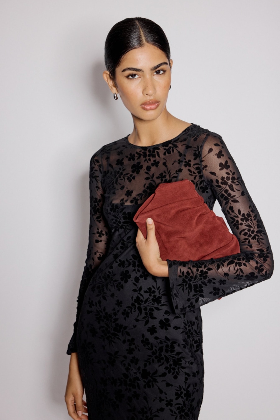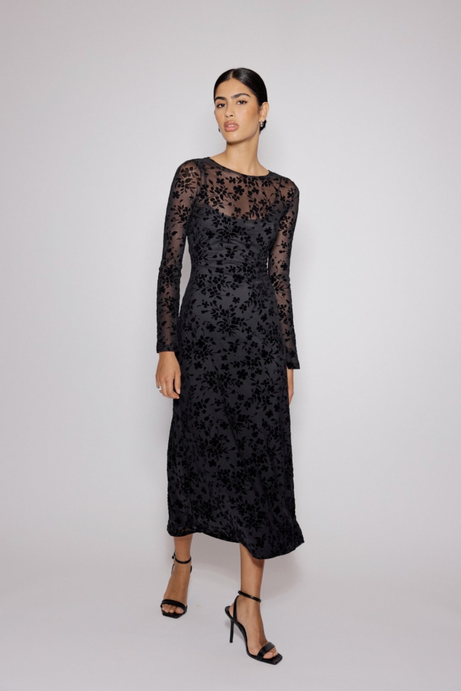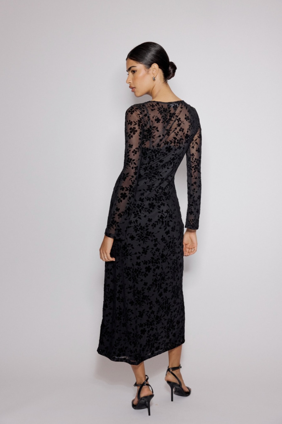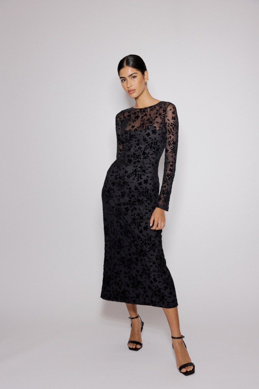Black Floral Jaquard Velvet Long Sleeve Clarissa Midi Dress