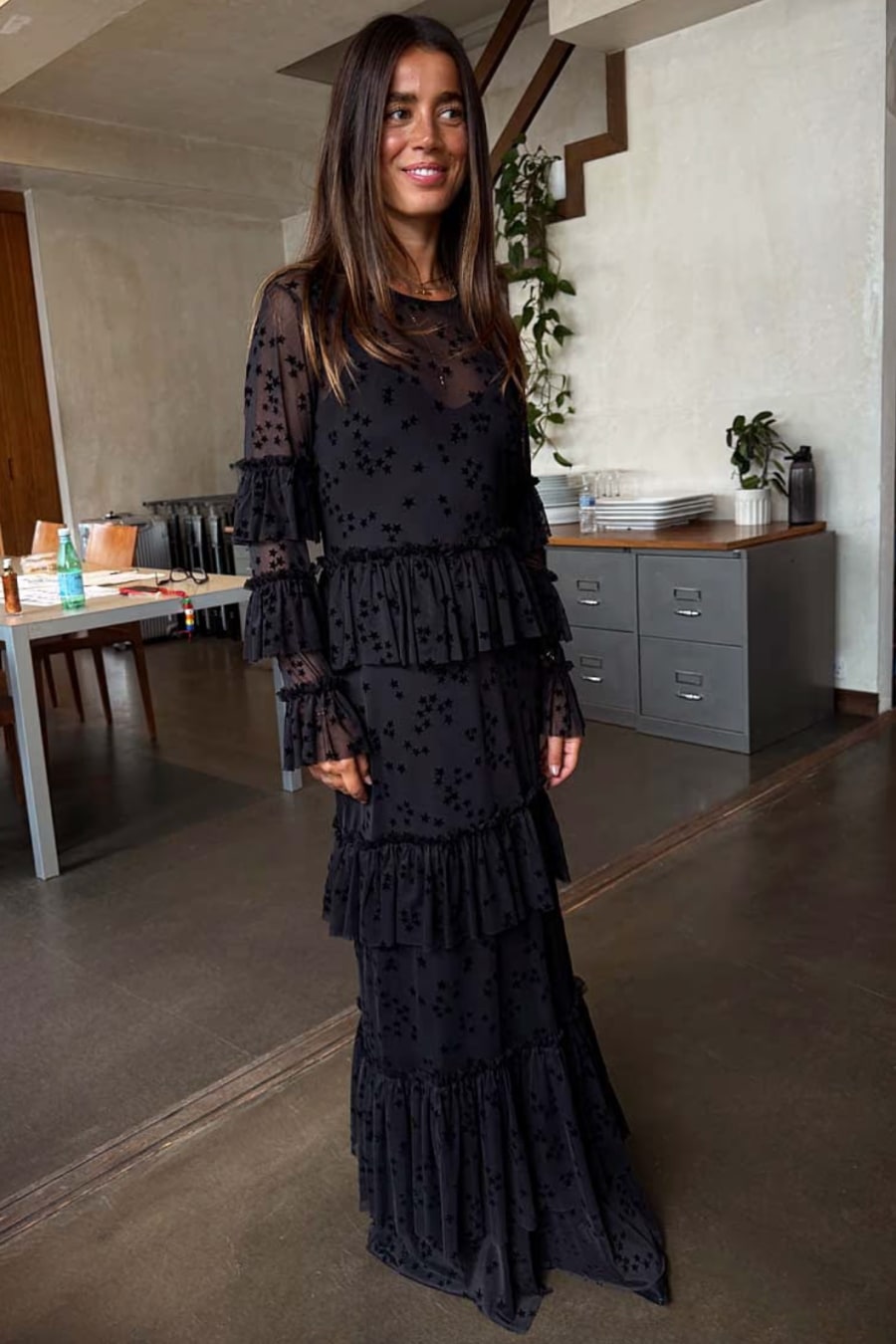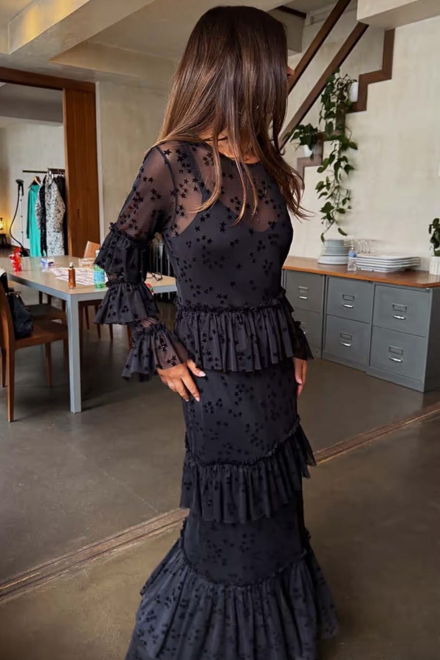 You guys loved our felicity dress so we had to recreate it! In a gorgeously lightweight mesh with tiered ruffle detailing along the bodice, sleeves and hem. Embellished with tiny velvet devore star and moon motifs, its perfect for partying the night away! Layer over underwear for a slightly sexier approach or add some coverage with the slip and pair with some heels. The fit is so flattering, it really skims the curves and defines the waist.