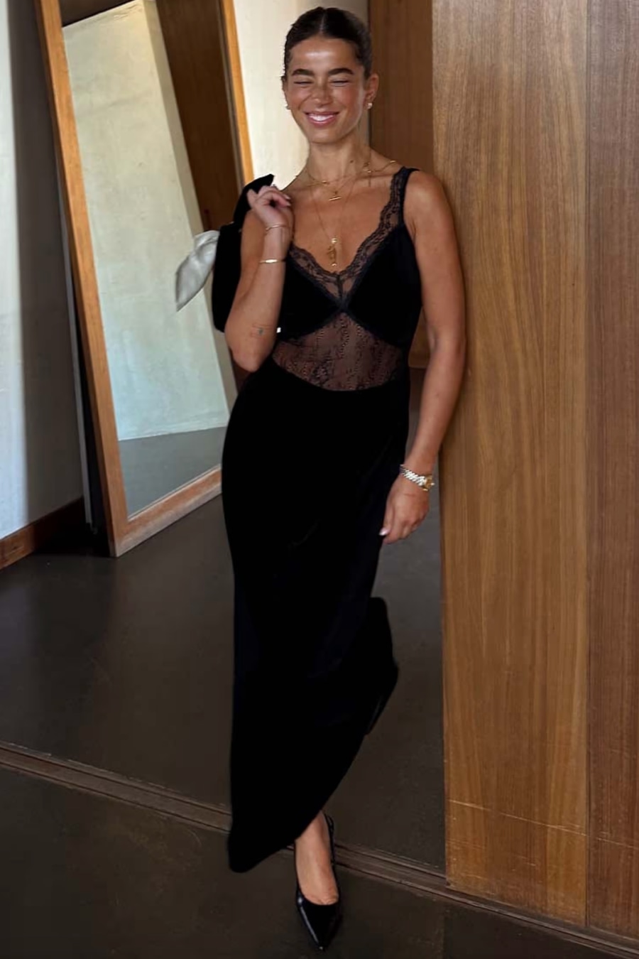 The dress is definitely adding a touch of sexiness to your 2025 party wardrobe! The gorgeous soft touch velvet paired with the sheer lace accents throughout and the chic midi silhouette will make this your most loved occasionwear item. Keep it simple with a slick back and heel for an effortless night out look.