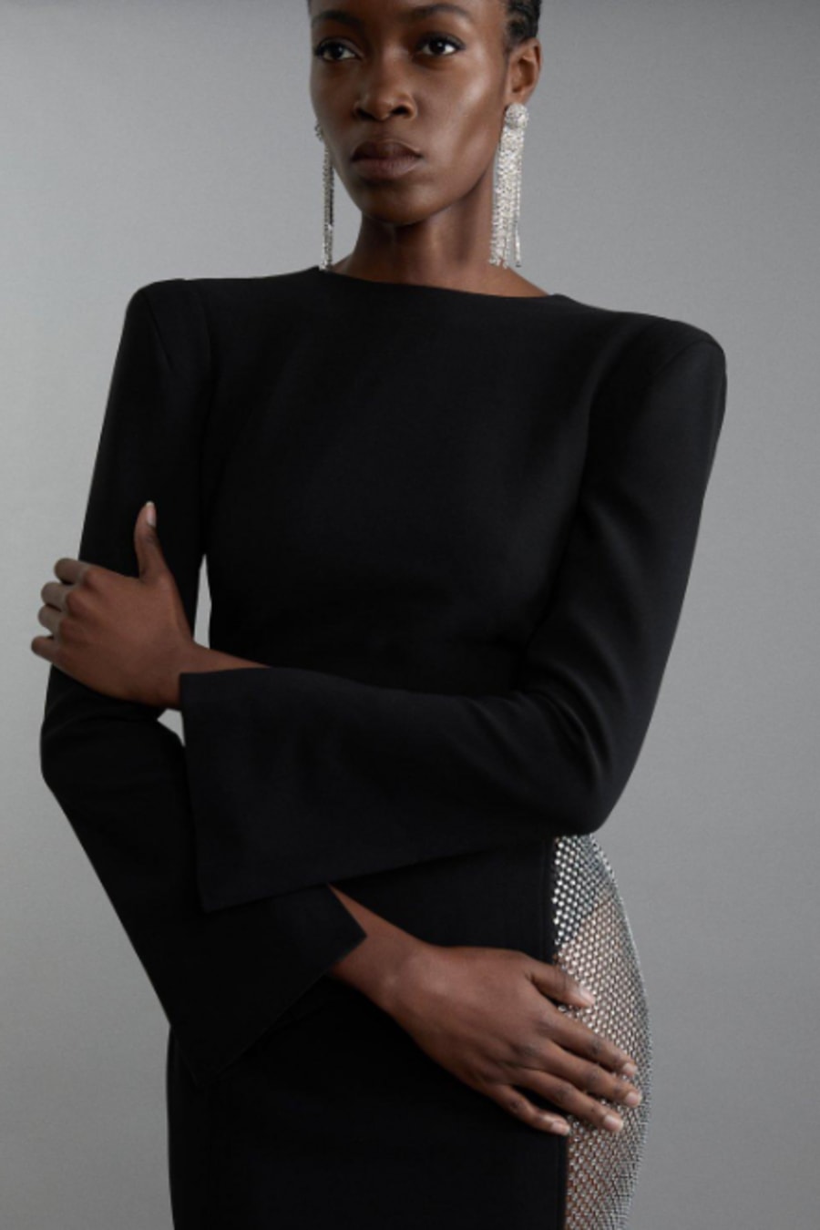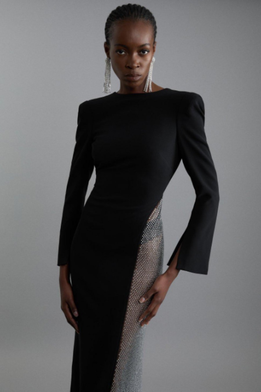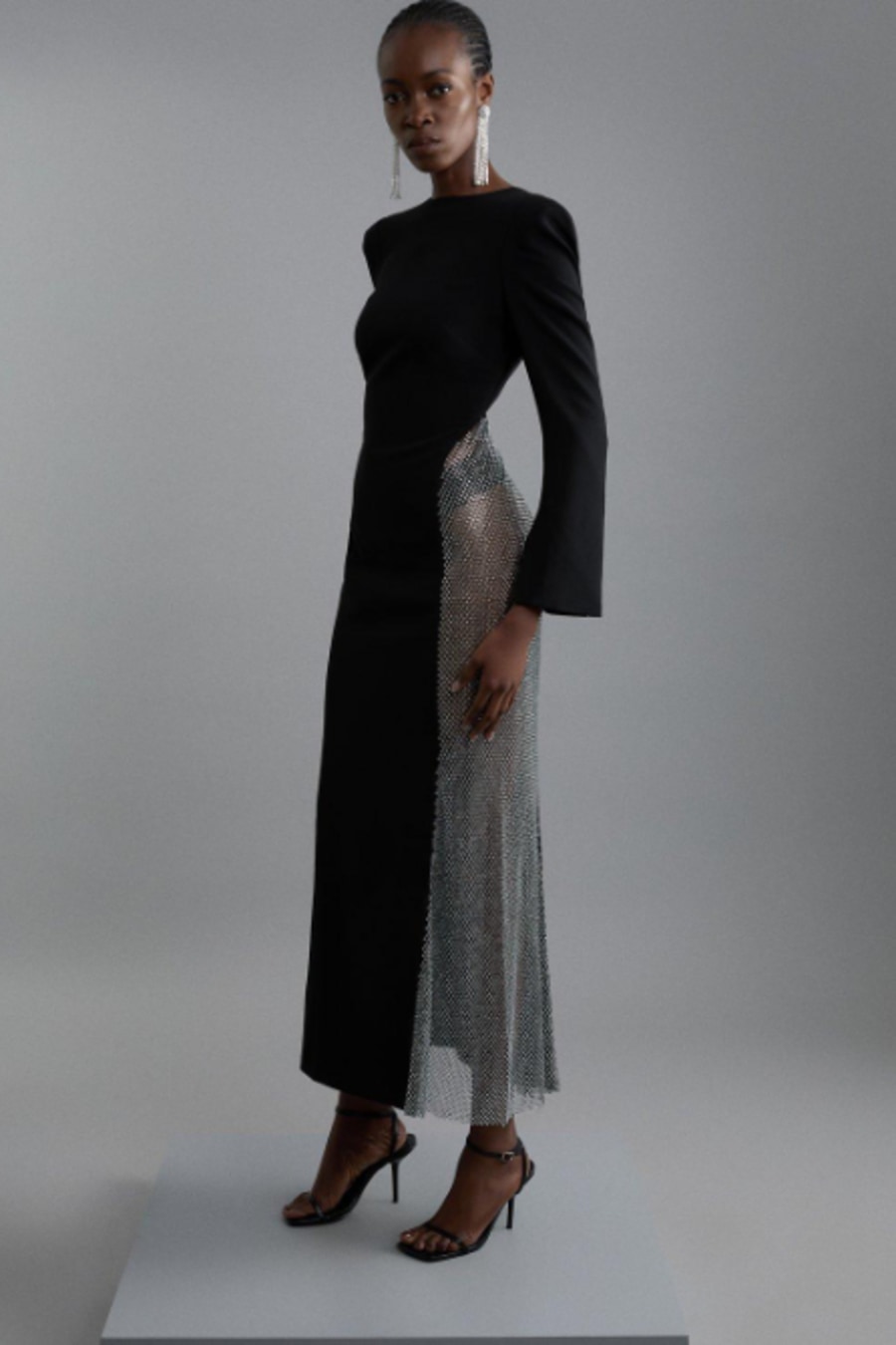 Indulge in elevated partywear, with this sleek dress. A strong shoulder and high neck design exude confidence while viscose drapes to a maxi length for structured fit. Elevating this piece is a side crystal mesh panel for luxury allure, while long sleeves ensure this dress can be worn all-year round. Pair with bold heels and accessories for glamorous occasionwear.