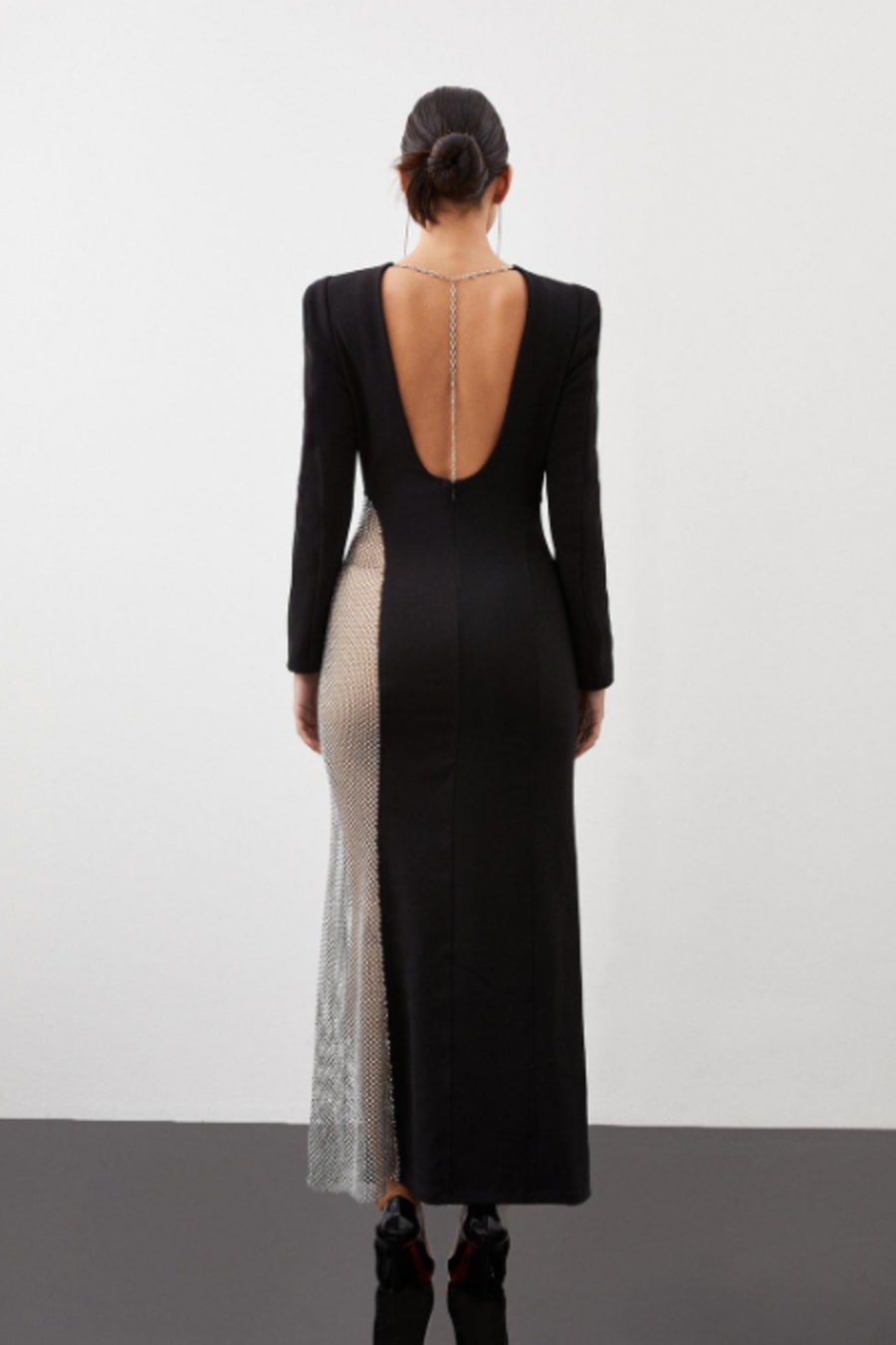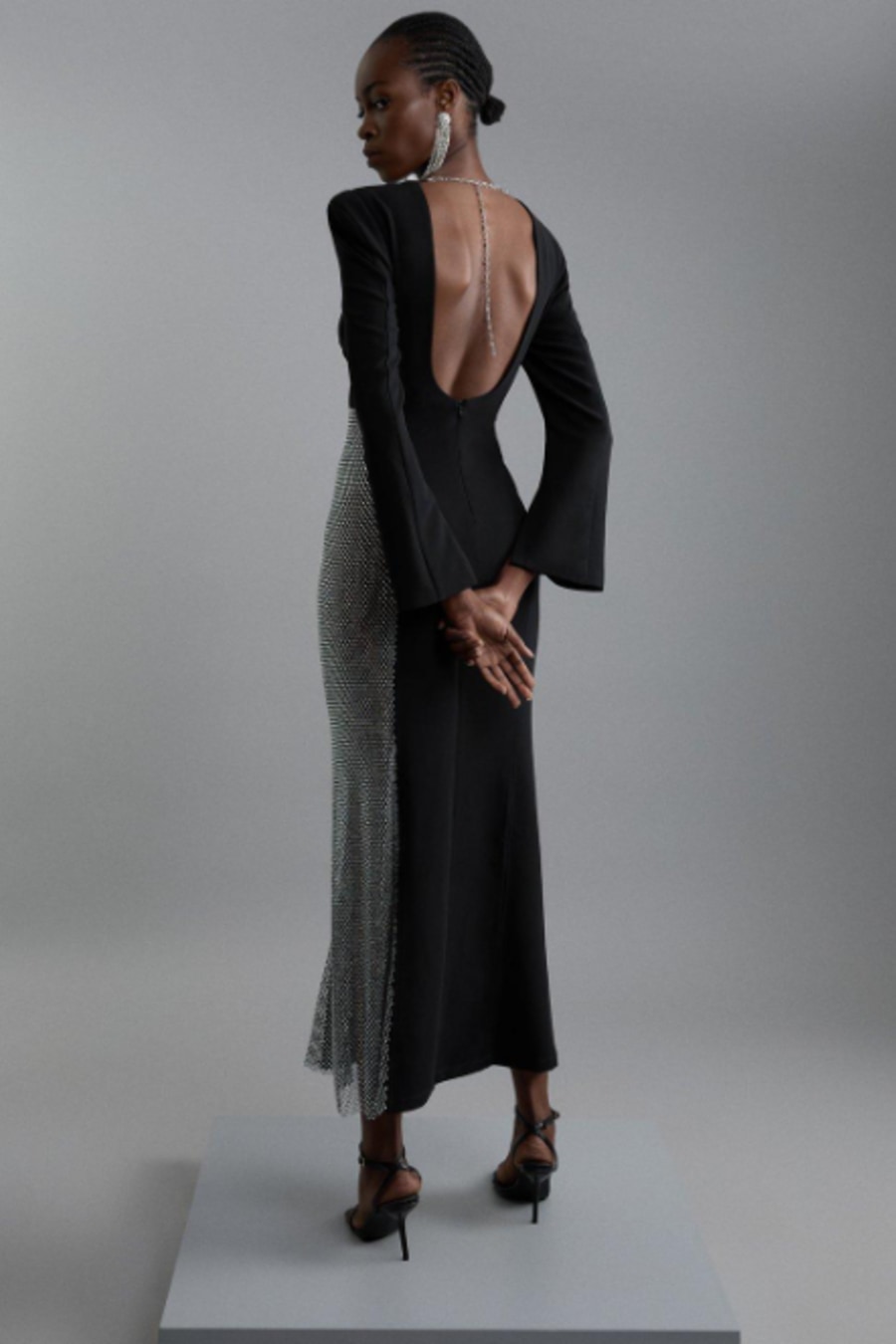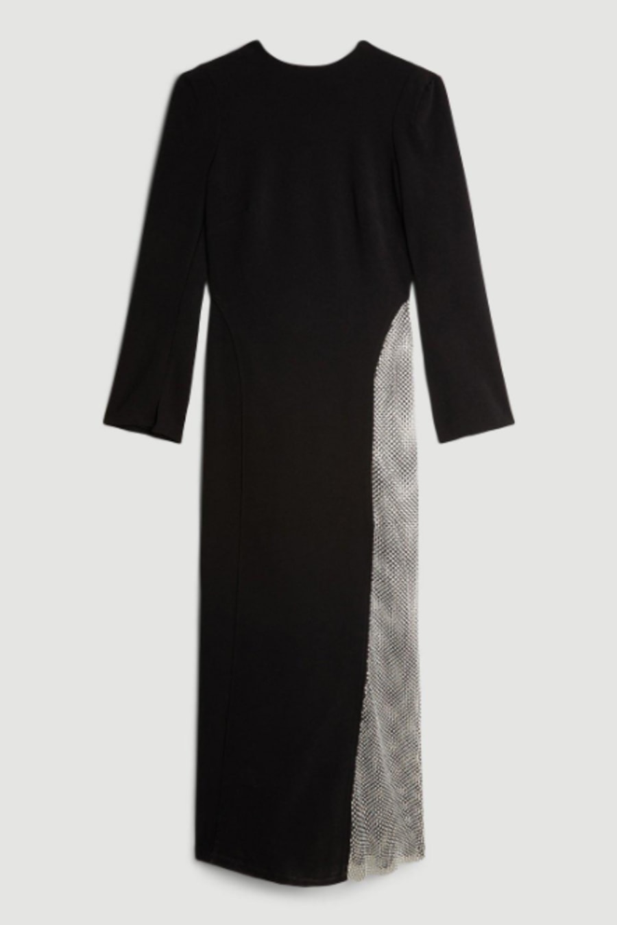 Indulge in elevated partywear, with this sleek dress. A strong shoulder and high neck design exude confidence while viscose drapes to a maxi length for structured fit. Elevating this piece is a side crystal mesh panel for luxury allure, while long sleeves ensure this dress can be worn all-year round. Pair with bold heels and accessories for glamorous occasionwear.