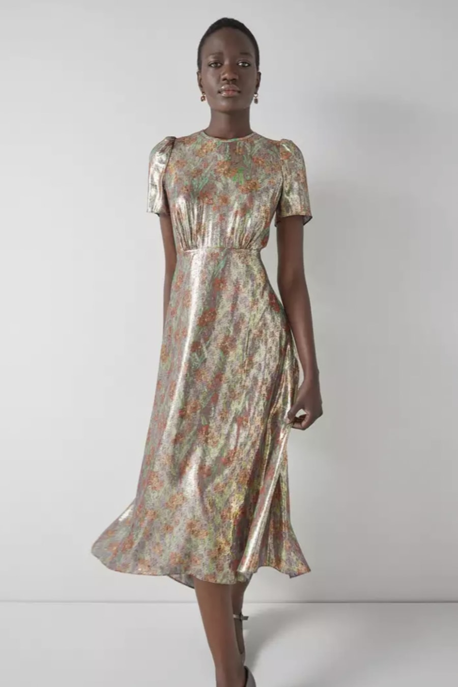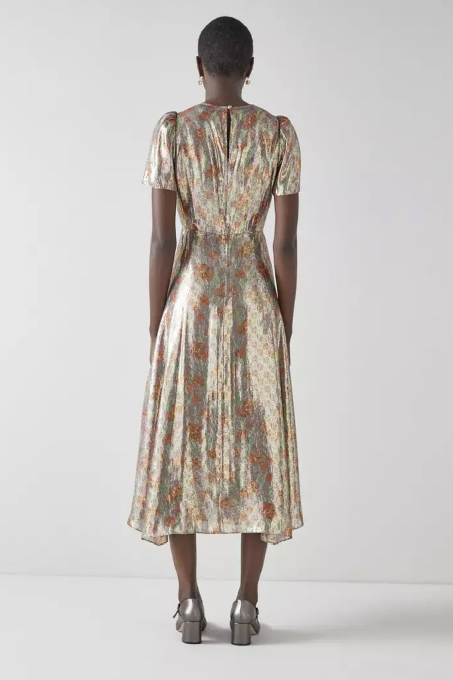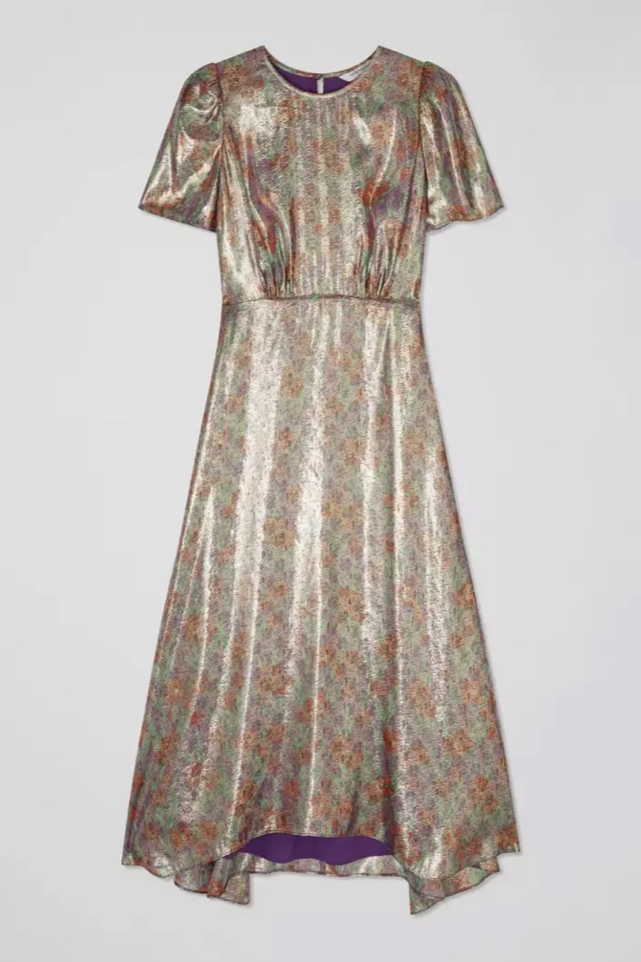 A bestseller back for another season, the latest riff on our much-loved Boyd dress is destined for dancing. Crafted from gold metallic silk with a purple, orange and green midnight floral print, it's super-slinky and fluid with a round neck, short puff sleeves, pleating to the bodice and a floaty, dipped hem midi skirt. Wear it with a pair of strappy heels and a clutch when the party invites start coming in.