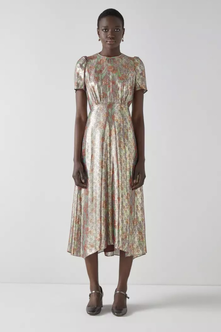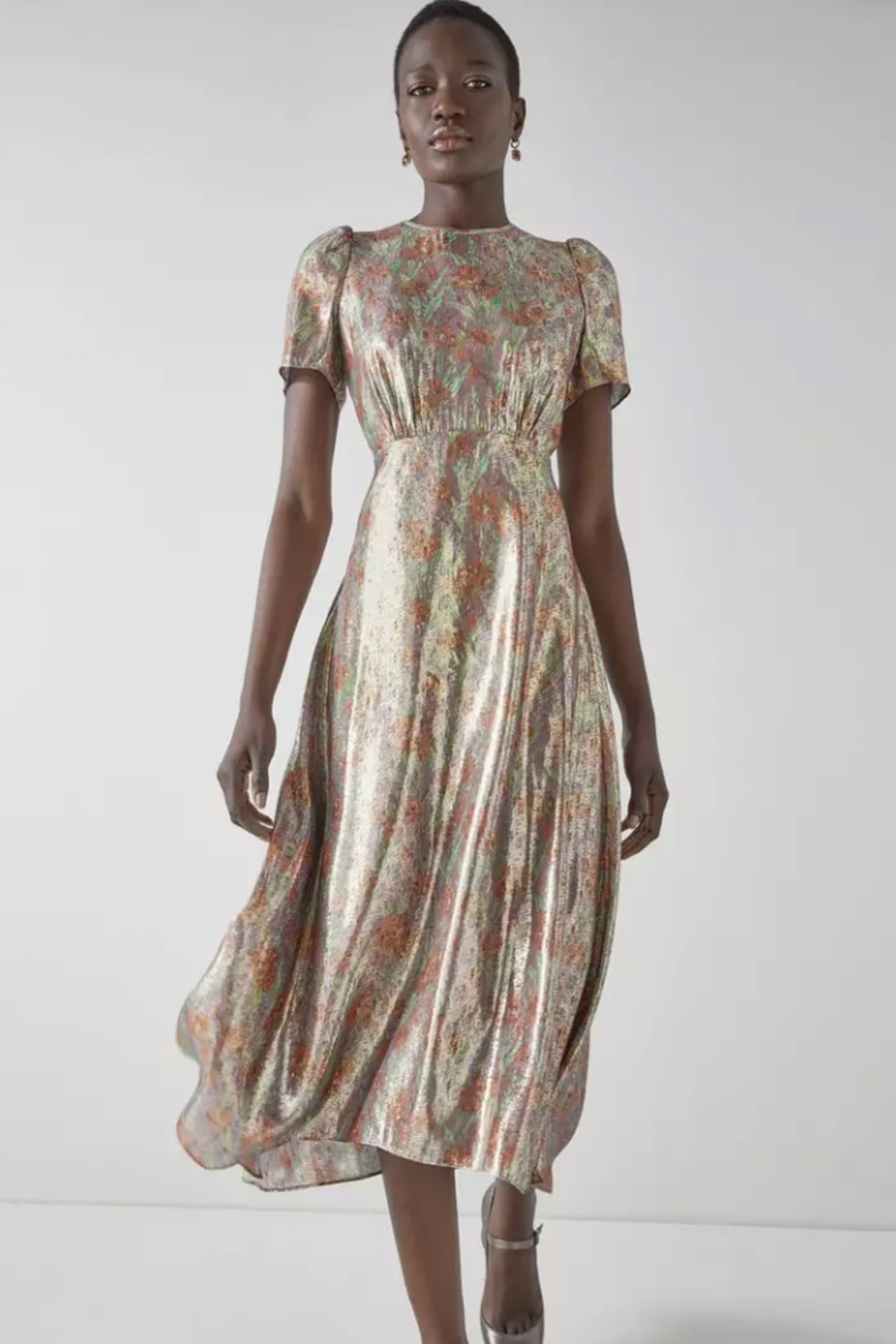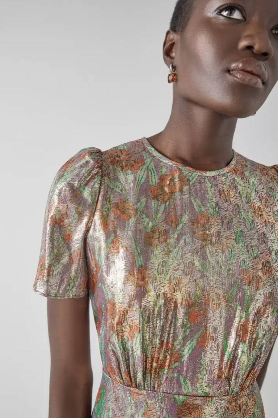 A bestseller back for another season, the latest riff on our much-loved Boyd dress is destined for dancing. Crafted from gold metallic silk with a purple, orange and green midnight floral print, it's super-slinky and fluid with a round neck, short puff sleeves, pleating to the bodice and a floaty, dipped hem midi skirt. Wear it with a pair of strappy heels and a clutch when the party invites start coming in.
