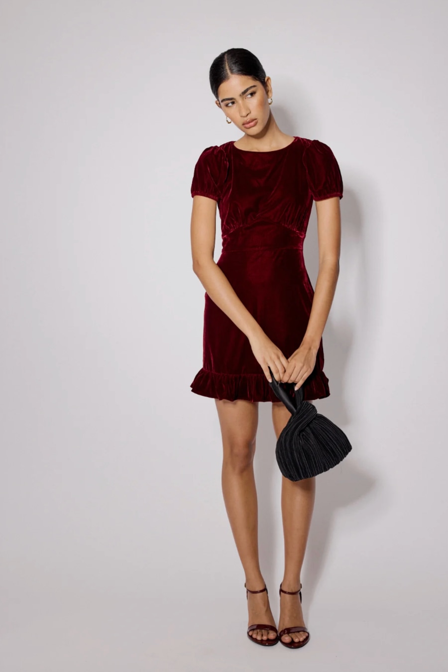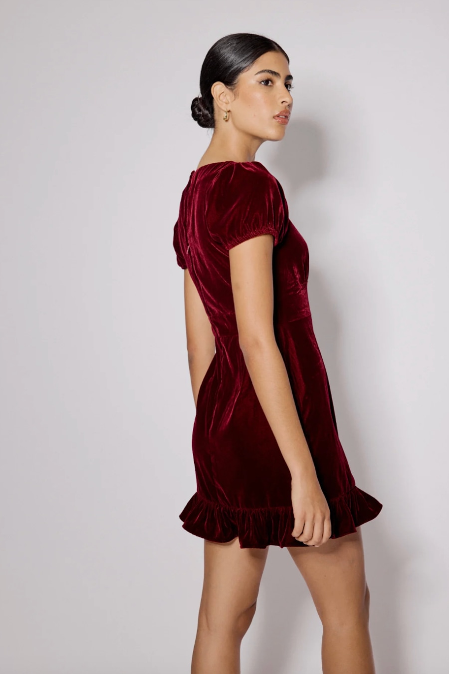 Burgundy Velvet Frill Hem Cosmo Mini Dress