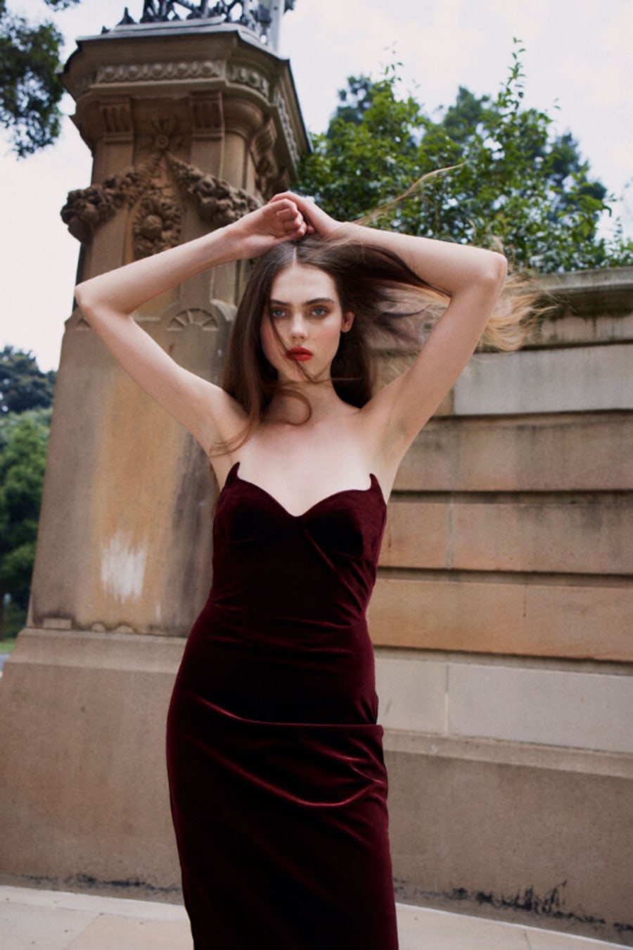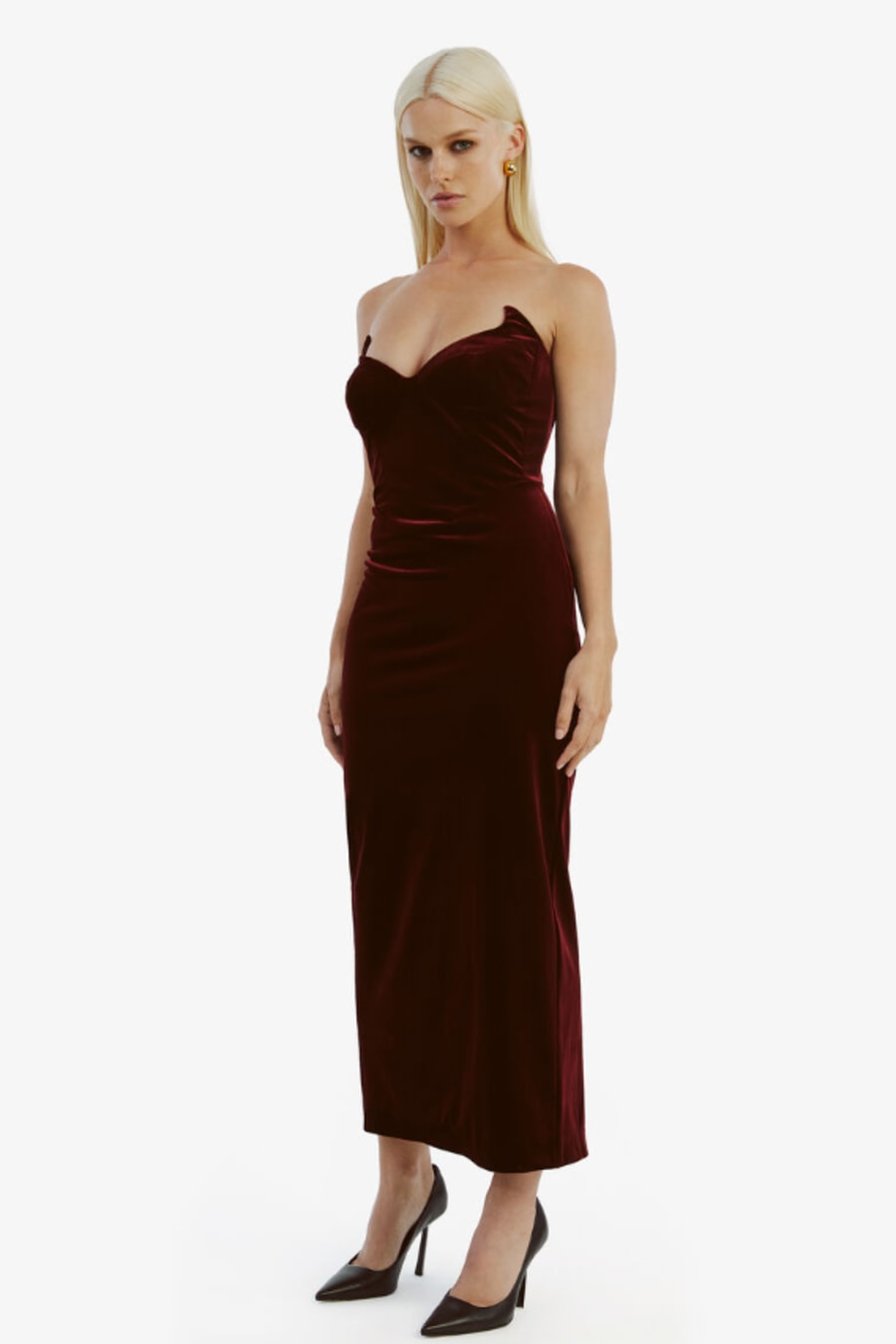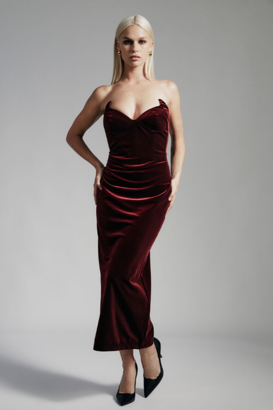 Give into velour desires. The Camellia Velour Midi Dress features a structured bodice with boning to hold shape. It has a strapless design with a centre back split, sweetheart neckline and a zip closure.