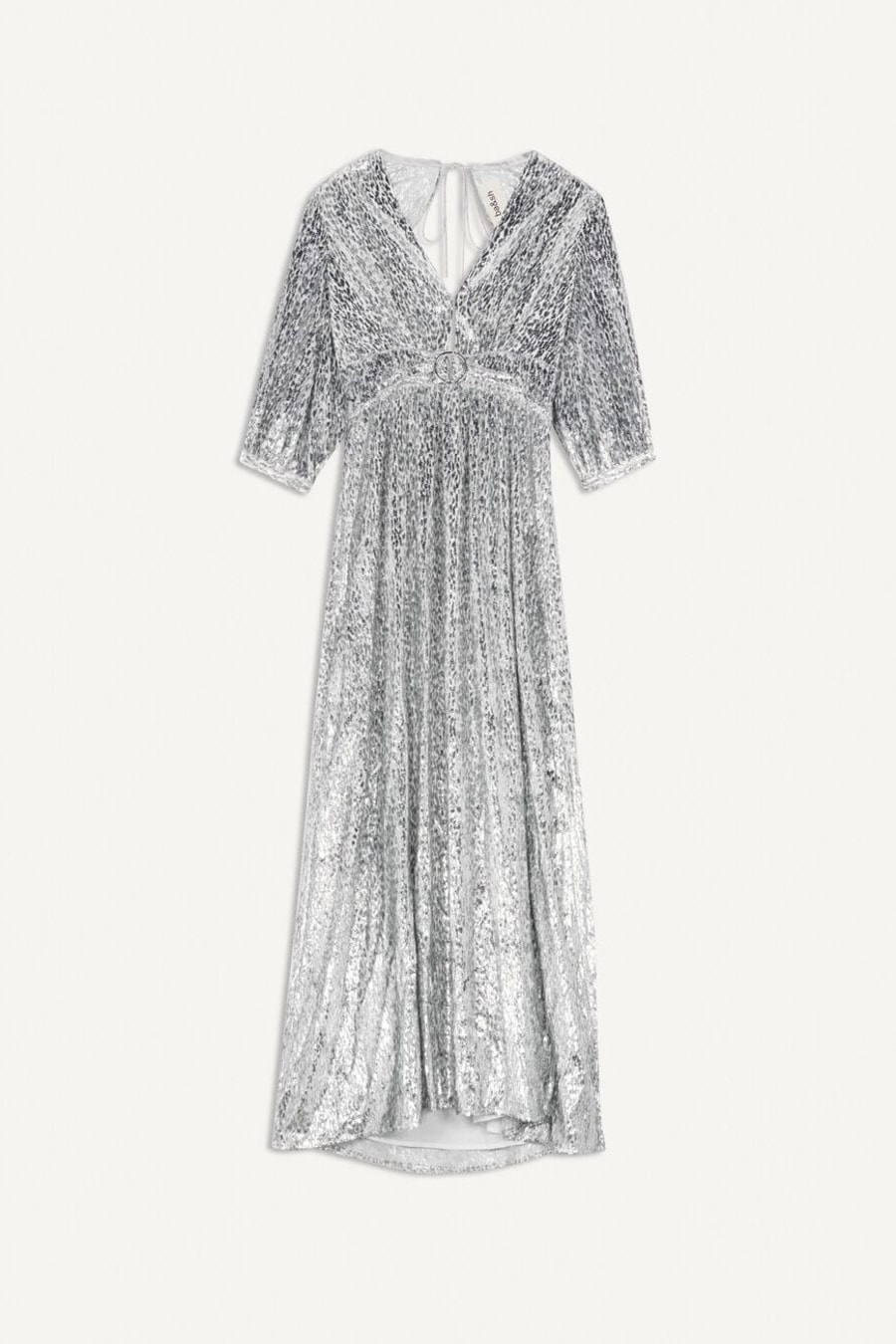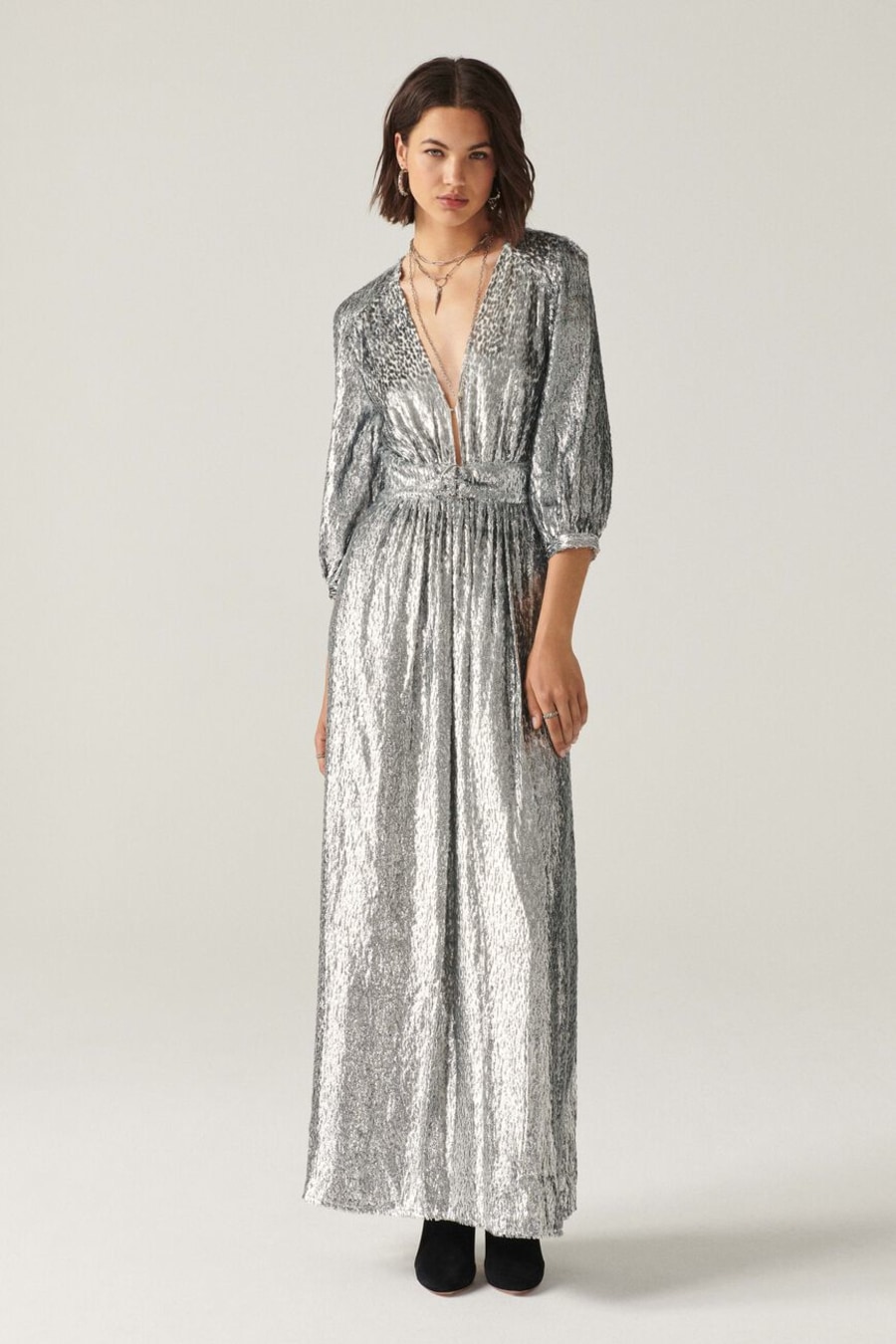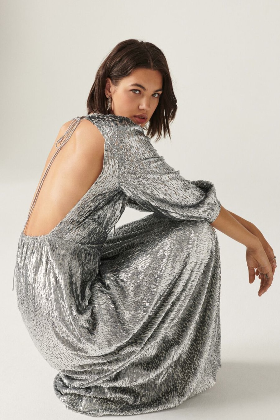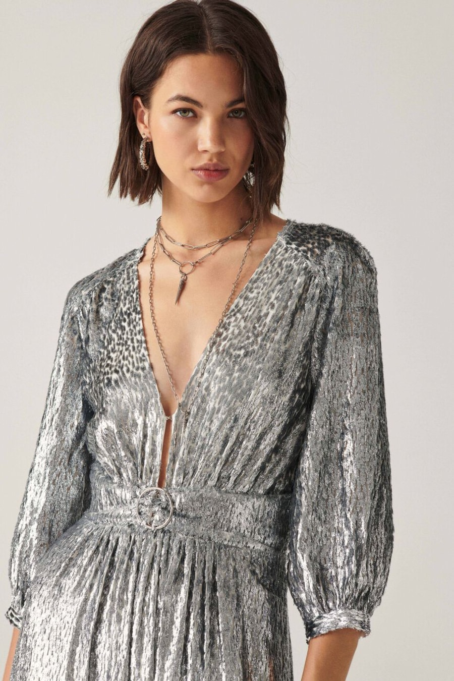 The DARA dress is a stunning, elegant style that is anything but ordinary. Made from metallic fibres and silk, we can guarantee you won't go unnoticed on evenings out! The viscose and elastane lining will feel amazing against your skin and guarantee complete comfort. Add the elbow-length sleeves, elastication at the back of the waist and a dazzling bare back and it'll be love at first sight. We love the silk tie at the back, belt effect and V neckline. Pair with a clutch for a glam look.
