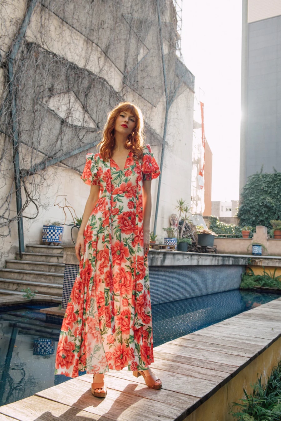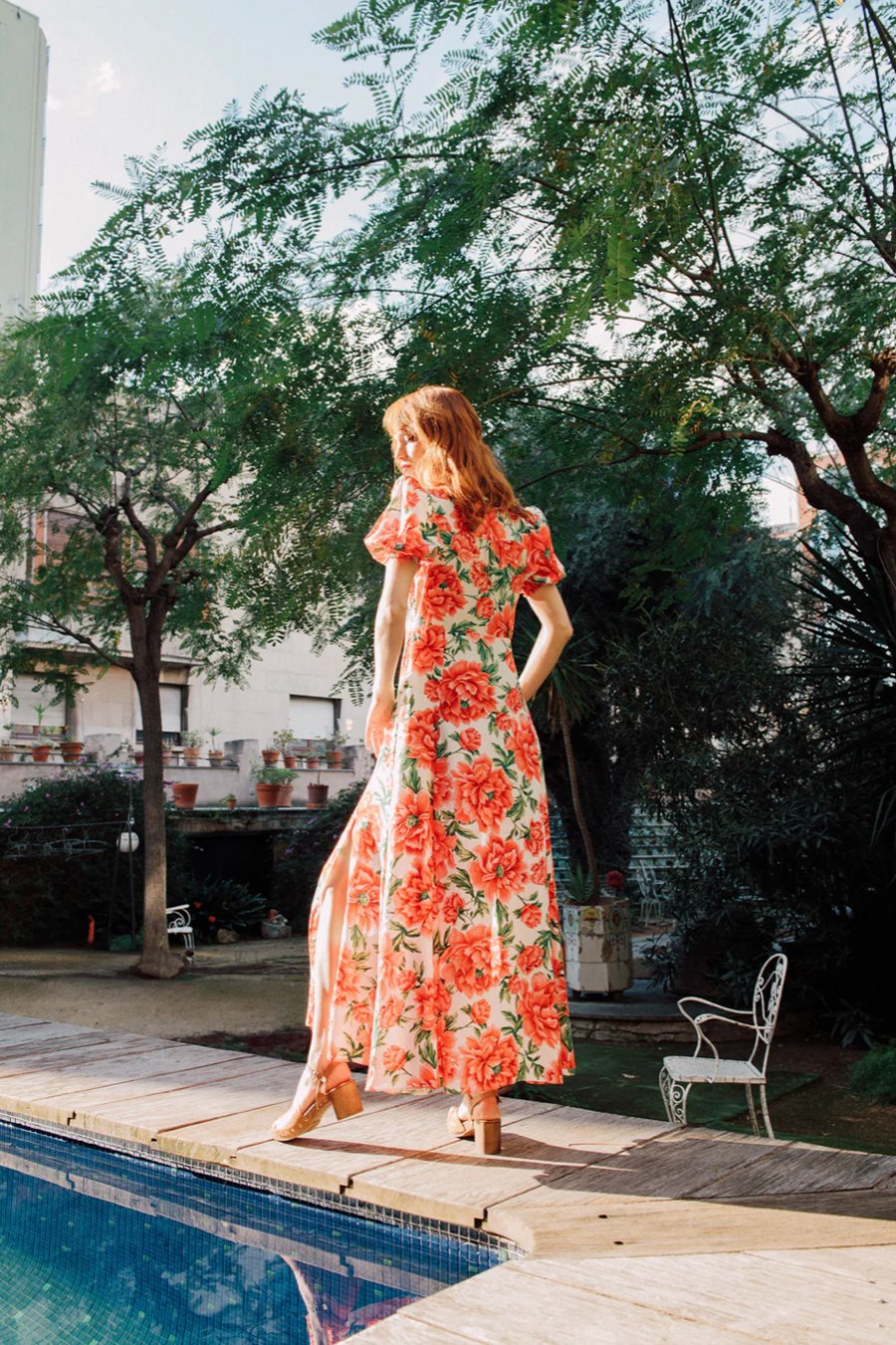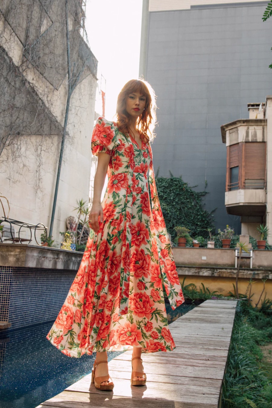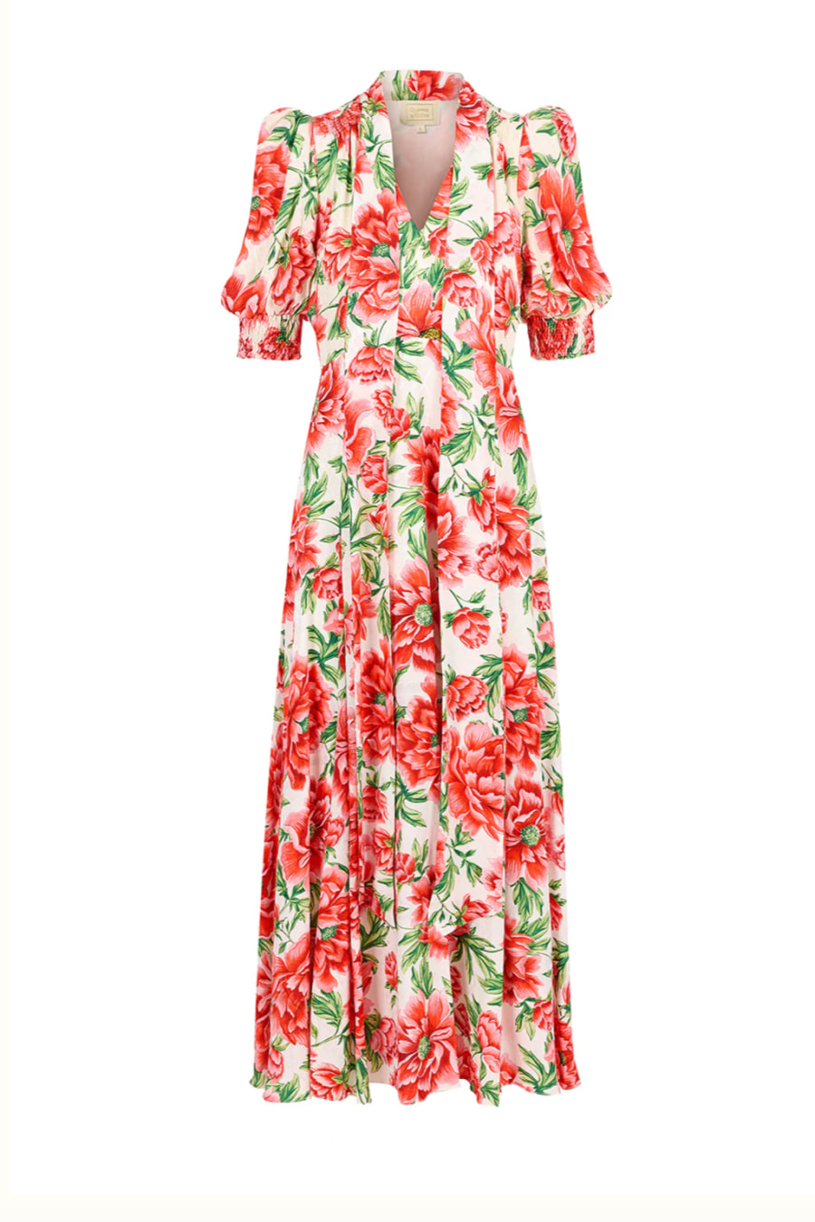 Swathed in red peonies, Delilah embodies the romance of the past with the confidence of the present. Her textured jacquard fabric adds depth, while a 40s-inspired V-front and perfectly puffed shoulders create a silhouette both structured and soft. The double-split skirt flows with every step, a whisper of movement and allure. Feminine, bold, and endlessly wearable, Delilah is for those who embrace beauty in all its fleeting, floral splendour.
