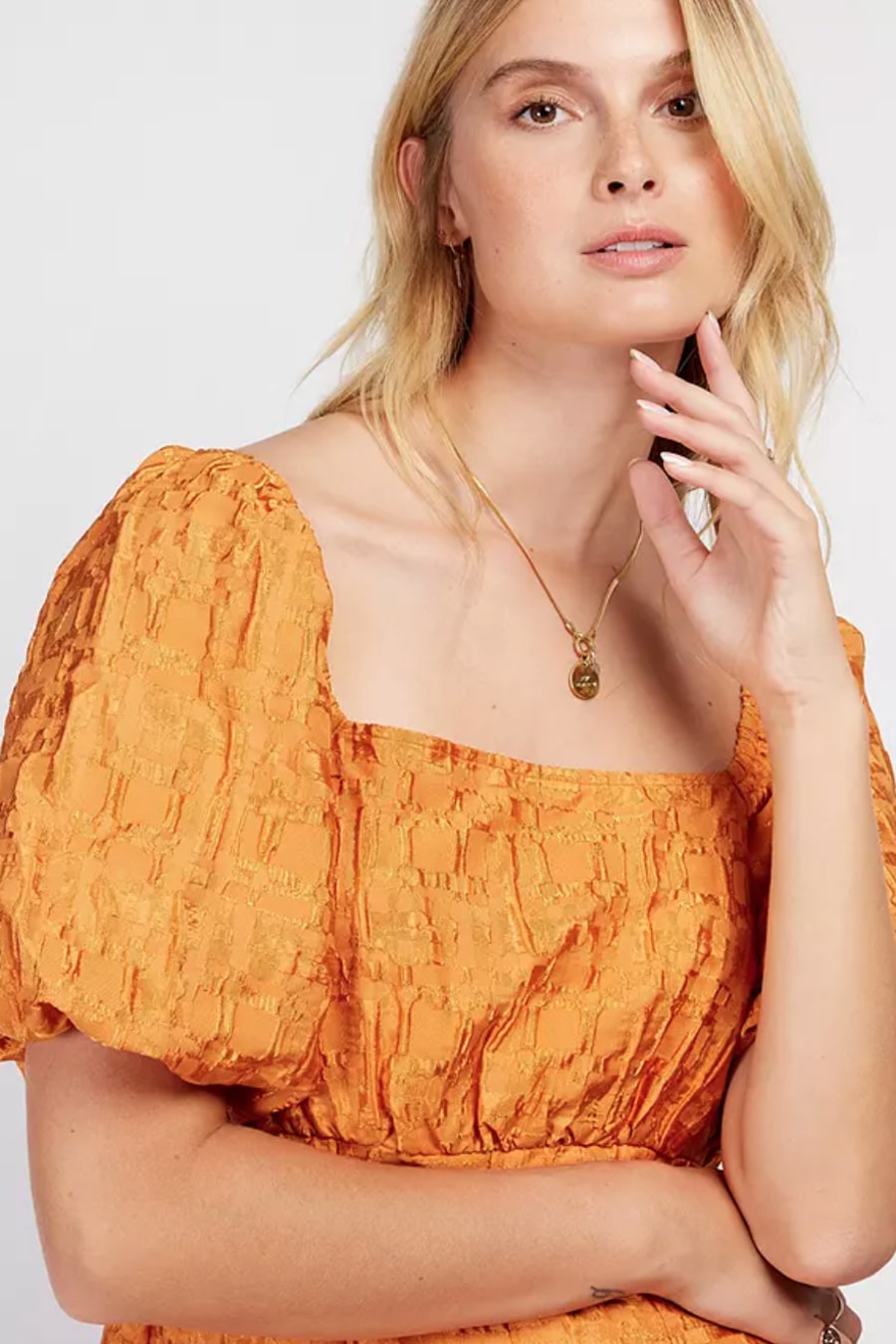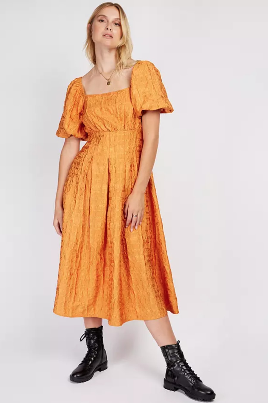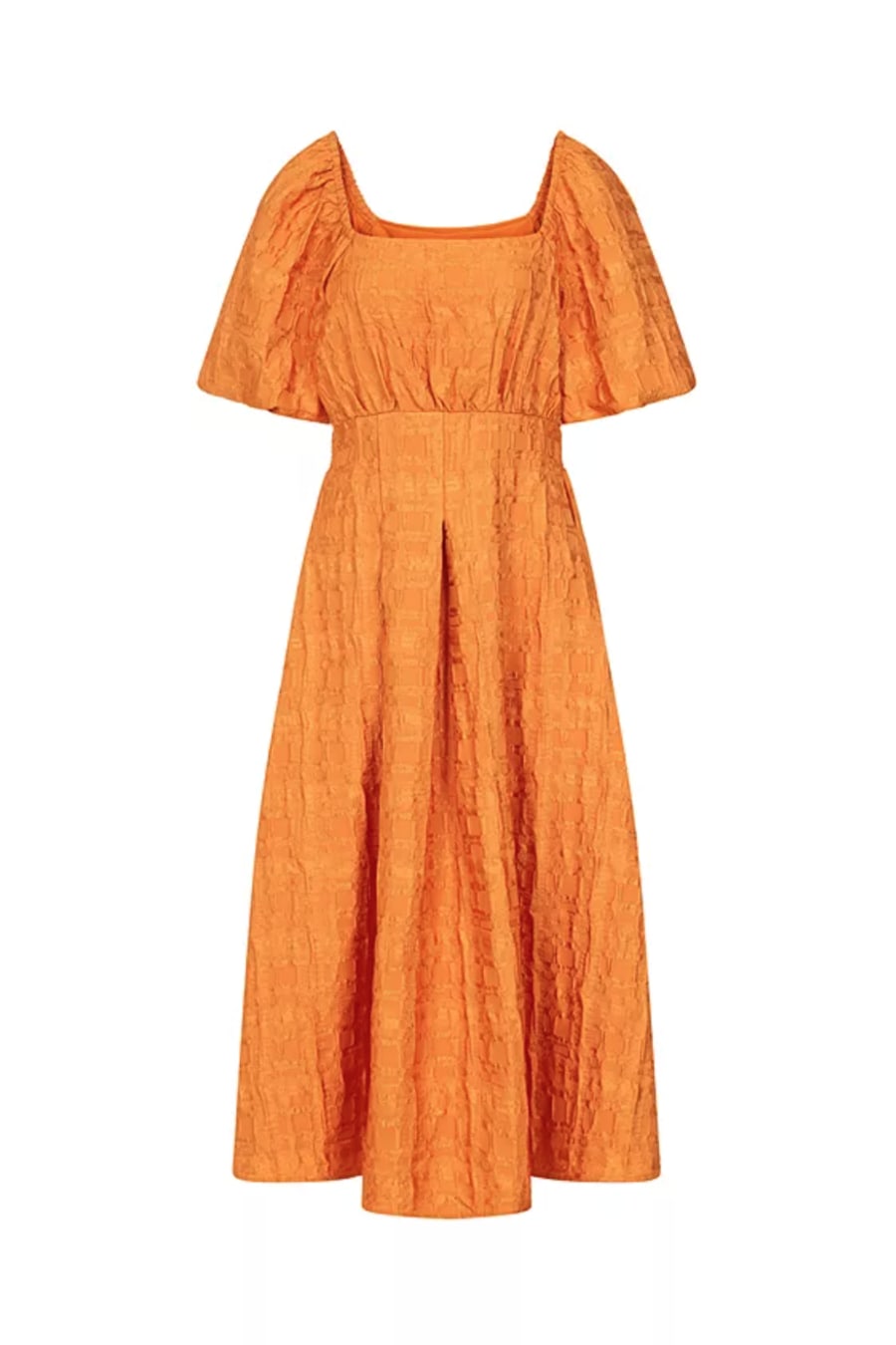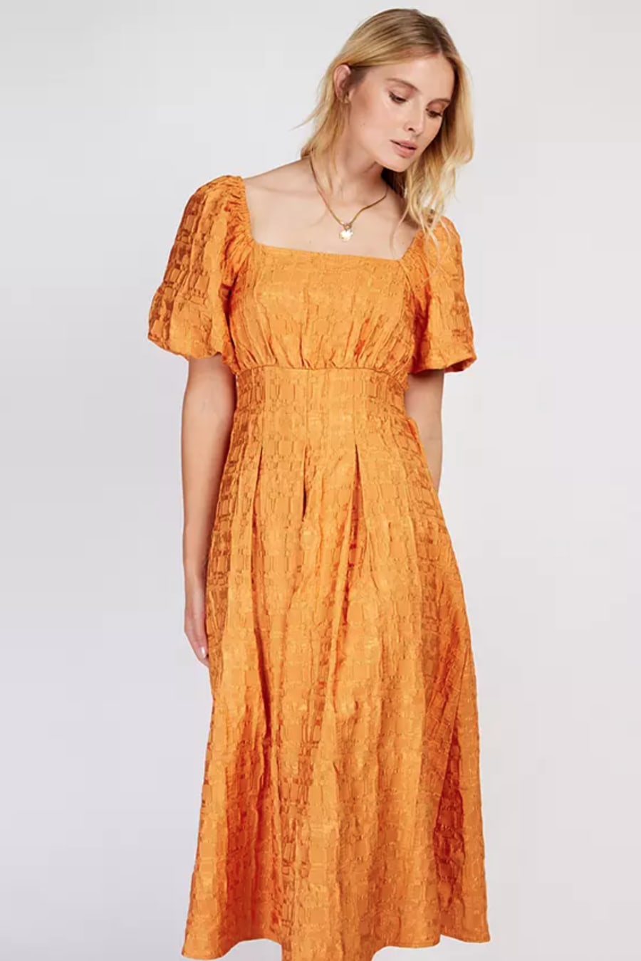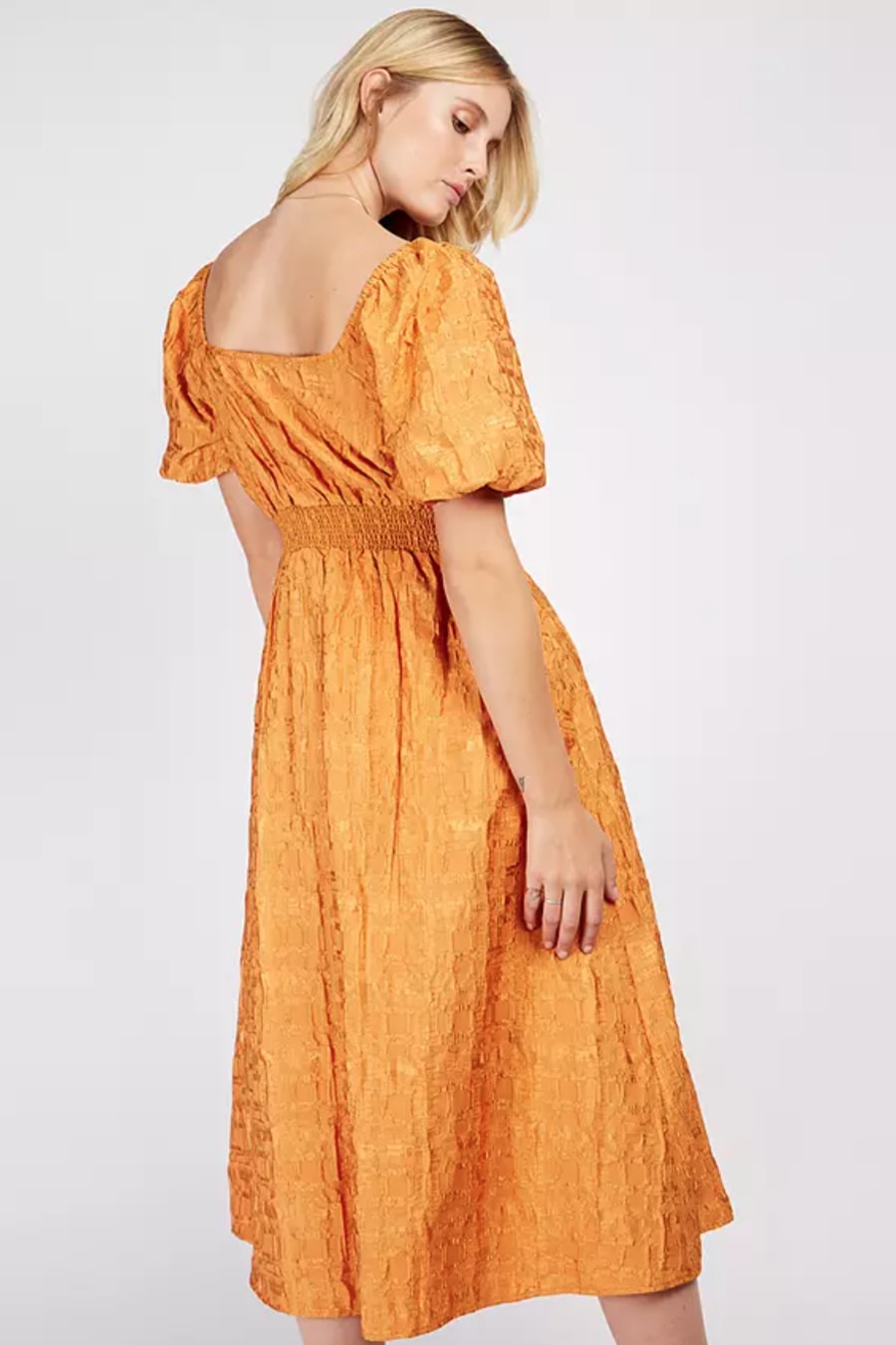 Swish into the new season in our dreamy jacquard dress. The burnt orange hue is gorgeously autumnal, while the puff sleeves, nipped-in waist and flowing midi hem are unashamedly feminine. Perfect with platforms. Print placement may vary.
