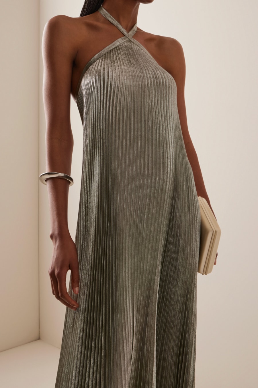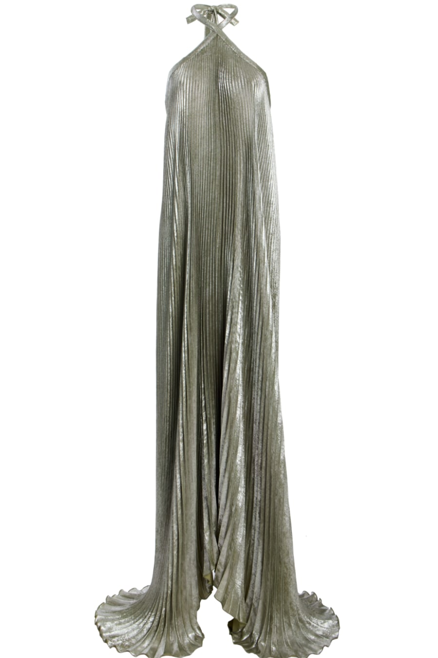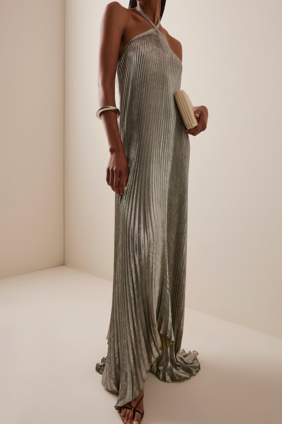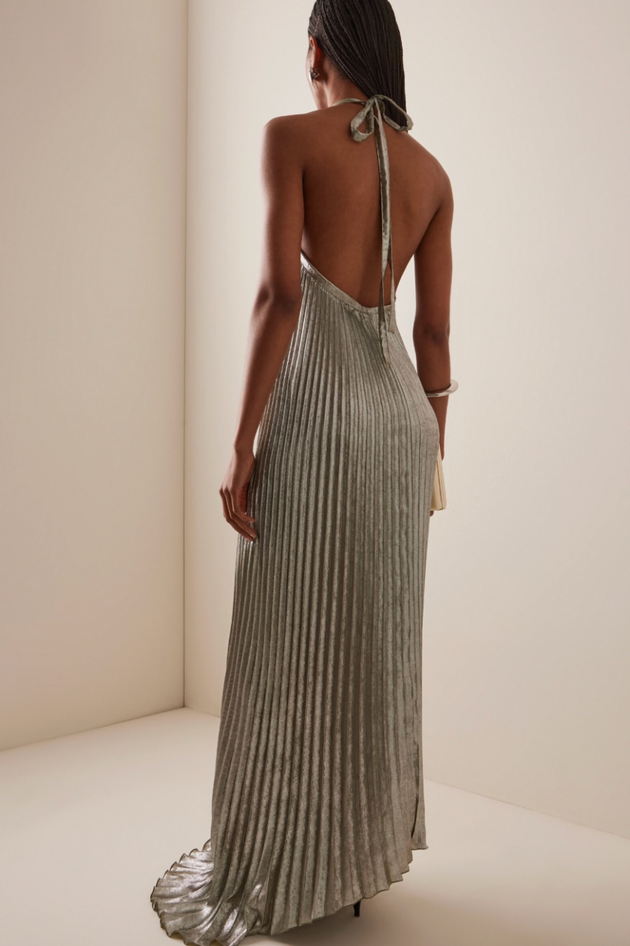 Crafted with elegance and grandiosity in mind. The theatrical pleats are elevated by the length of the gown & creating an exquisite silhouette that will move with finesse.