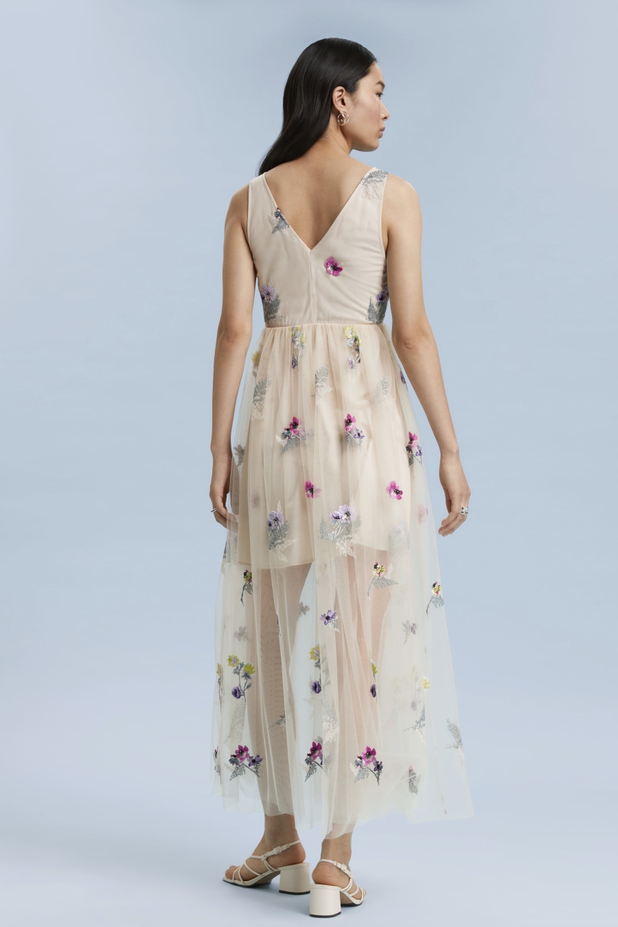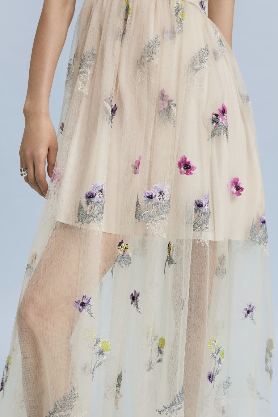 Embroidered gathered tulle dress crafted from layered materials. Featuring a sleeveless, deep, v-cut overlapping neckline with a gathered tulle skirt to accentuate the waist delicately embroidered with floral applique. Secured with a centre back concealed zip closure. Length of dress: 118cm / 46.5" (EU 36 / UK 8 / US 4)