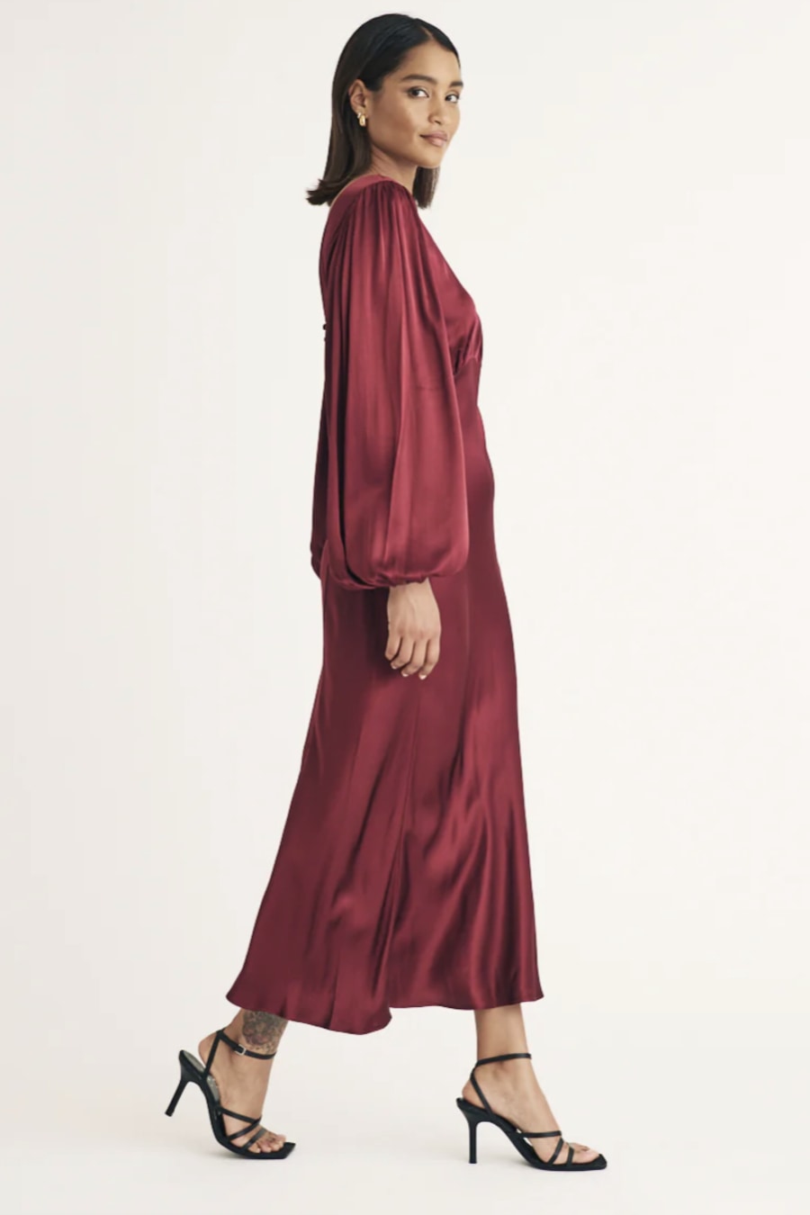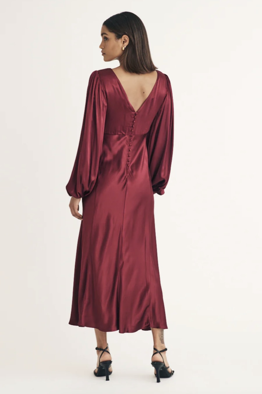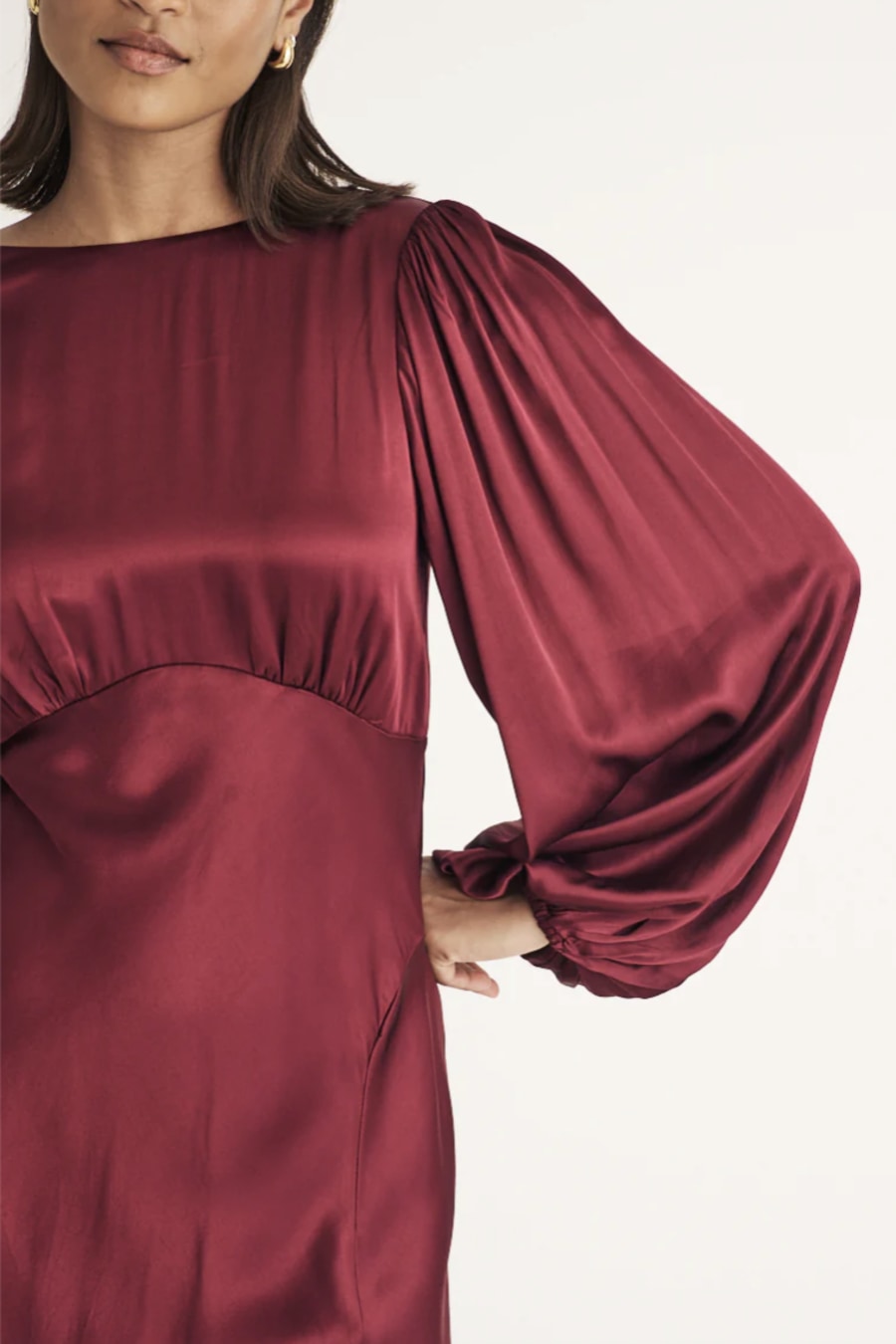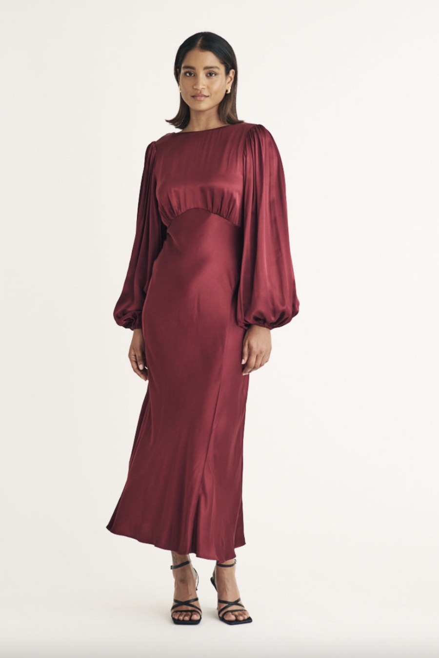 Walk down the aisle with the NC bridal party collection. This rich red head-turner is Ember. Expertly crafted from a viscose blend, her flowy satin shape is perfect for cold weather weddings. With billowing balloon sleeves that are balanced by a flattering panelled waist, don’t miss the dainty design details that finish the back. Style her with strappy black shoes and gold accents.