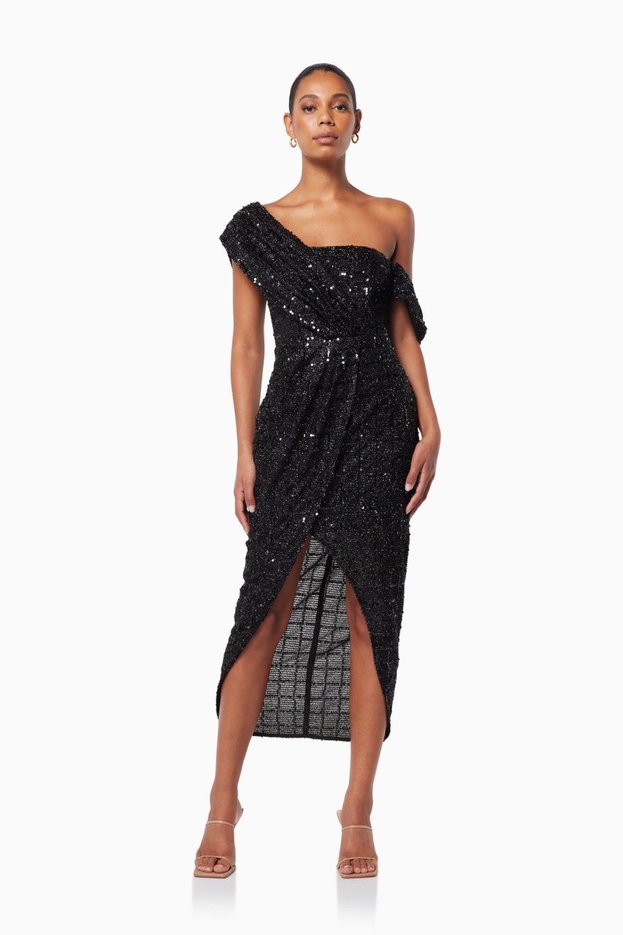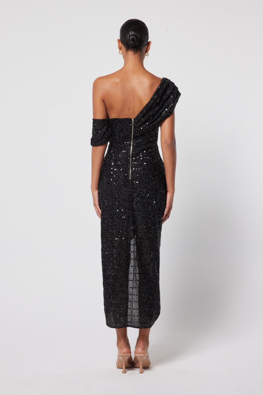 A sophisticated choice for evening events, the Esther dress will sparkle into the night. Imaginatively tailored, the dress wraps over the shoulder and around the arm, before skimming the figure to a split front skirt.