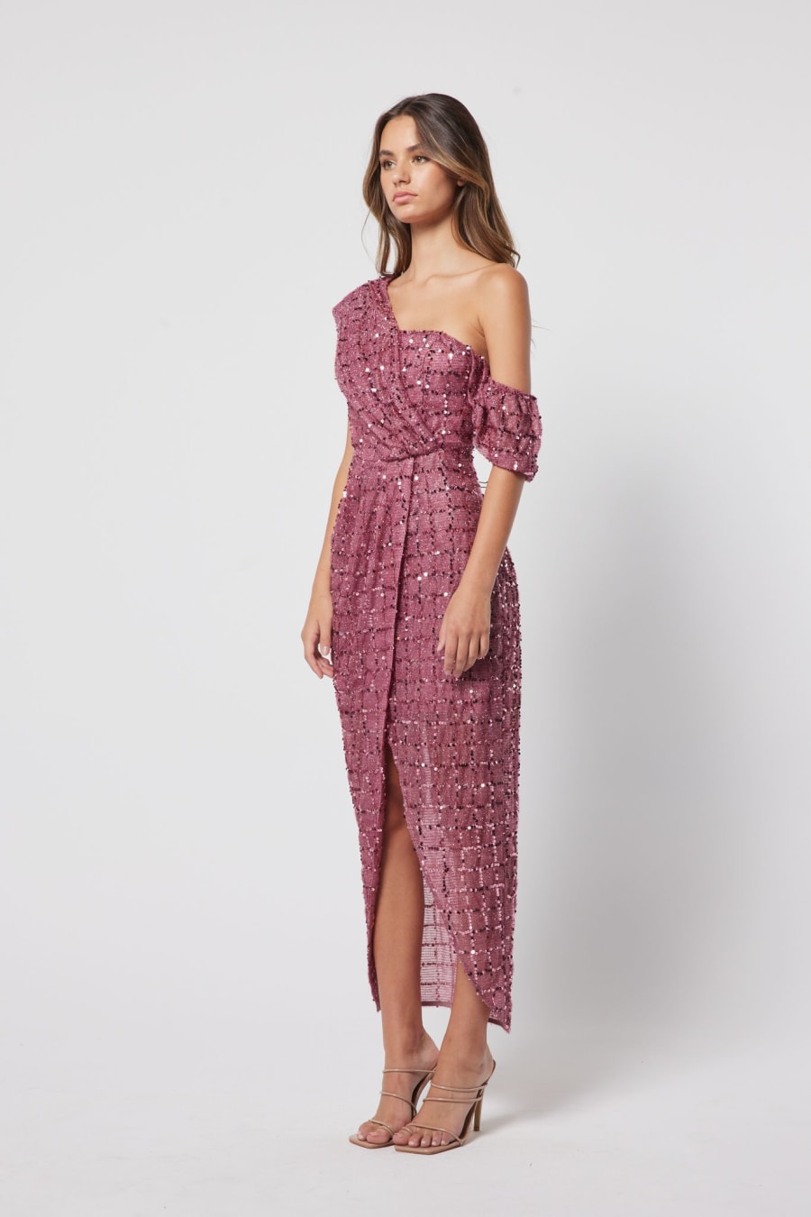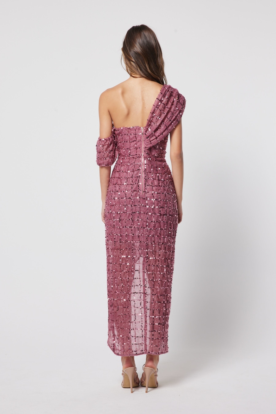 A sophisticated choice for evening events, the Esther dress will sparkle into the night. Imaginatively tailored, the dress wraps over the shoulder and around the arm, before skimming the figure to a split front skirt.