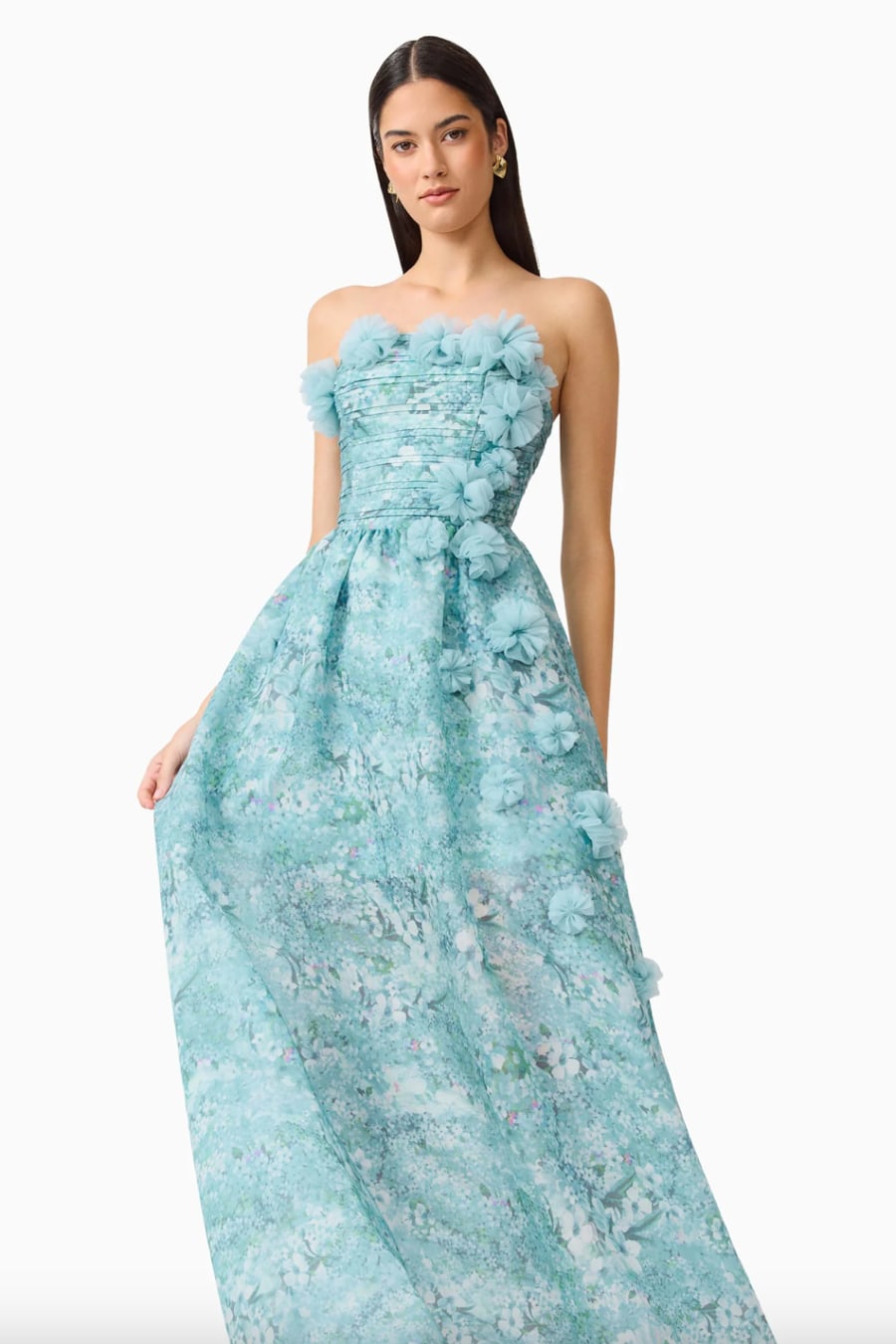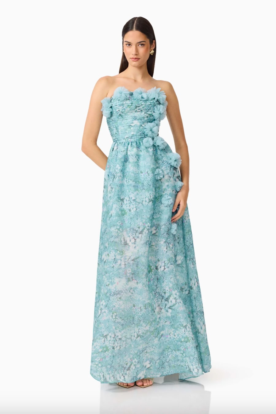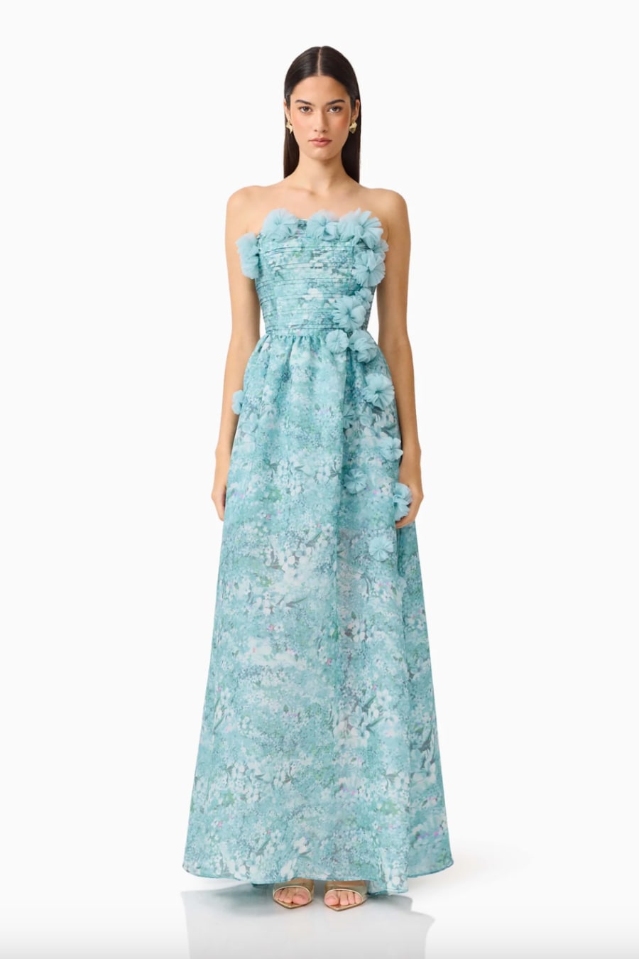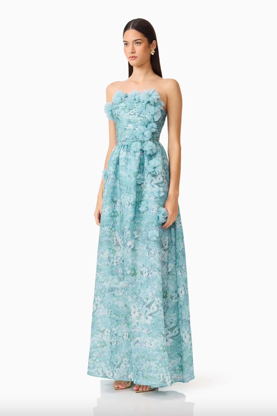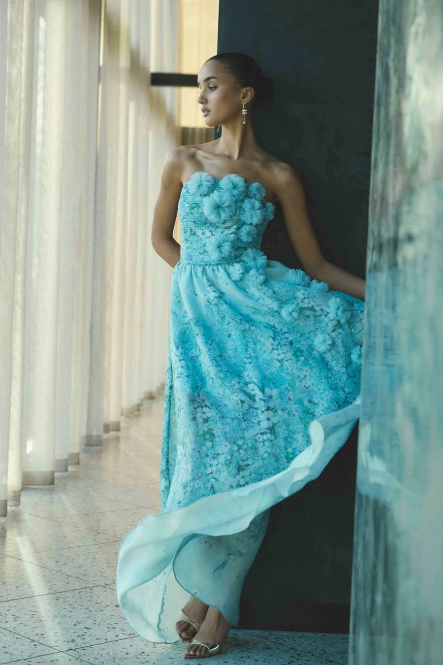 Perfect for gala evenings, black-tie occasions, or special celebrations, the Faye Strapless Gown in Blue pairs beautifully with metallic or neutral accessories for an elevated, contemporary look. The combination of structured fit, intricate floral details, and striking blue hue ensures this gown is both memorable and versatile.