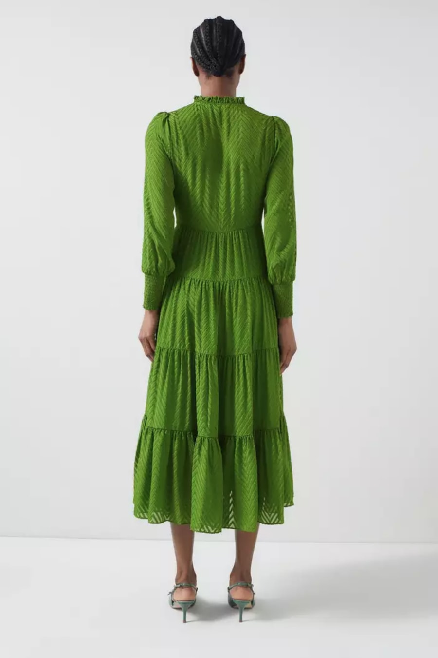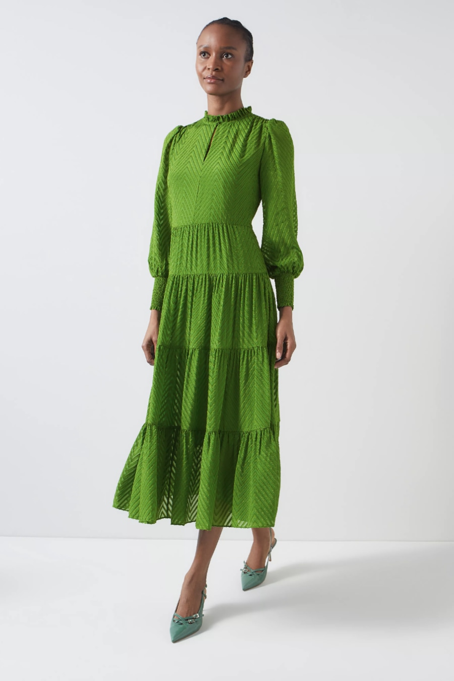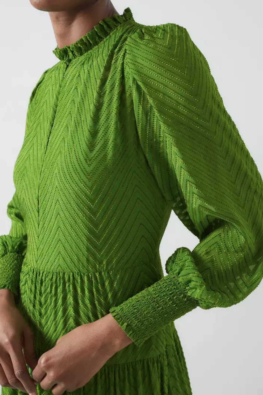 Embrace an evening of elegance with our Flora devorè dress, designed to captivate. In a striking bright green chevron devorè, this silk mix dress features a sophisticated V-neck and full length sleeves, perfect for any special occasion. Pair it with your favourite heels and statement earrings for a flawless look.