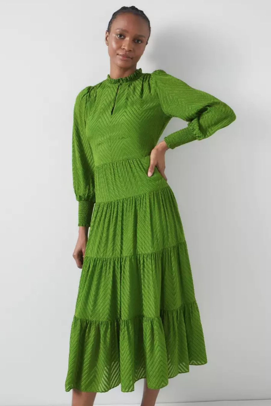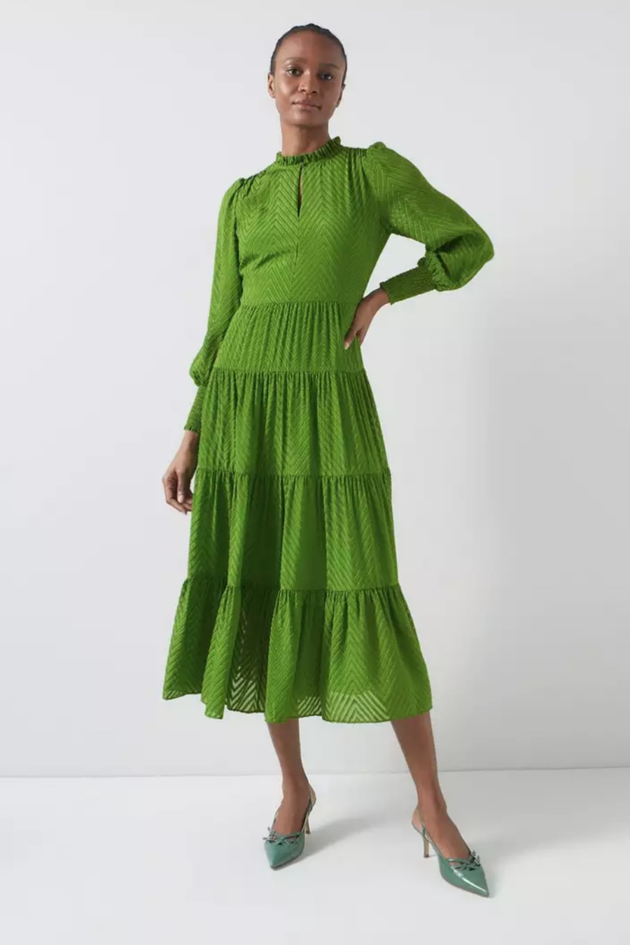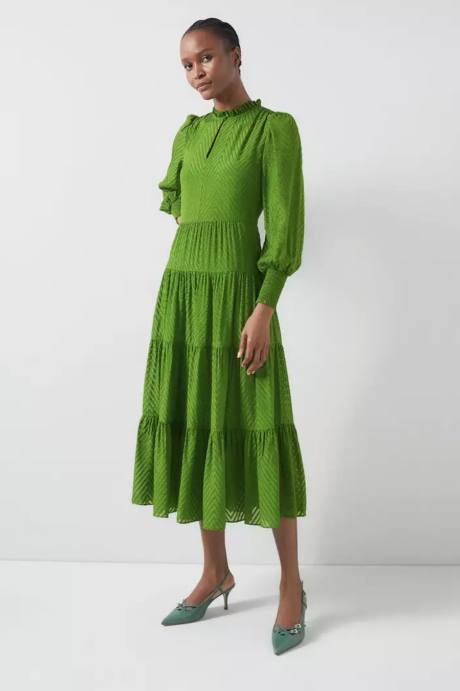 Embrace an evening of elegance with our Flora devorè dress, designed to captivate. In a striking bright green chevron devorè, this silk mix dress features a sophisticated V-neck and full length sleeves, perfect for any special occasion. Pair it with your favourite heels and statement earrings for a flawless look.