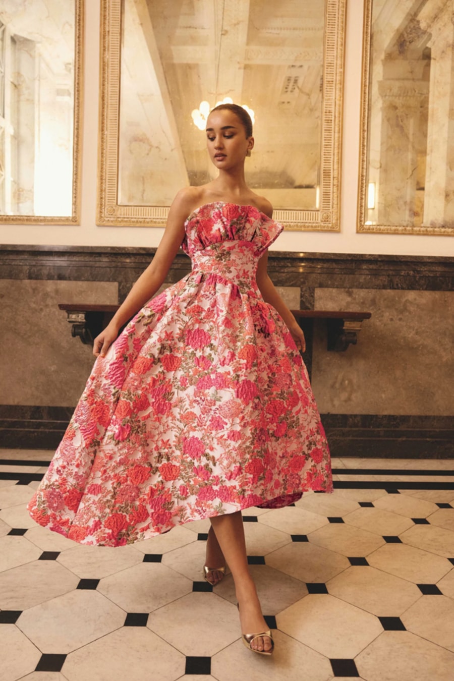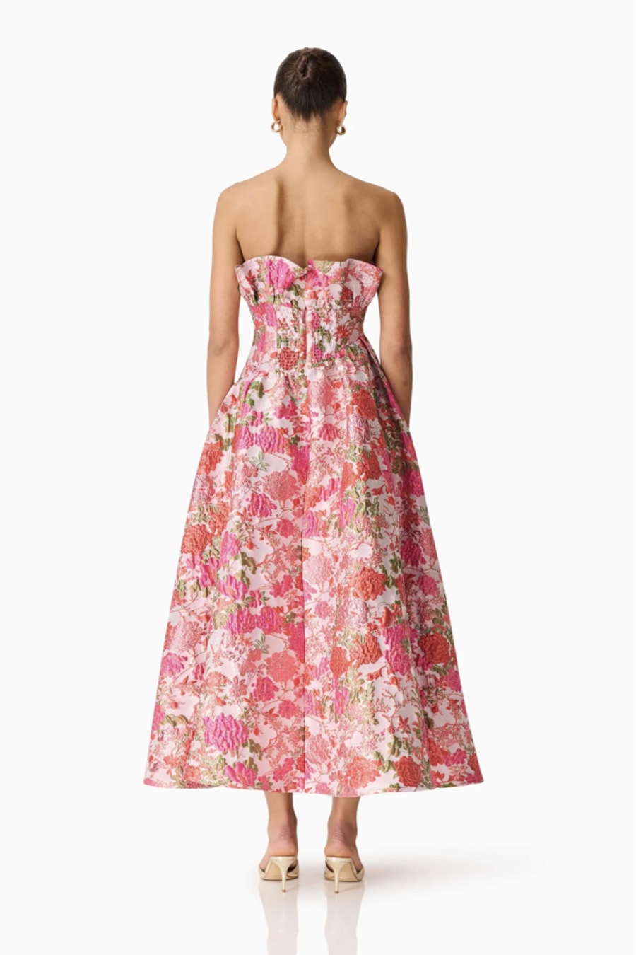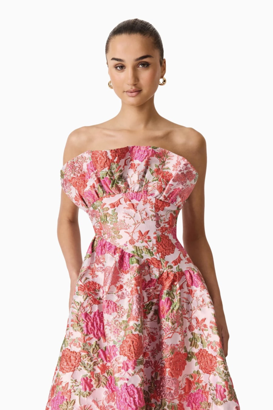 Inspired by the best-selling Laurel, the Floralie Strapless Gown is a refined statement piece designed for elevated occasions. Crafted in a richly textured pink floral jacquard, this gown balances romantic detailing with a modern, structured silhouette.