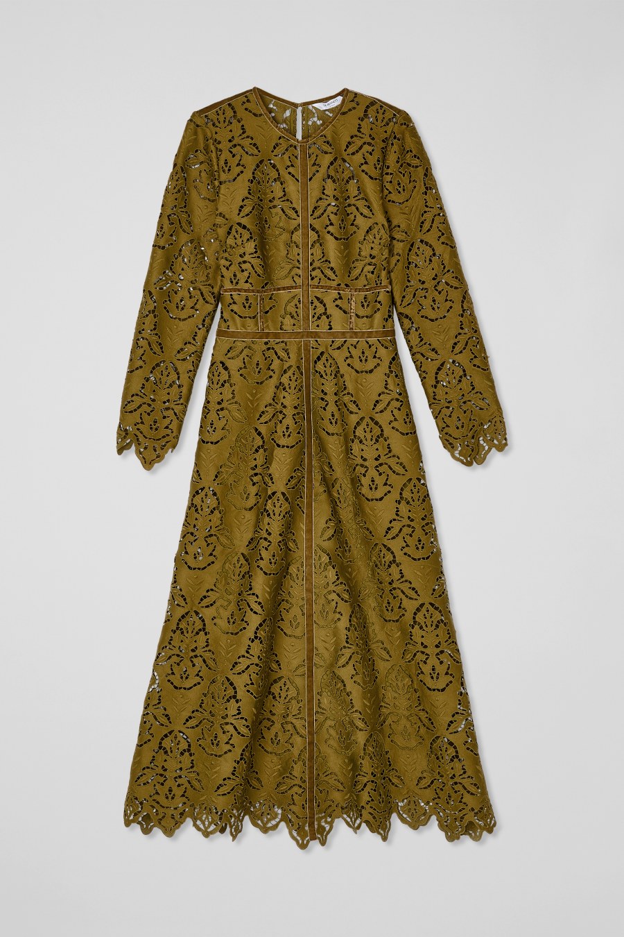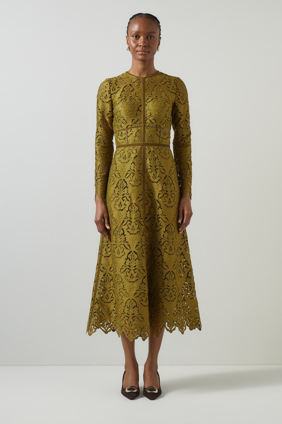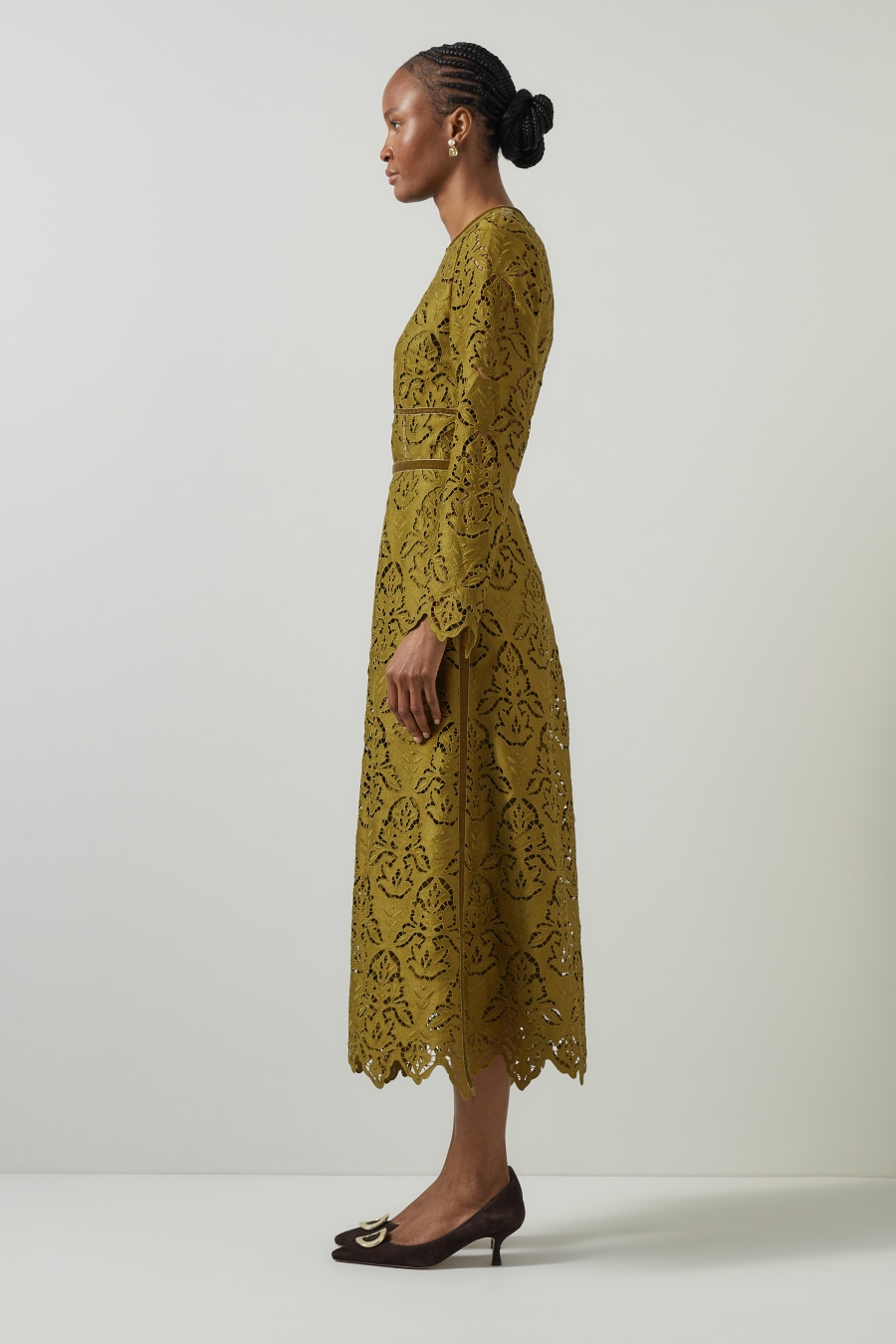 Experience elegance with the Gracie velvet trimmed lace dress in a stunning green. Featuring intricate embroidery cutwork, a velvet ribbon, back zip, and crafted from quality fabric with a floral design and full length sleeves. Perfectly pair it with your favourite heels for an enchanting evening look.