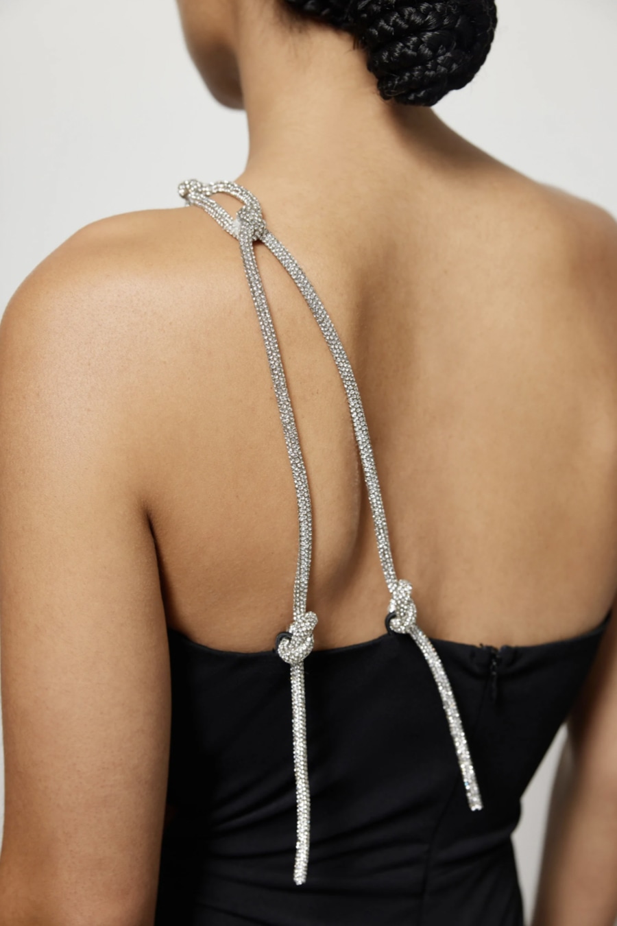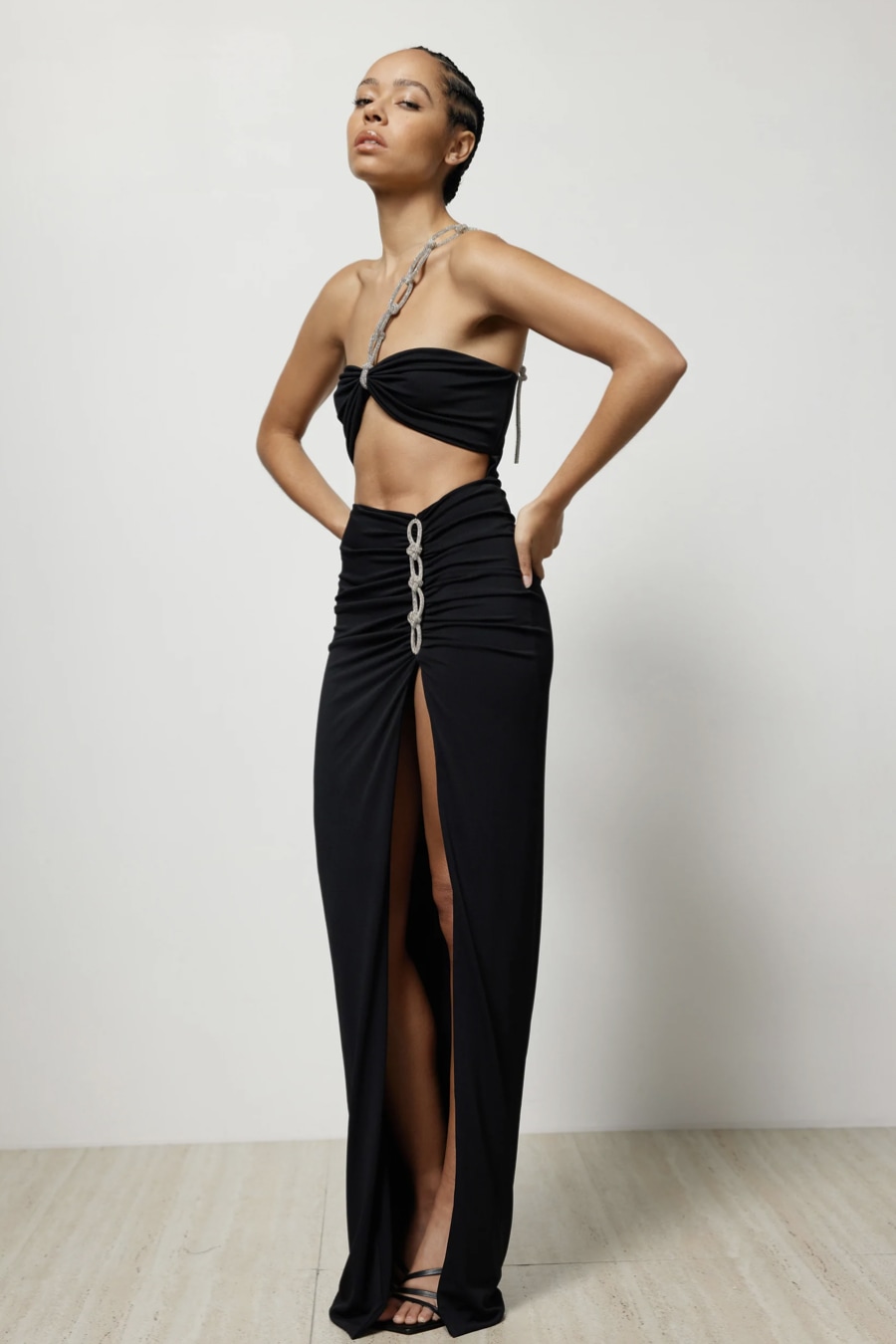 The Halo Dress is the ultimate statement piece featuring diamante chain detailing across the hip and shoulder strap. Crafted from a soft stretch jersey, this style showcases a sexy exposed midriff and flattering ruching across the body, leading to a thigh high split. The perfect glamorous gown.