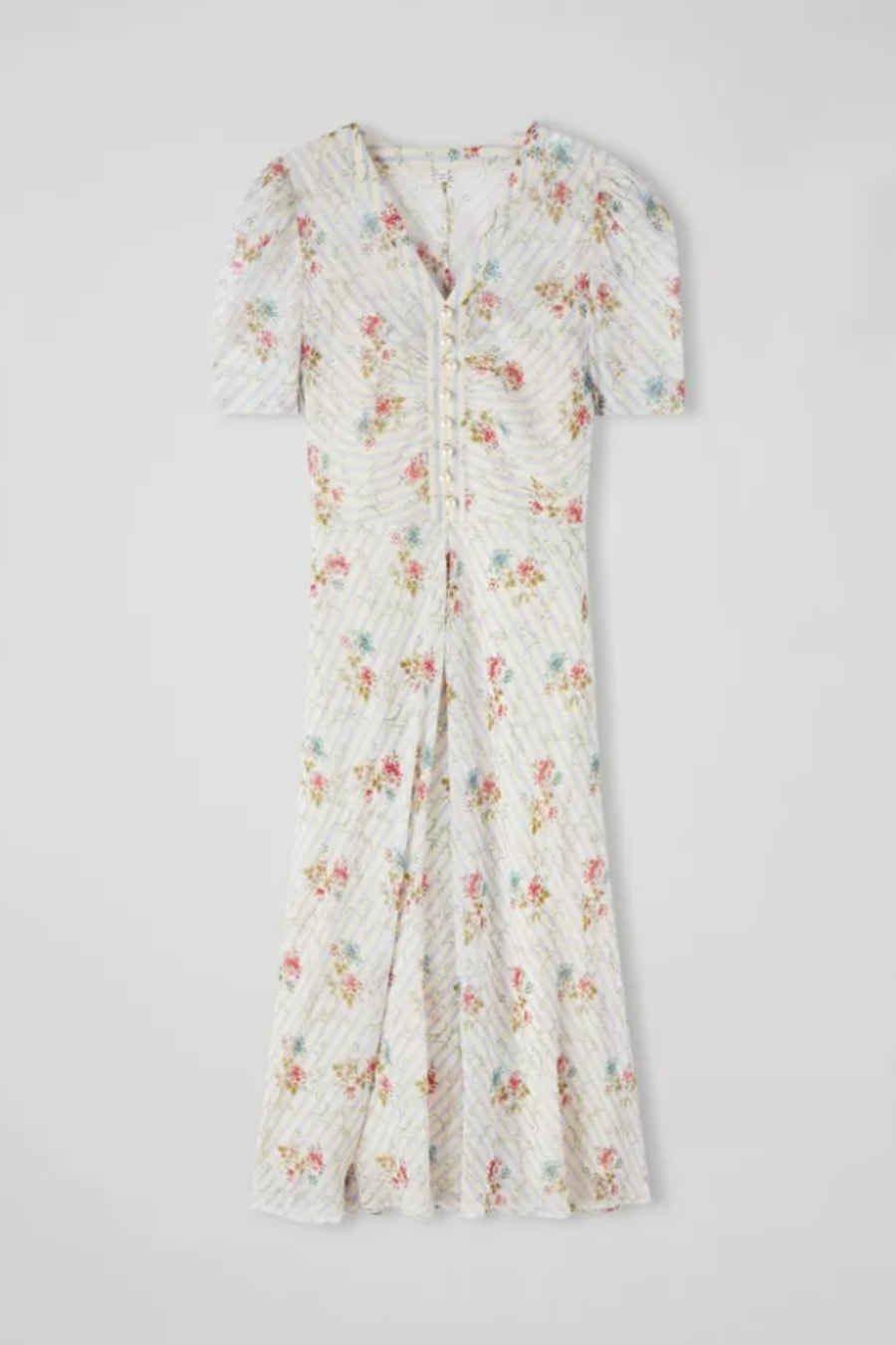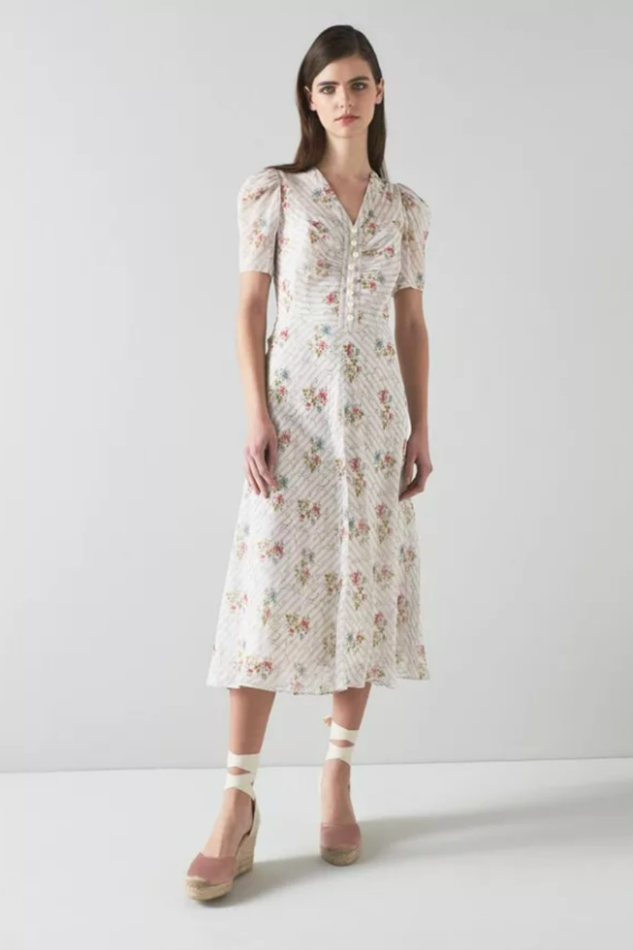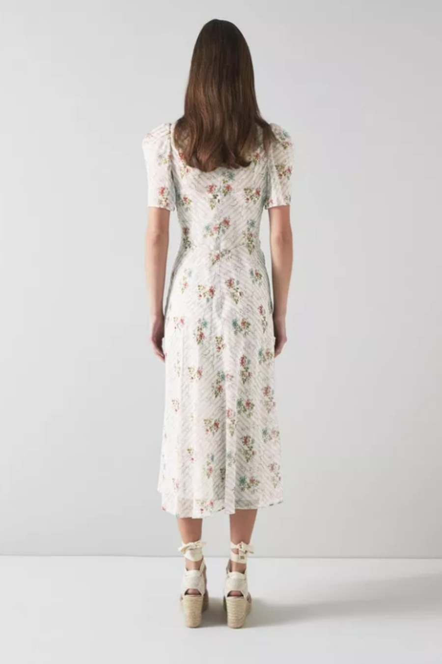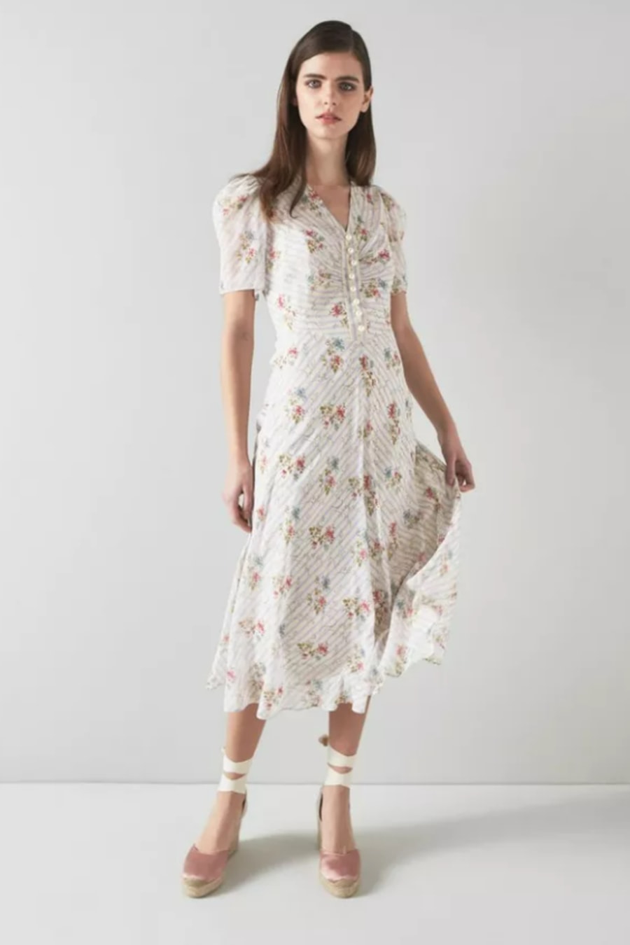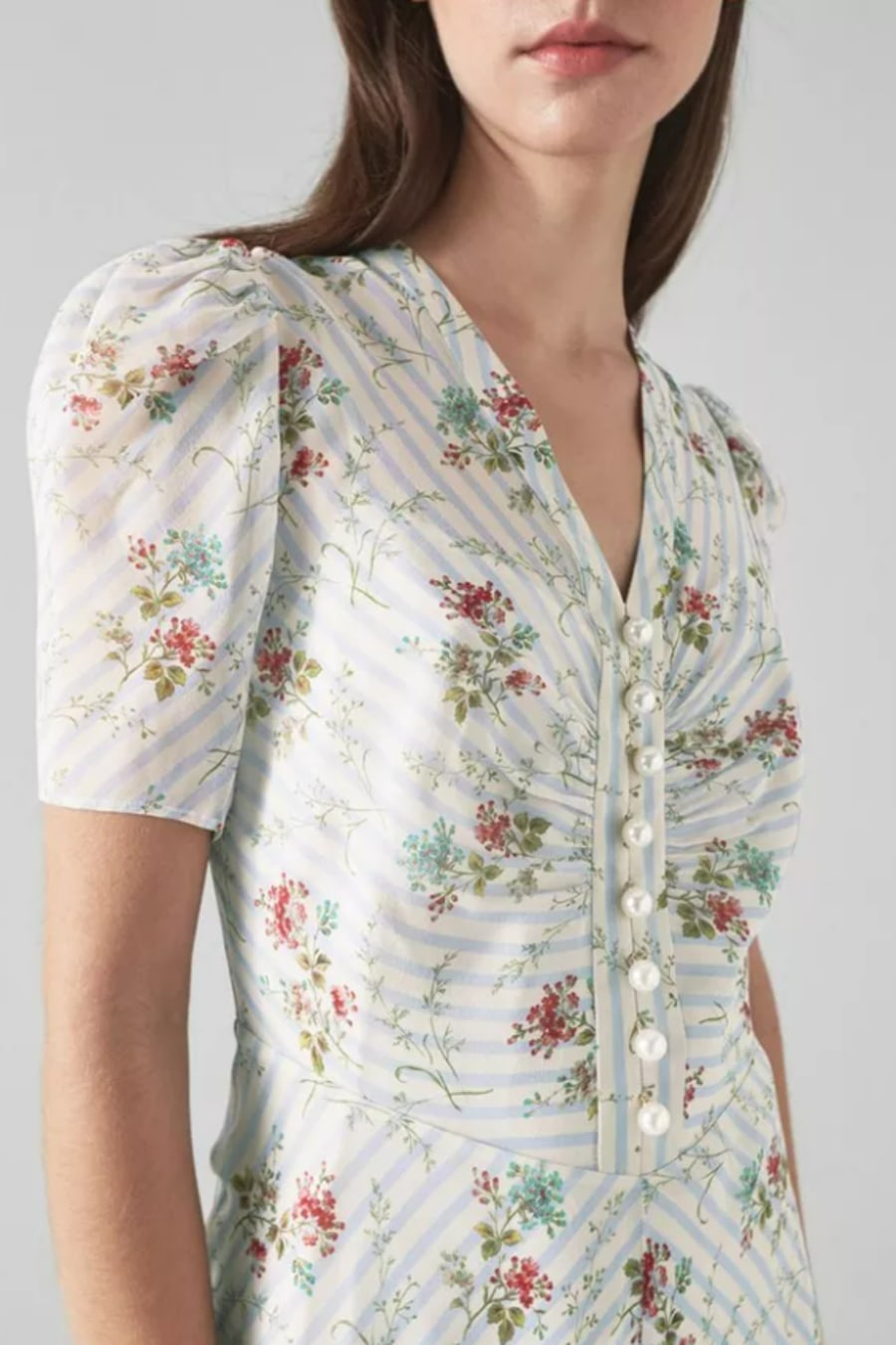 An LKB favourite, our Holzer midi dress was designed with occasions and events in mind. Crafted from luxurious silk in a cream and blue stripe with a pretty wildflower print layered over the top, this beautiful, Thirties-inspired dress has short sleeves with subtle pleating at the shoulders, a ruched V-neck, oversized pearl buttons and a long floaty cut. Wear it with platforms or espadrilles when it's time to celebrate.