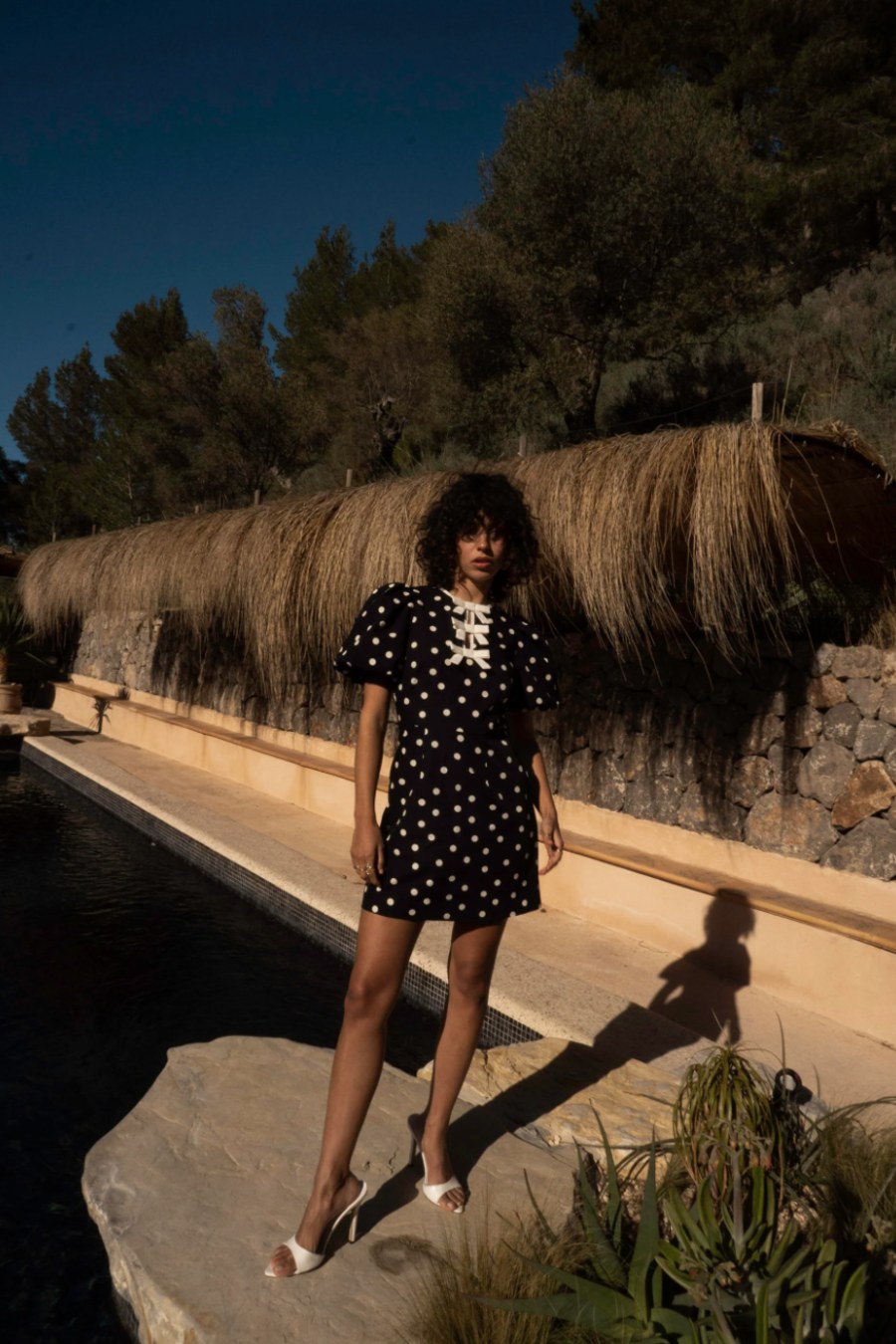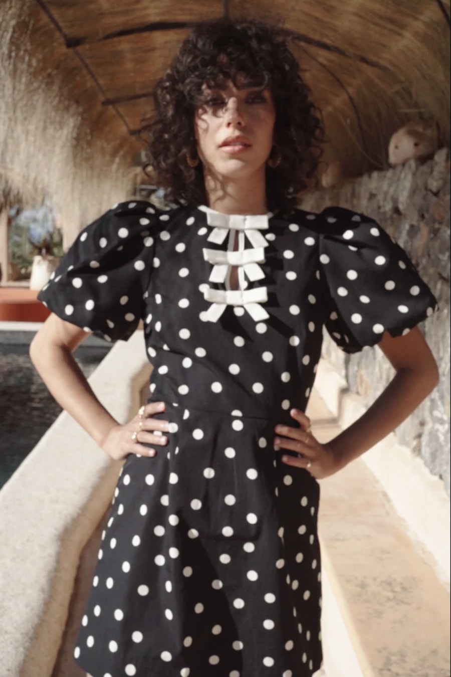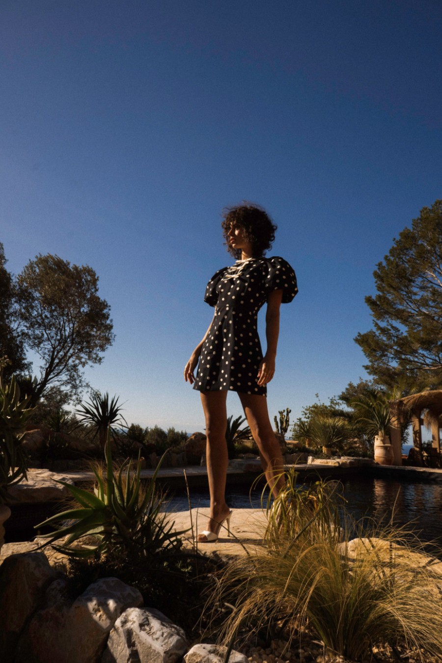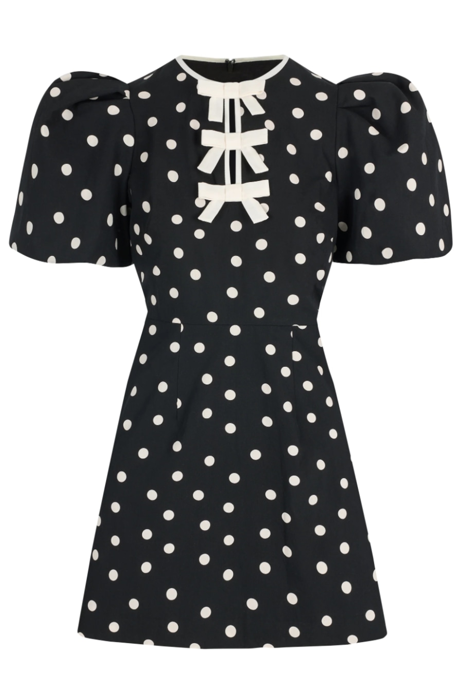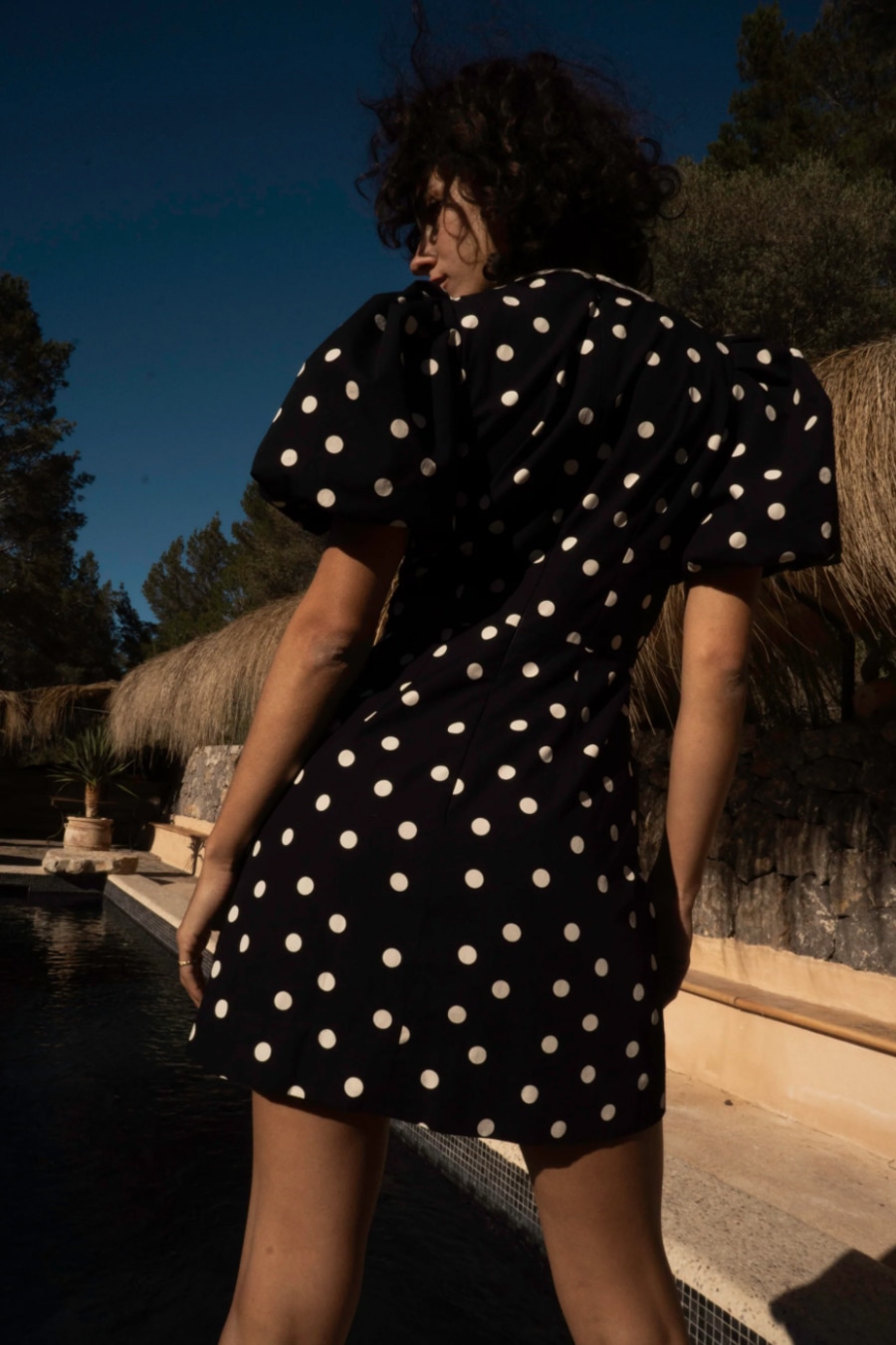 A nod to the 60s with her A-line shape, puff ball sleeve and three bow front detail. Iris is the perfect mini for any summer event. Polka dot print brings a monochrome moment to the collection.
