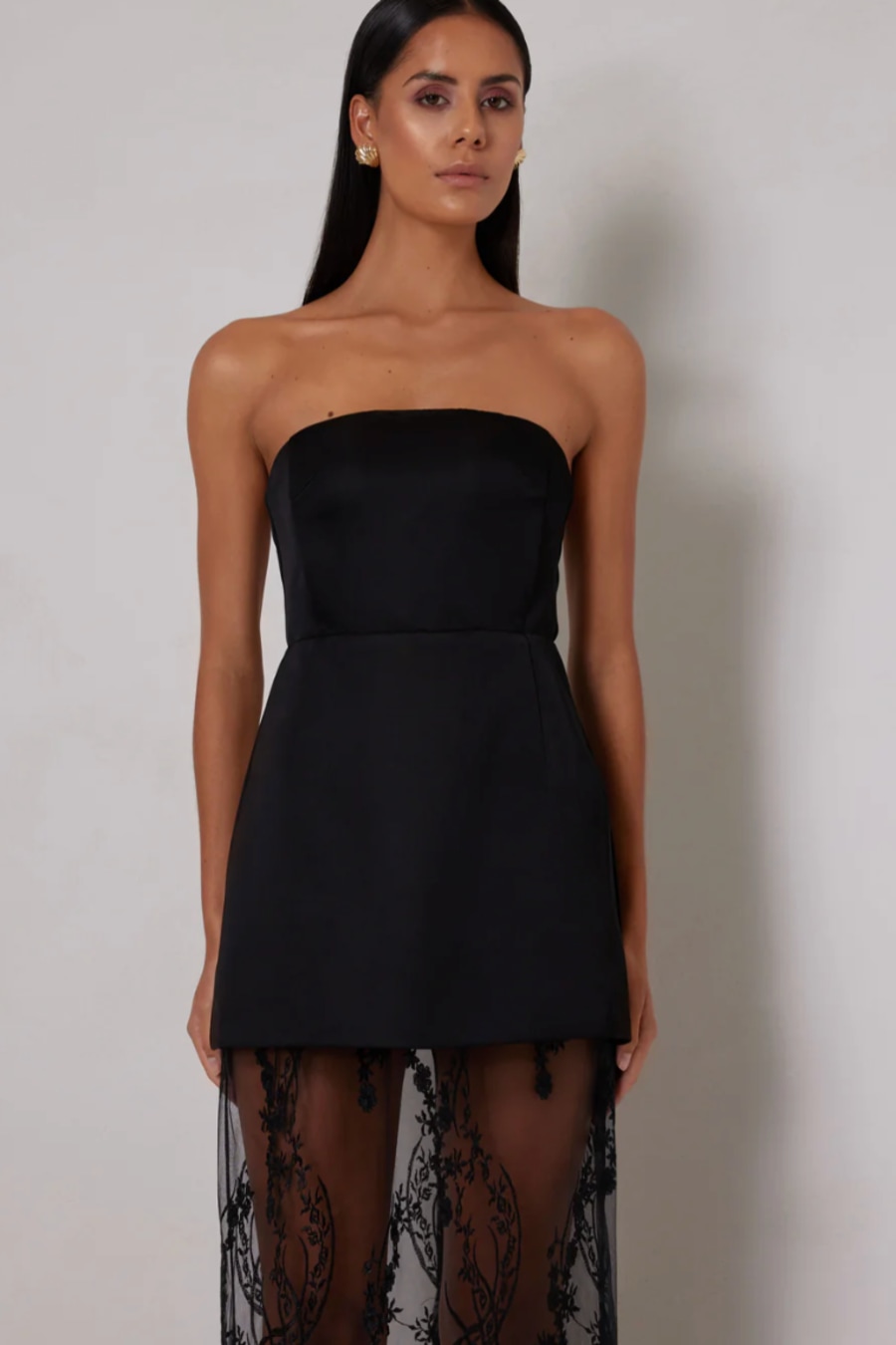 Make a bold impression in this captivating strapless dress, featuring a sleek top with a charming small bow detail at the back. The elegant design flows into a stunning sheer lace skirt, adorned with intricate detailing.