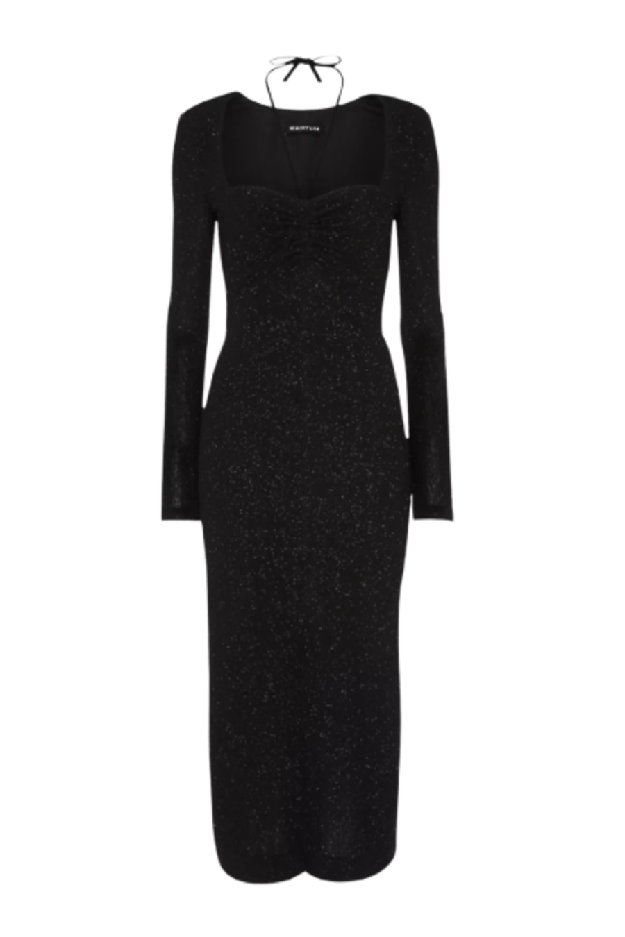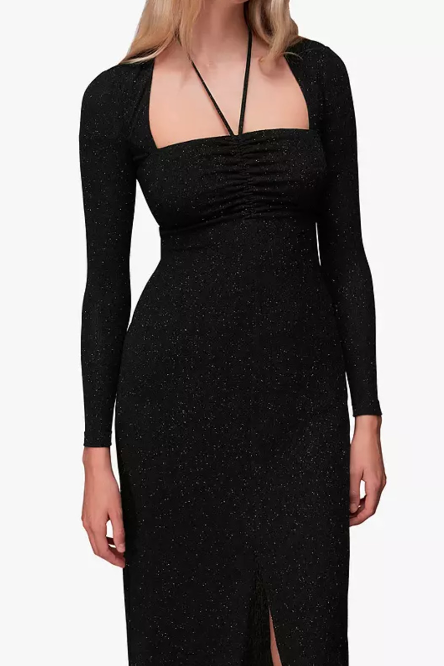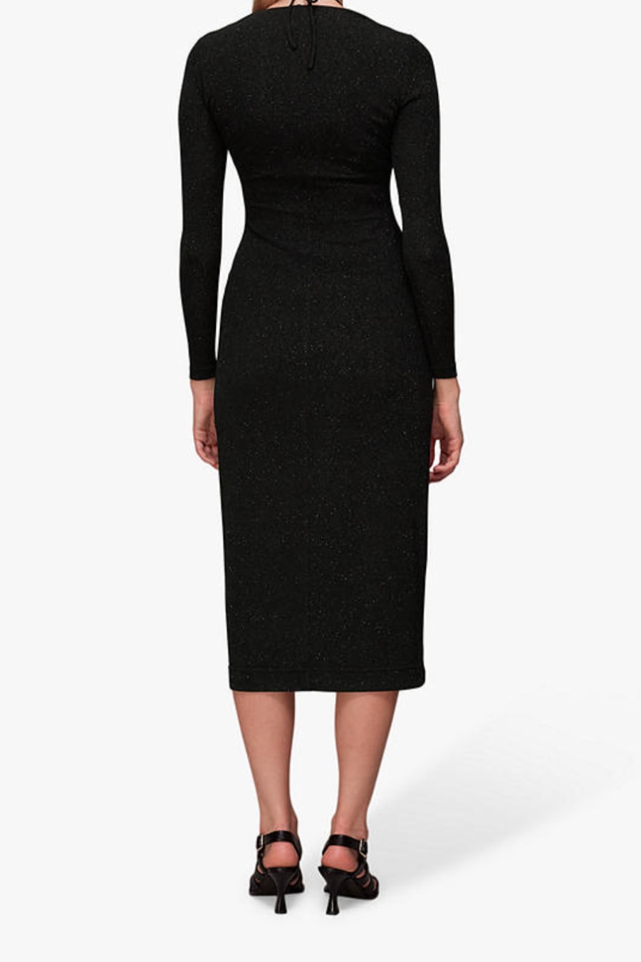 Hugging the figure in a bodycon fit, this midi dress by Whistles is fashioned with a metallic shimmer.