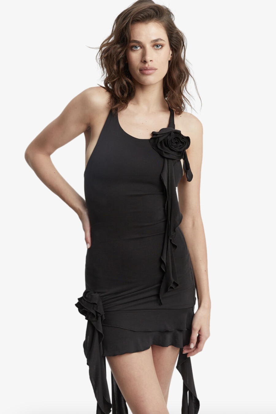 Stop traffic. The Jinx Knit Mini Dress is a playful style with a fitted silhouette, fabric flowers at the shoulder and body, an open back, and hanging ruffles at the hem. The classic black hue is timeless and classic. Ideal for parties.