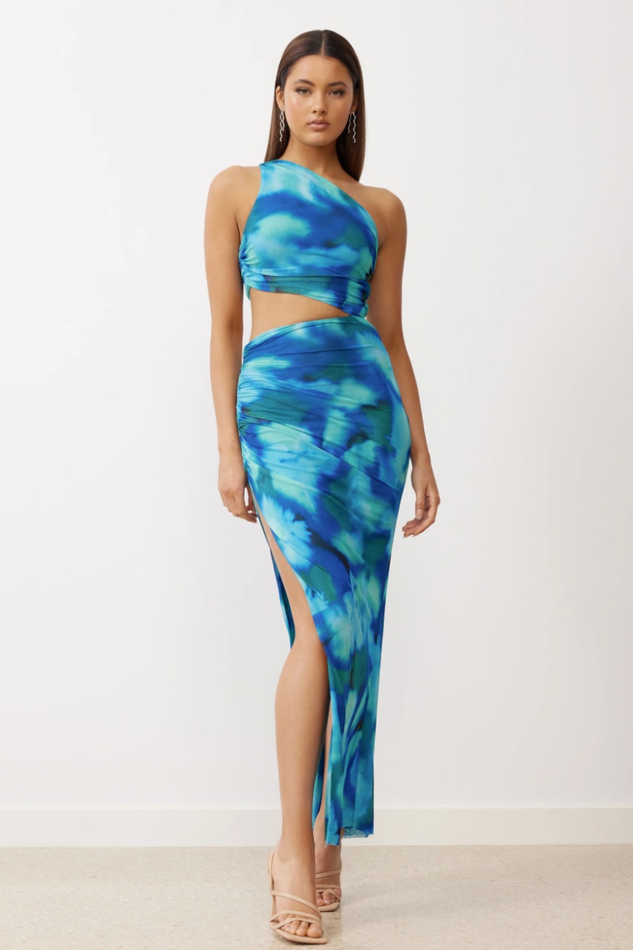 The Kai Dress is crafted from our super soft stretch printed mesh and showcases a one shoulder design with a thigh high split at the right hand side seam. The bodice and skirt feature delicate ruching at the side seam, perfectly paired with a waist cut out, to flatter the body in all the right places.