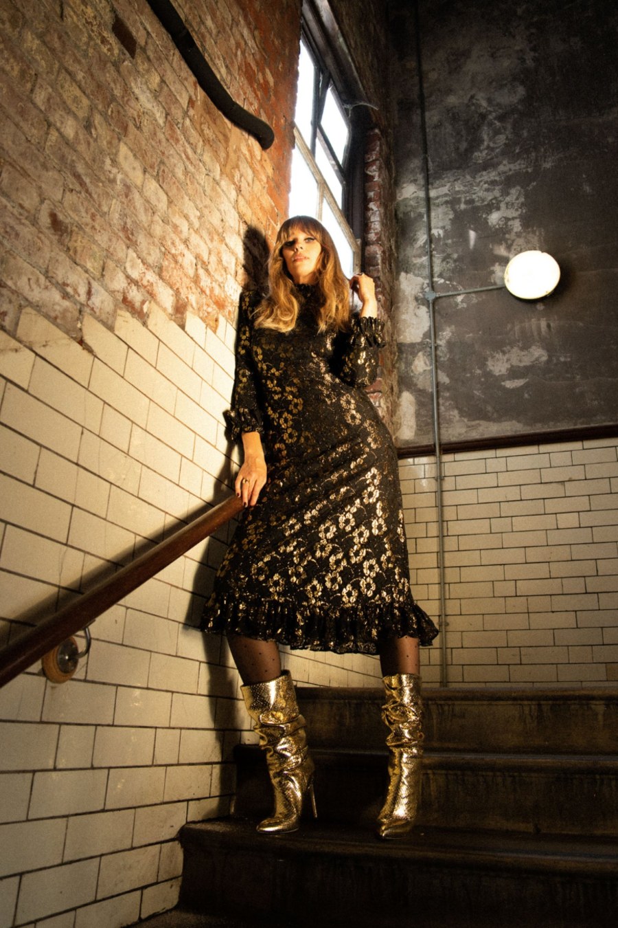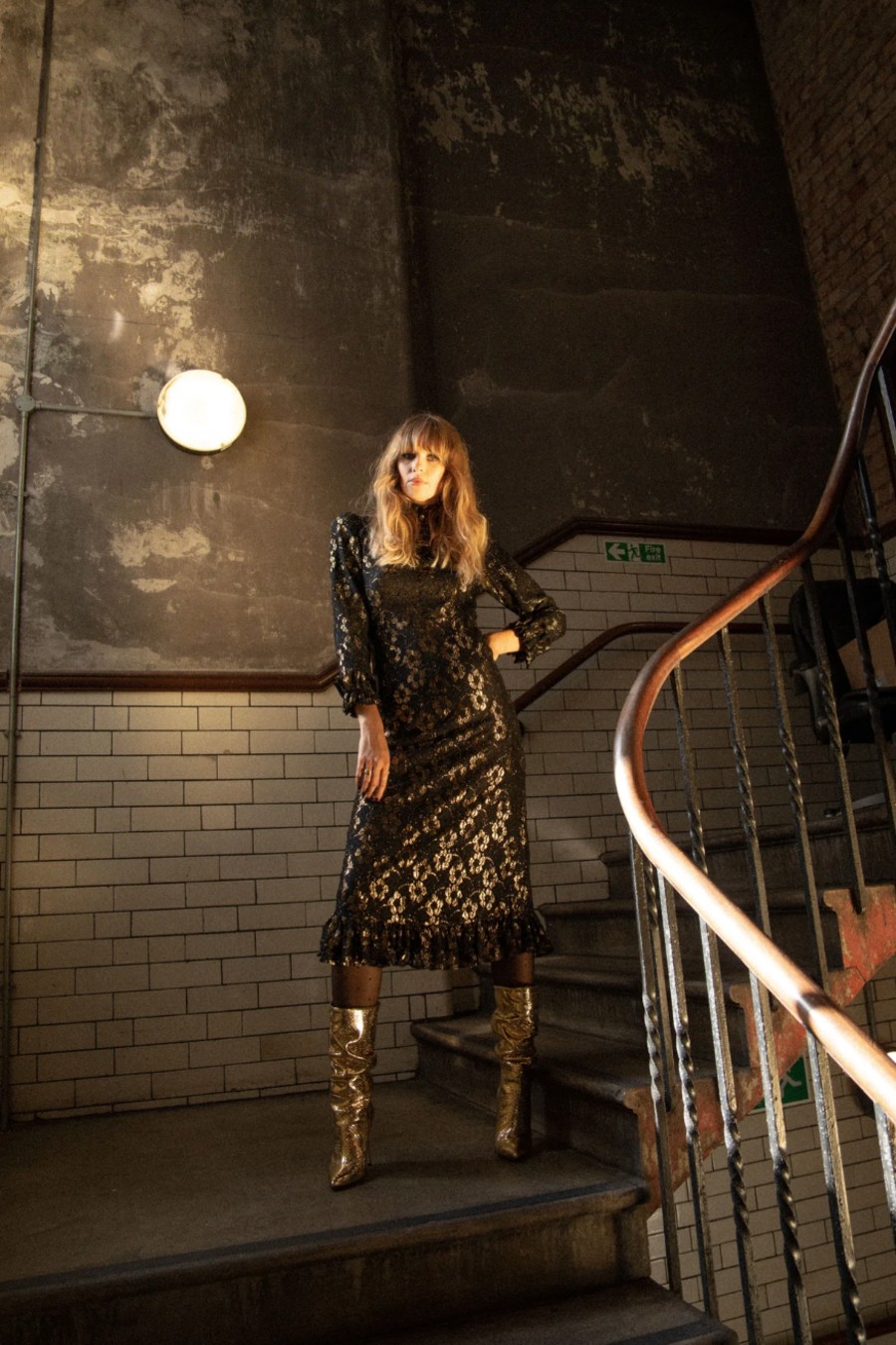 Let us introduce you to the delectable Lacy, a mix of magical lace and metallic florals giving an air of cool grace. Details galore with a frill hem & cuffs, high ruffle neck and puff shoulders to give the most flattering of silhouettes.