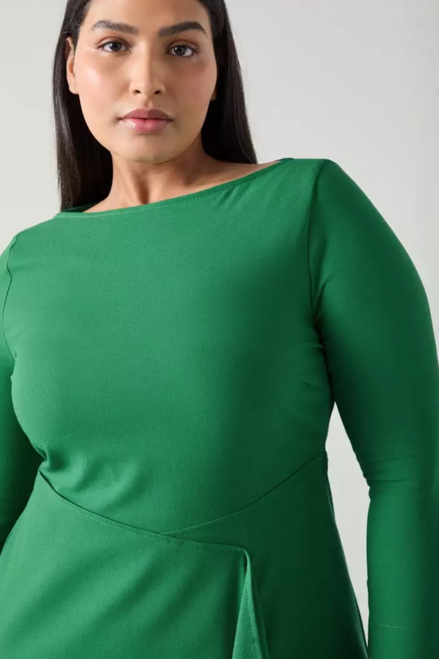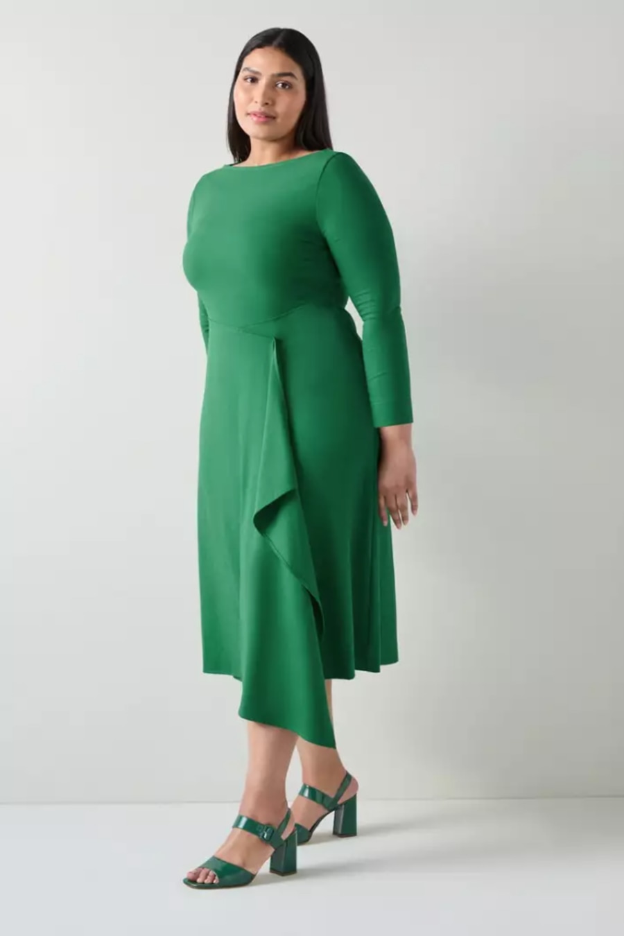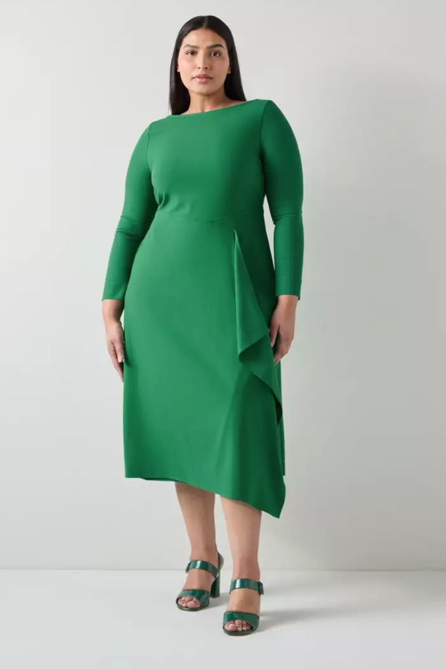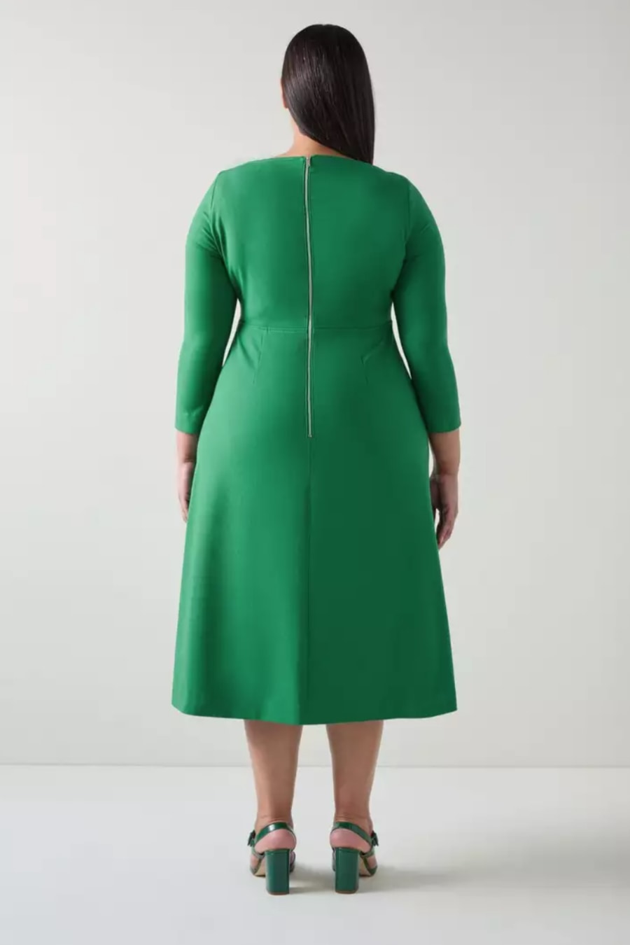 Always present in an LKB collection, a great fit and flare dress is a timeless style every wardrobe needs - especially in a bold colour to keep things interesting. Our Lena dress is crafted in Europe from a stretch crepe in verdant green. It has a wide neck, three-quarter sleeves with slit cuffs, an exposed zip to the back, a shapely silhouette and a midi-length skirt with asymmetric waterfall detail. So simple to style, wear it with boots now and courts later.