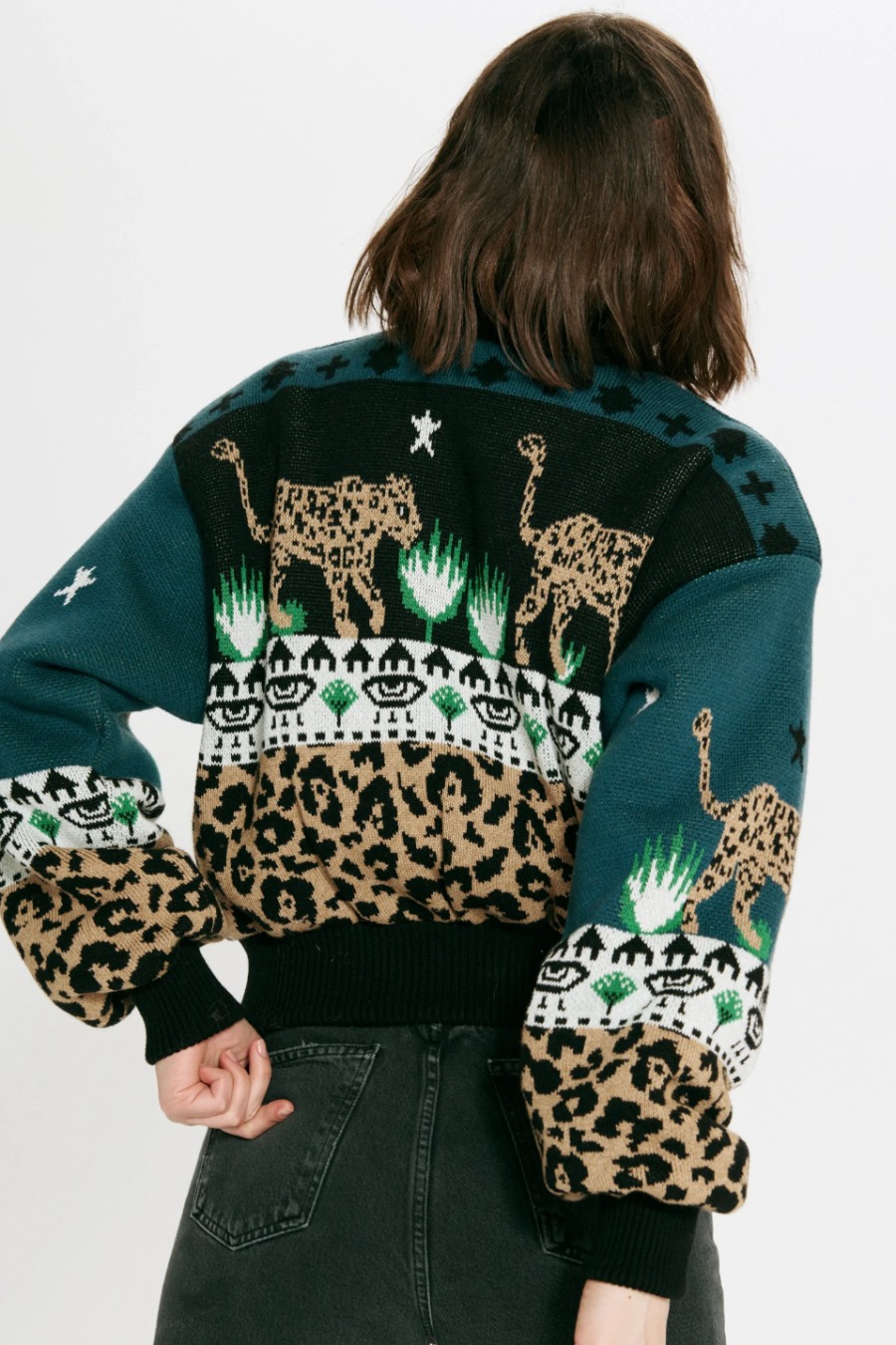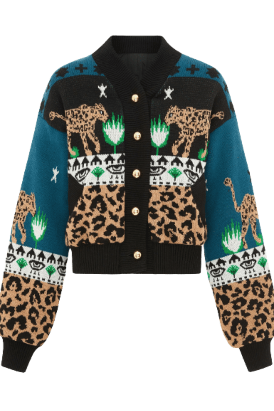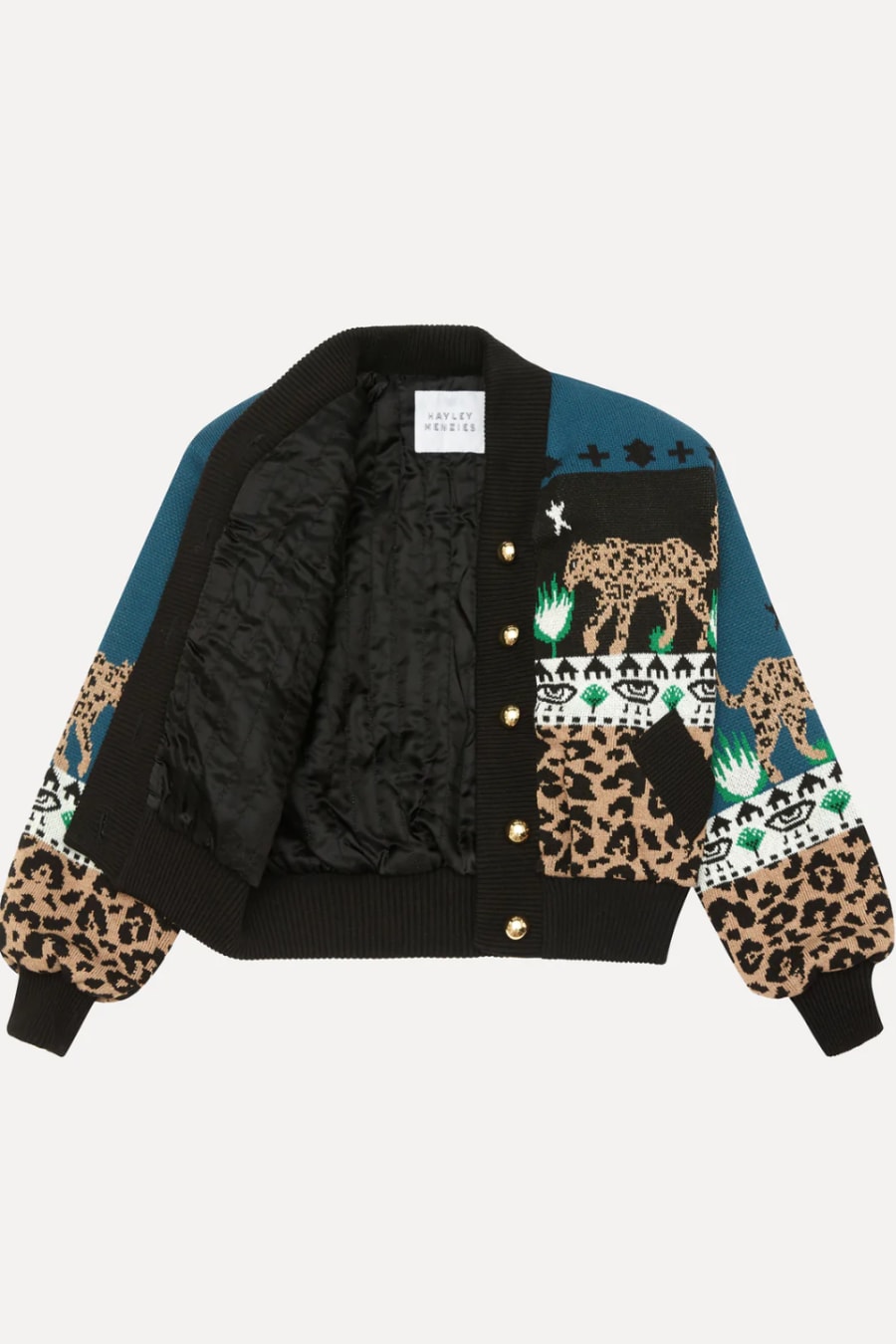 Live your life in leopard. This signature house print combines Hayley’s love of felines with a trip she took to Morocco. The blue leopardess and palm trees add an exotic touch to this retro oversized fit – a first foray into outerwear that took a total of 6 hours to complete. Knitted using a jacquard technique from soft cotton and merino wool. It comes fully lined in padded quilting, and is finished with pockets, ribbed cuffs, collar and trim. Gold buttons elevate the look allowing you to dress it up or down for any occasion.