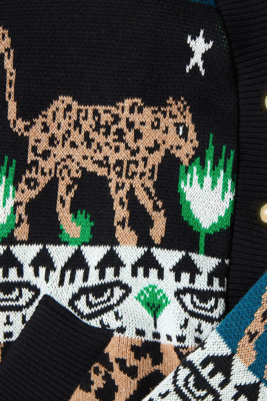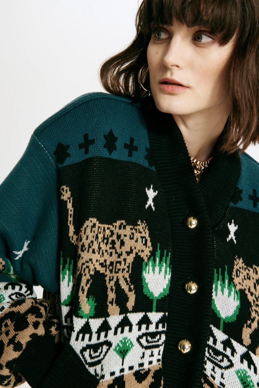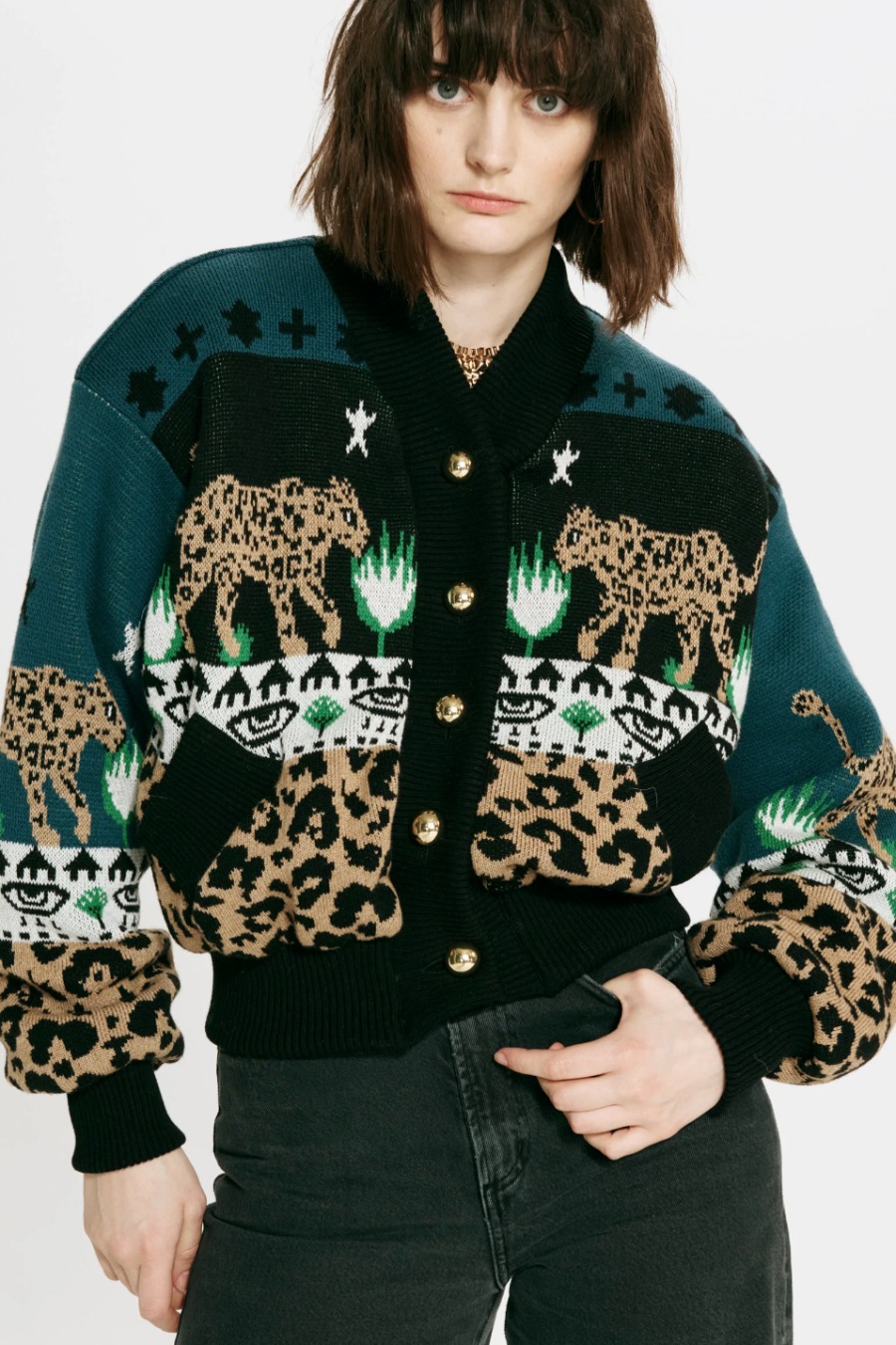 Live your life in leopard. This signature house print combines Hayley’s love of felines with a trip she took to Morocco. The blue leopardess and palm trees add an exotic touch to this retro oversized fit – a first foray into outerwear that took a total of 6 hours to complete. Knitted using a jacquard technique from soft cotton and merino wool. It comes fully lined in padded quilting, and is finished with pockets, ribbed cuffs, collar and trim. Gold buttons elevate the look allowing you to dress it up or down for any occasion.
