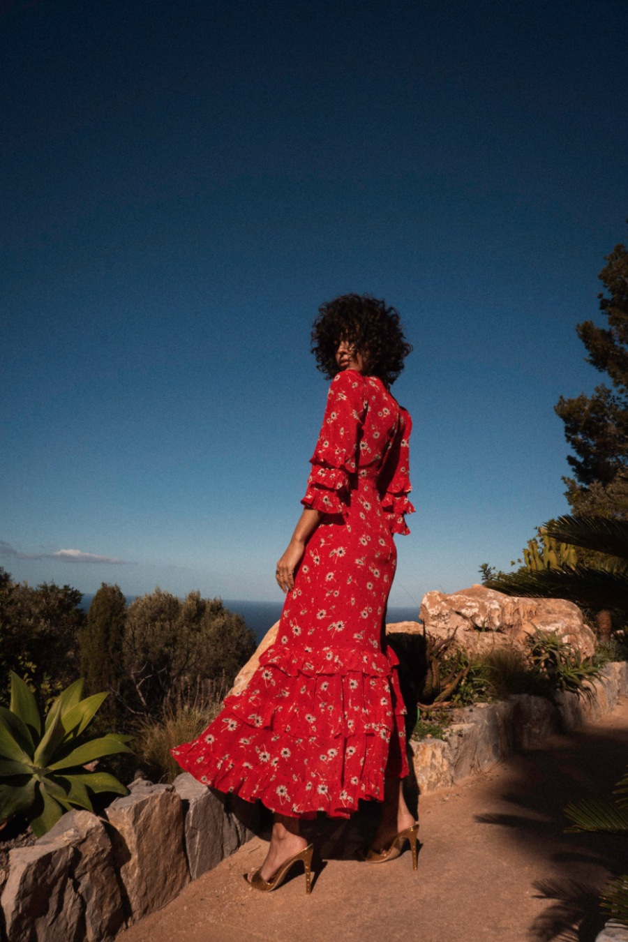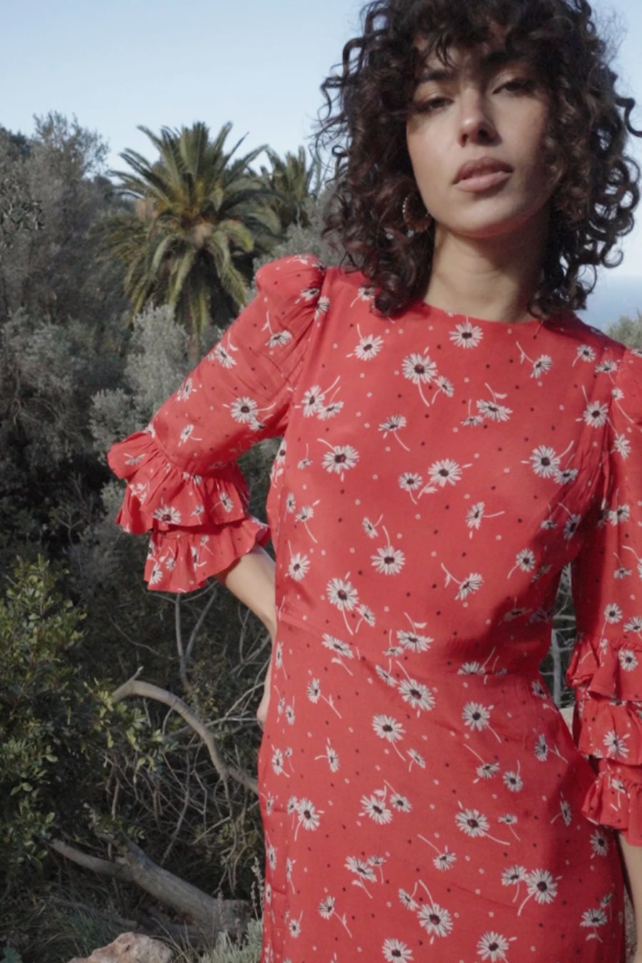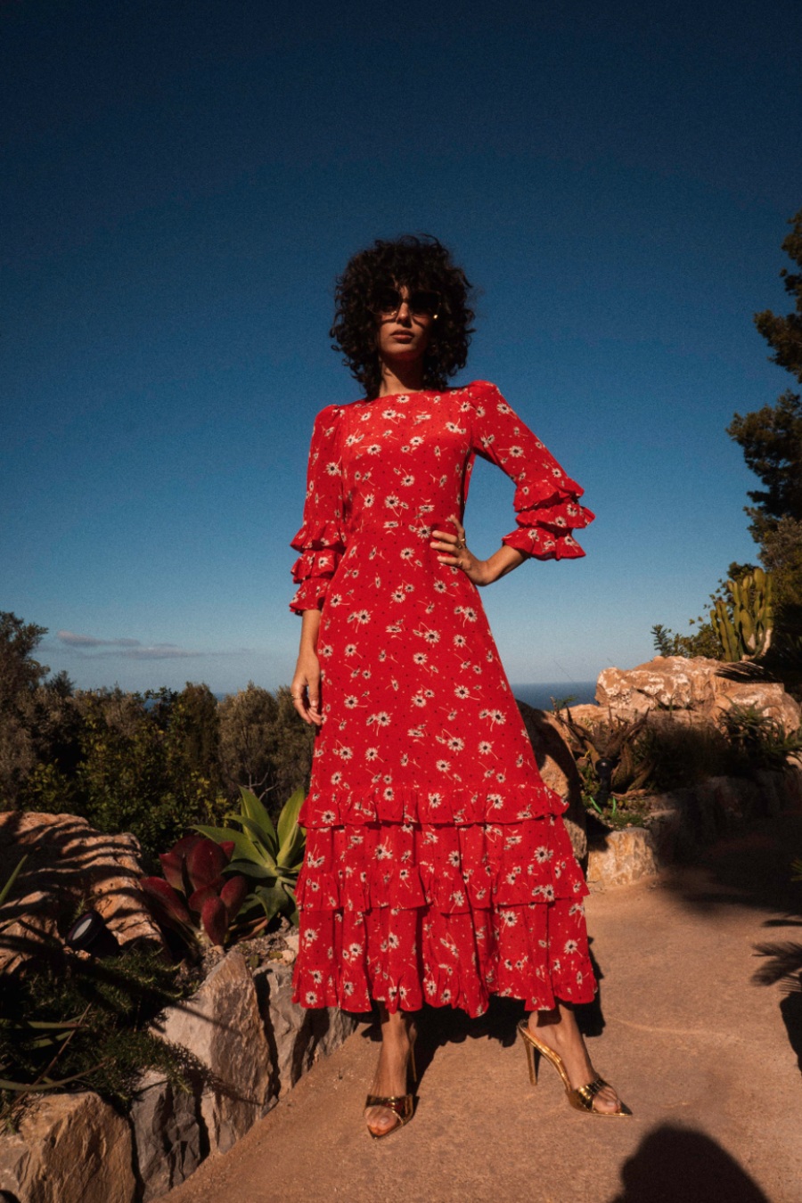 Red is always the most ravishing tone of the season, lovingly used as a base to our bespoke 40s influenced hand-drawn Daisy print. Puff shoulder with a half three tier sleeve gives amazing shape to the dress, flattering in all the right places. A pillar of your summer wardrobe.