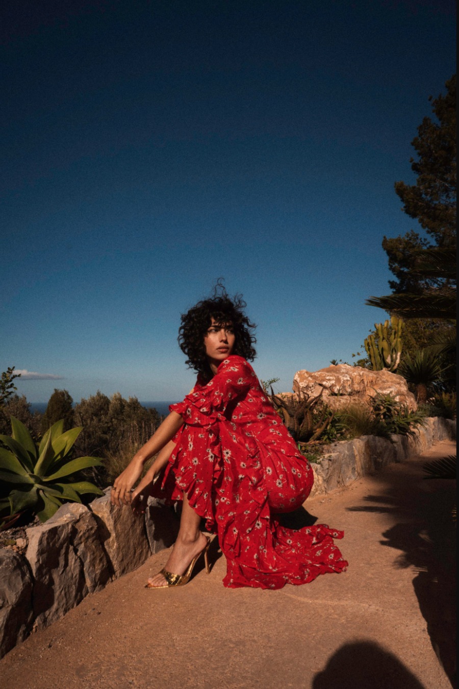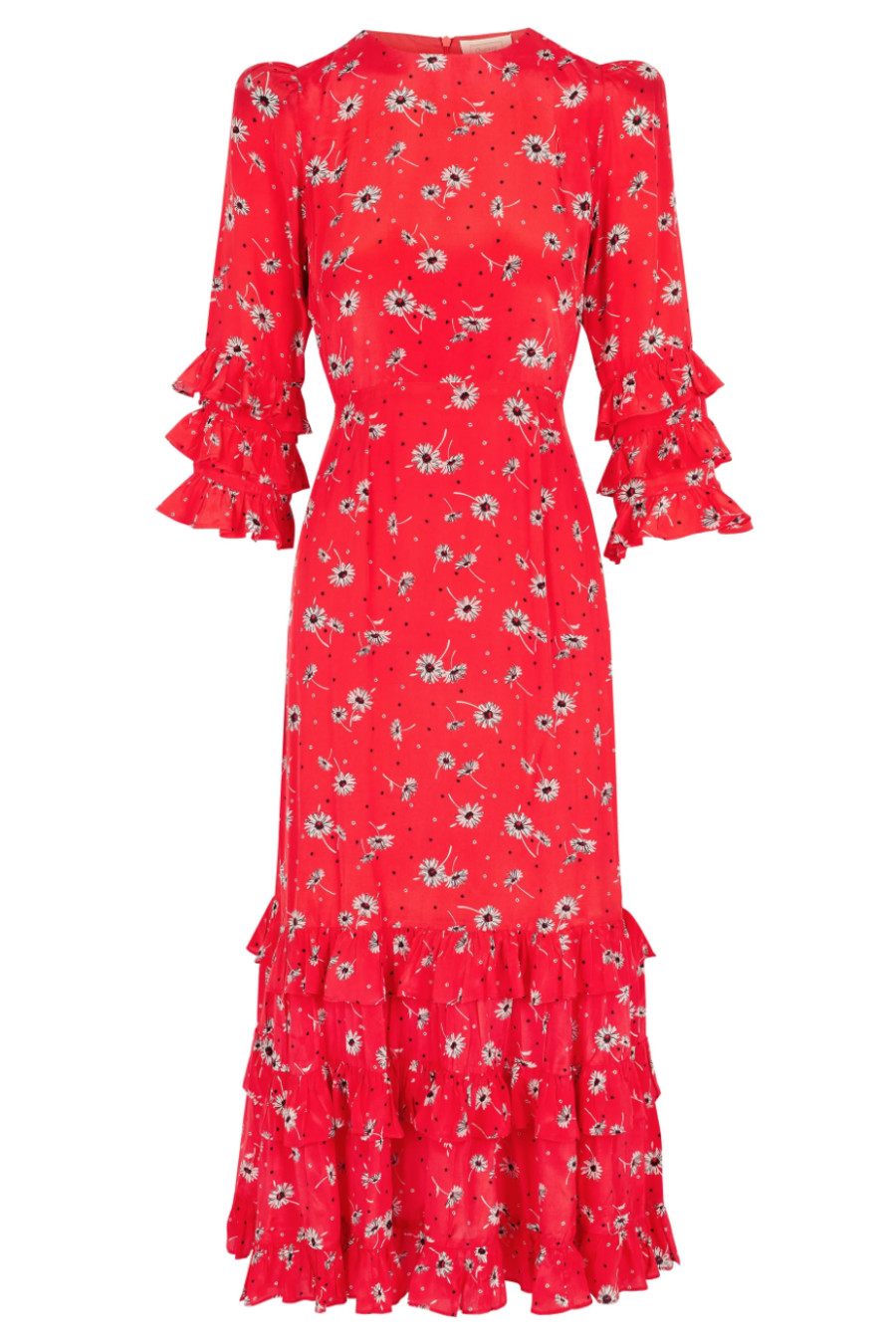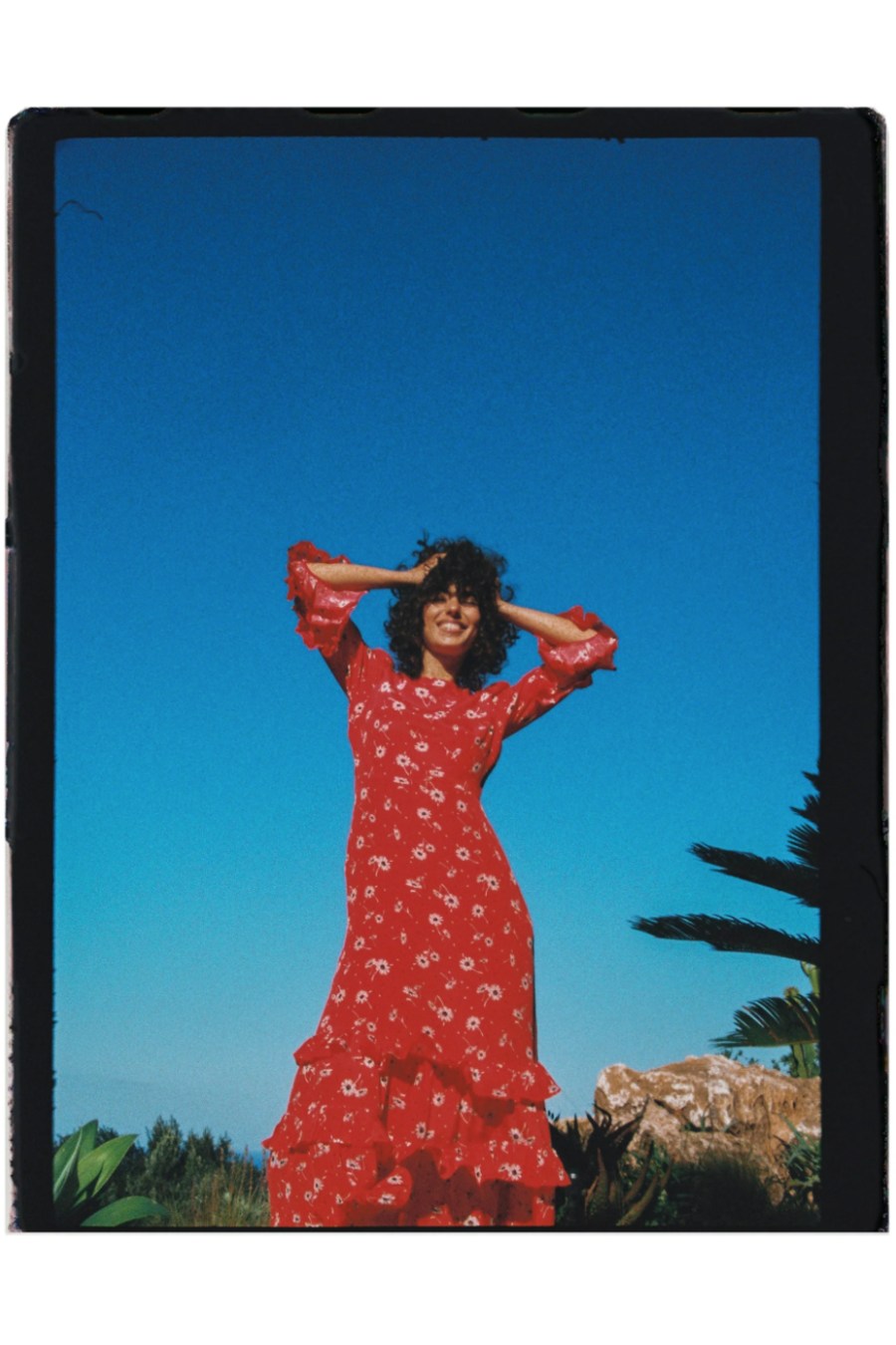 Red is always the most ravishing tone of the season, lovingly used as a base to our bespoke 40s influenced hand-drawn Daisy print. Puff shoulder with a half three tier sleeve gives amazing shape to the dress, flattering in all the right places. A pillar of your summer wardrobe.