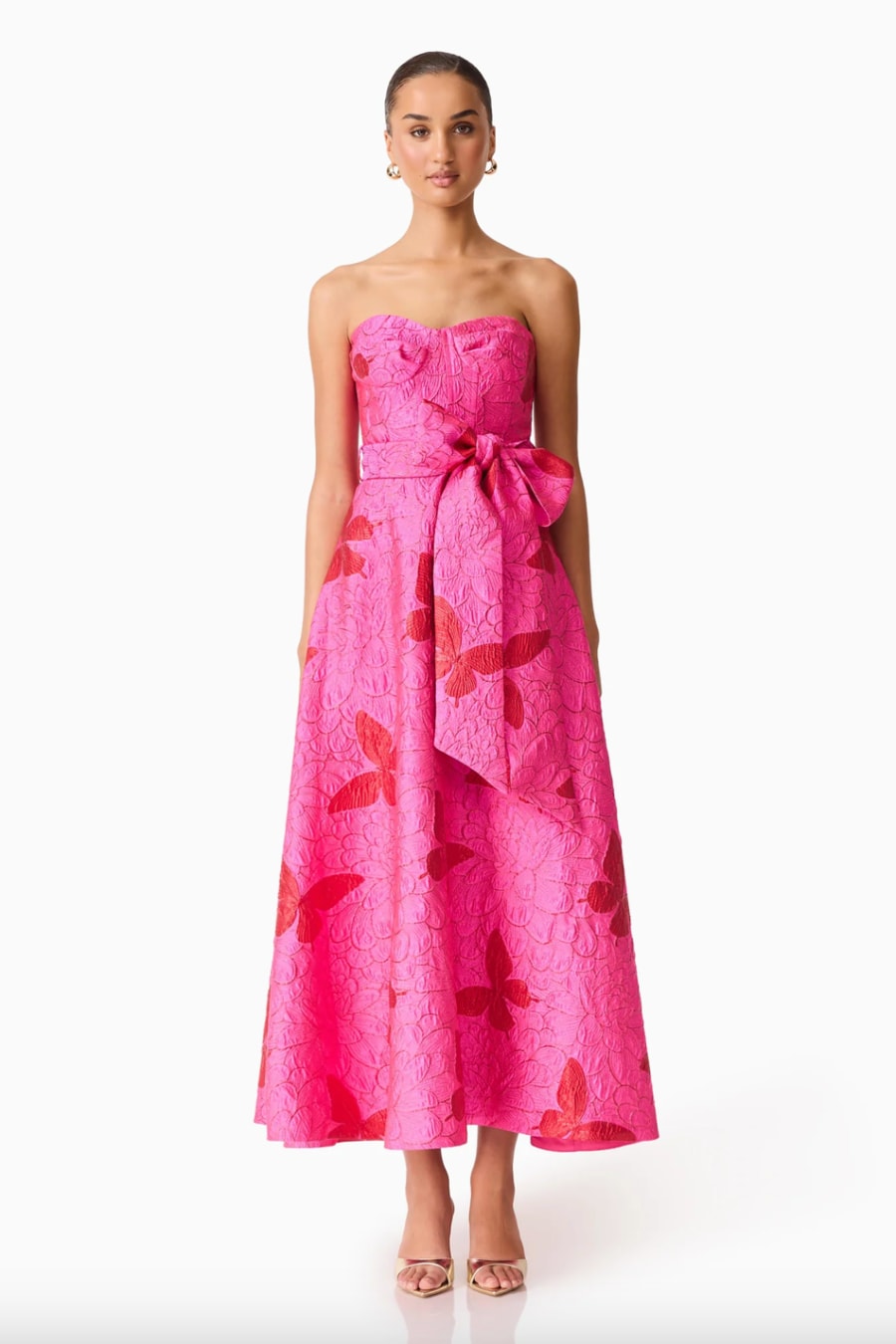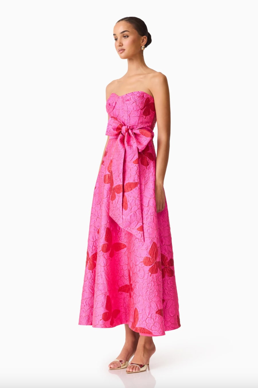 Make a striking impression in the Lorena Jacquard Strapless Gown in Pink, a sophisticated gown designed to flatter and elevate any formal occasion. Featuring a sleek strapless neckline, this gown beautifully showcases the shoulders and collarbone for a timeless, elegant look. The built-in bust cup shaping provides structure and support, enhancing the natural silhouette while maintaining comfort throughout wear.