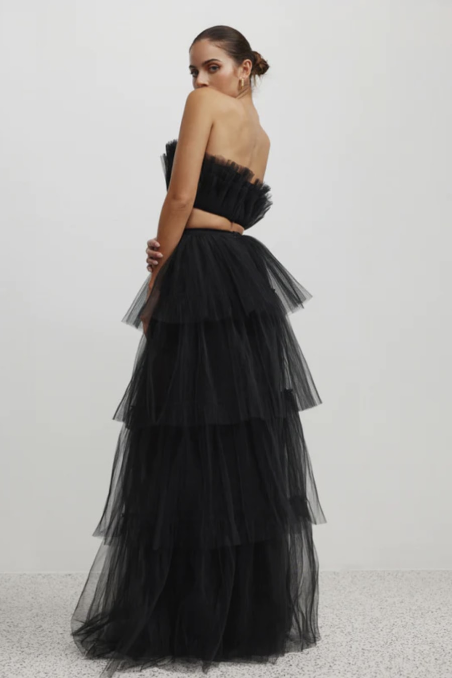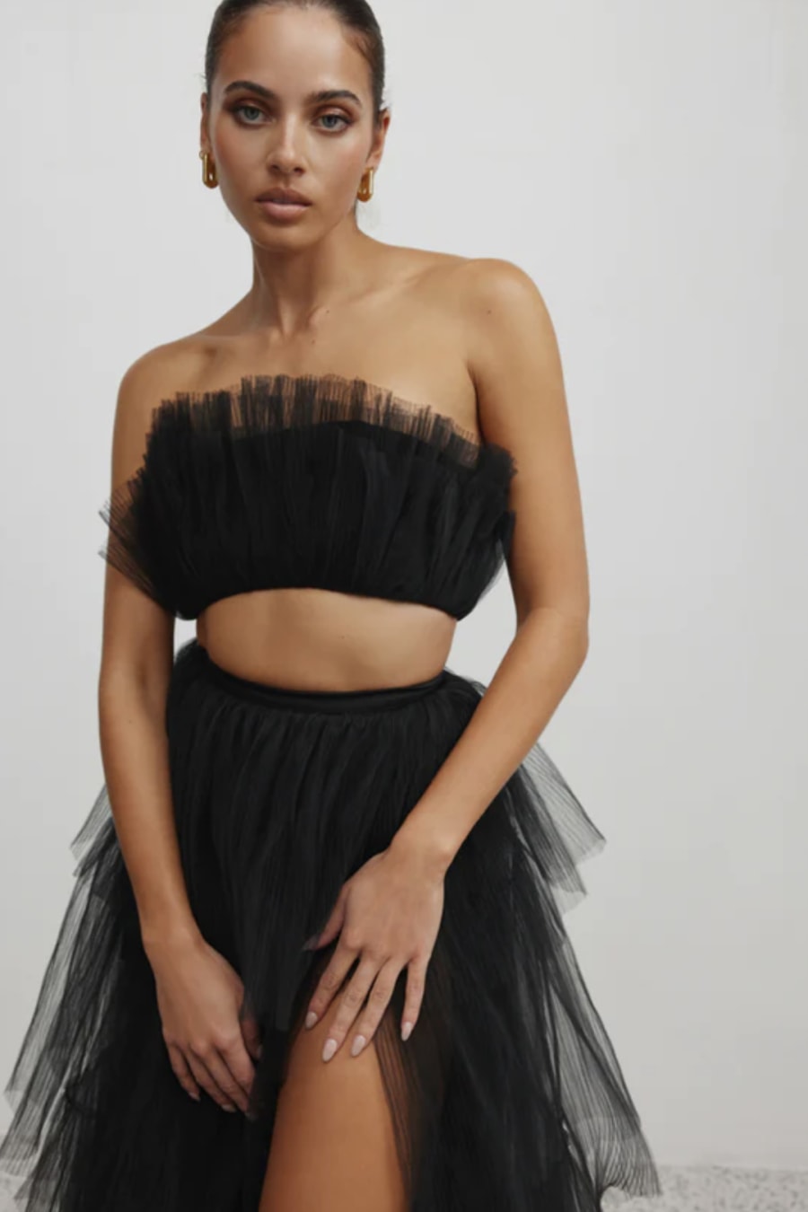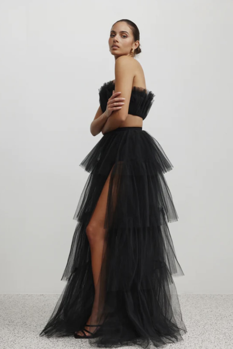 The Lorena Set is crafted from layers of tulle that have been pleated and gathered creating the most exquisite statement look. The skirt features four tiers of tulle and a dramatic, sexy, thigh high split on the left hand side. The skirt is inbuilt with a body suit, for ultimate comfort and practicality, and paired with a satin band to define the waist. The top and skirt both fasten at the back with zippers.